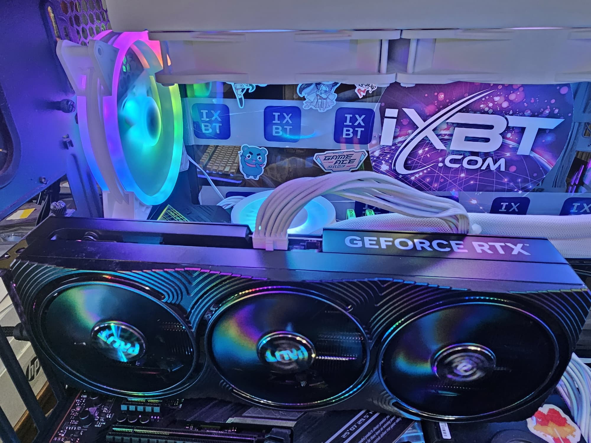 Palit GeForce RTX 4080 Super Infinity3 OC (16 ГБ) — своеобразный вариант топового ускорителя (формально это второй по производительности GPU в линейке GeForce RTX 40). Официально заявляется, что он создан для небольших ПК (SFF). И это действительно интересное направление, ведь совсем недавно такие карты имели огромные размеры и могли уместиться только в очень просторных системных блоках. Однако назвать протестированную модель по-настоящему компактной, конечно, невозможно, она лишь чуть менее громоздкая, чем типовые решения на том же GeForce RTX 4080 Super, и всё равно займет три слота в системном блоке. Так что выигрыш по толщине в 10-15 мм она обеспечивает, но в какой компактной системе вы сможете этим воспользоваться — большой вопрос. По сути, это просто GeForce RTX 4080 Super с более компактным кулером. Что ж, как минимум производителю такая карта обходится дешевле :)