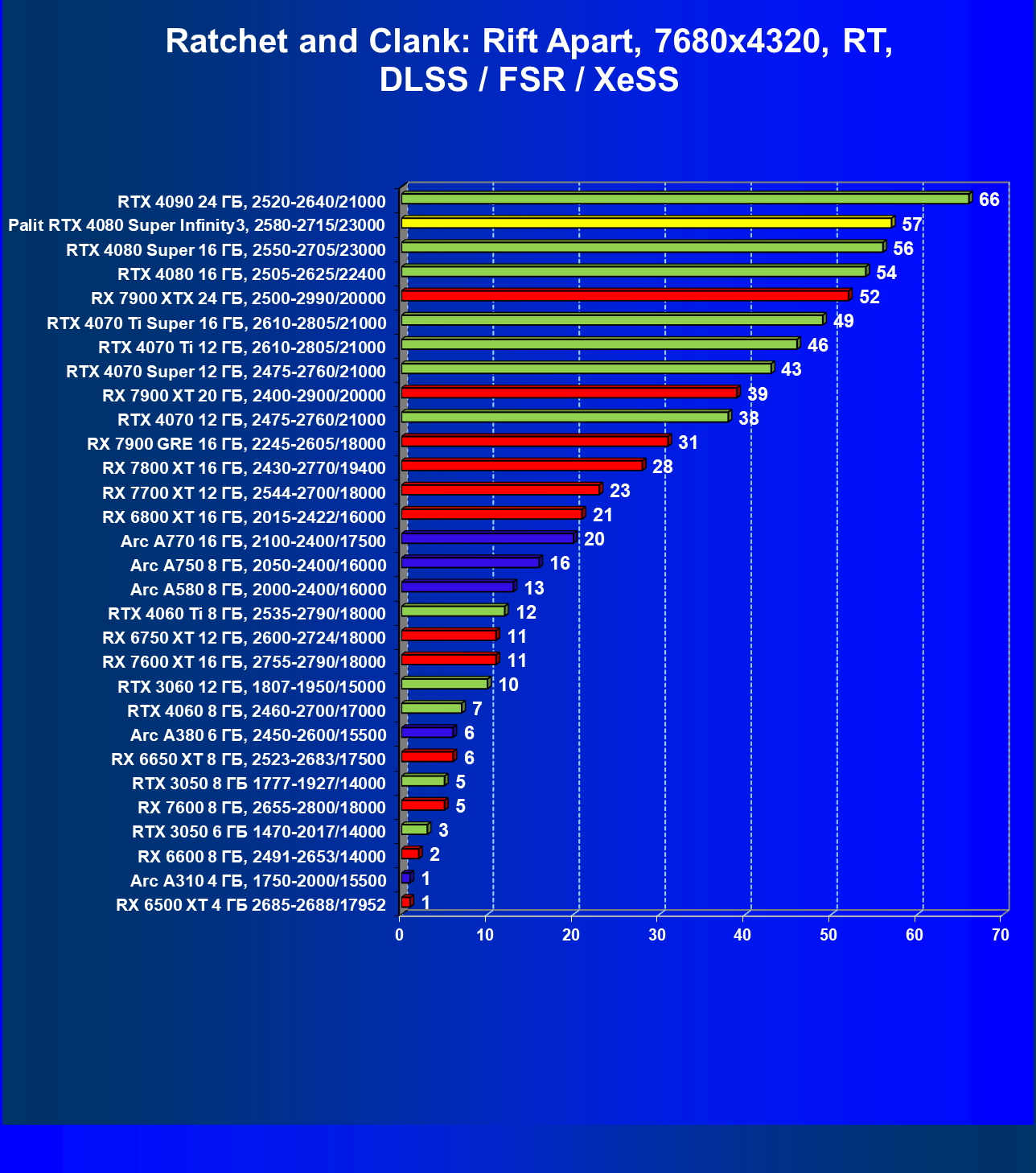 - Результаты тестов с включенной аппаратной трассировкой лучей и DLSS/FSR/XeSS в разрешении 7680×4320 (8К)
