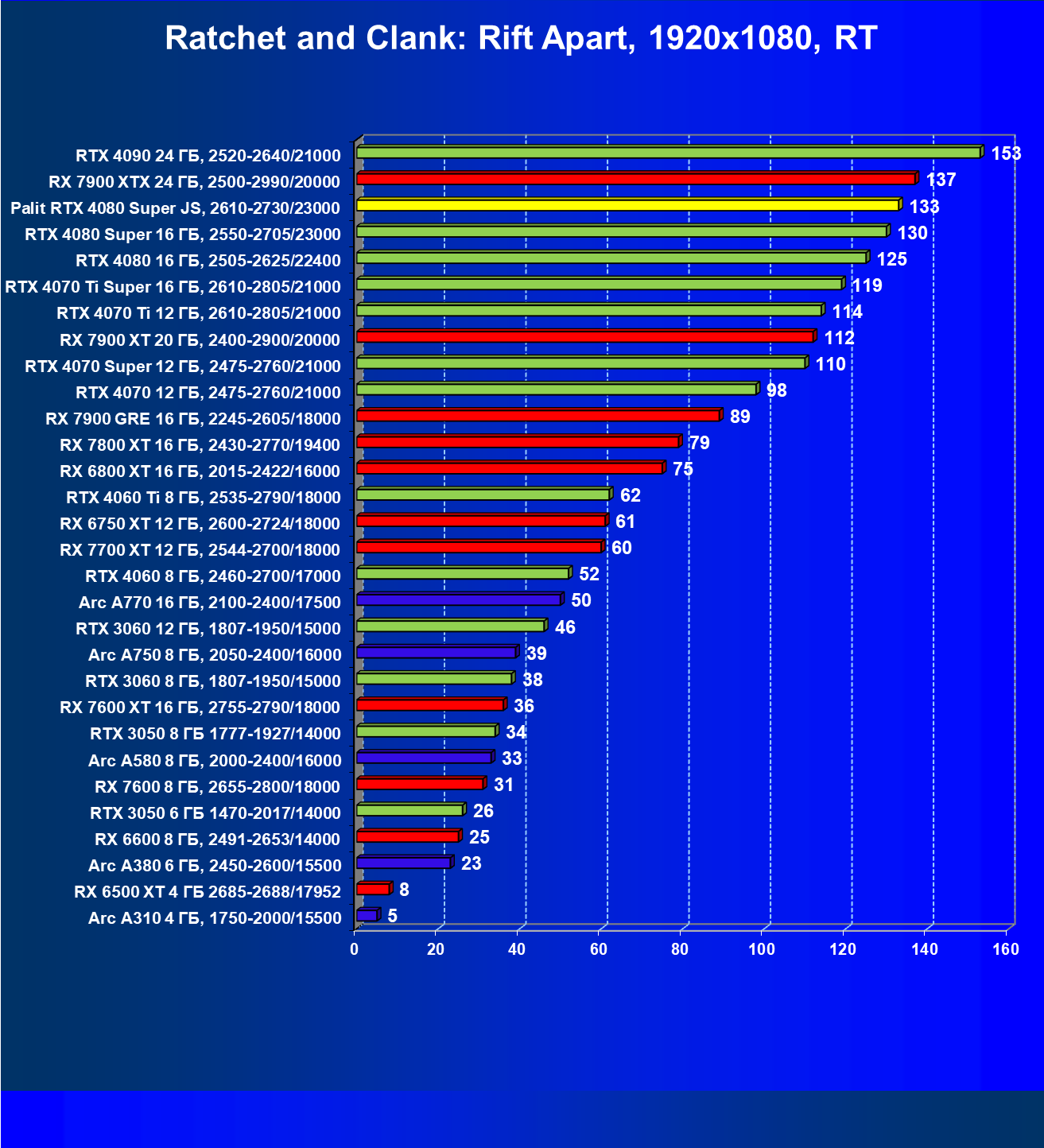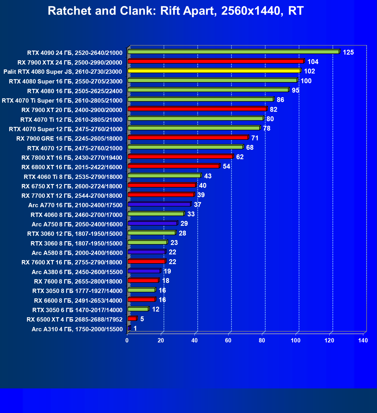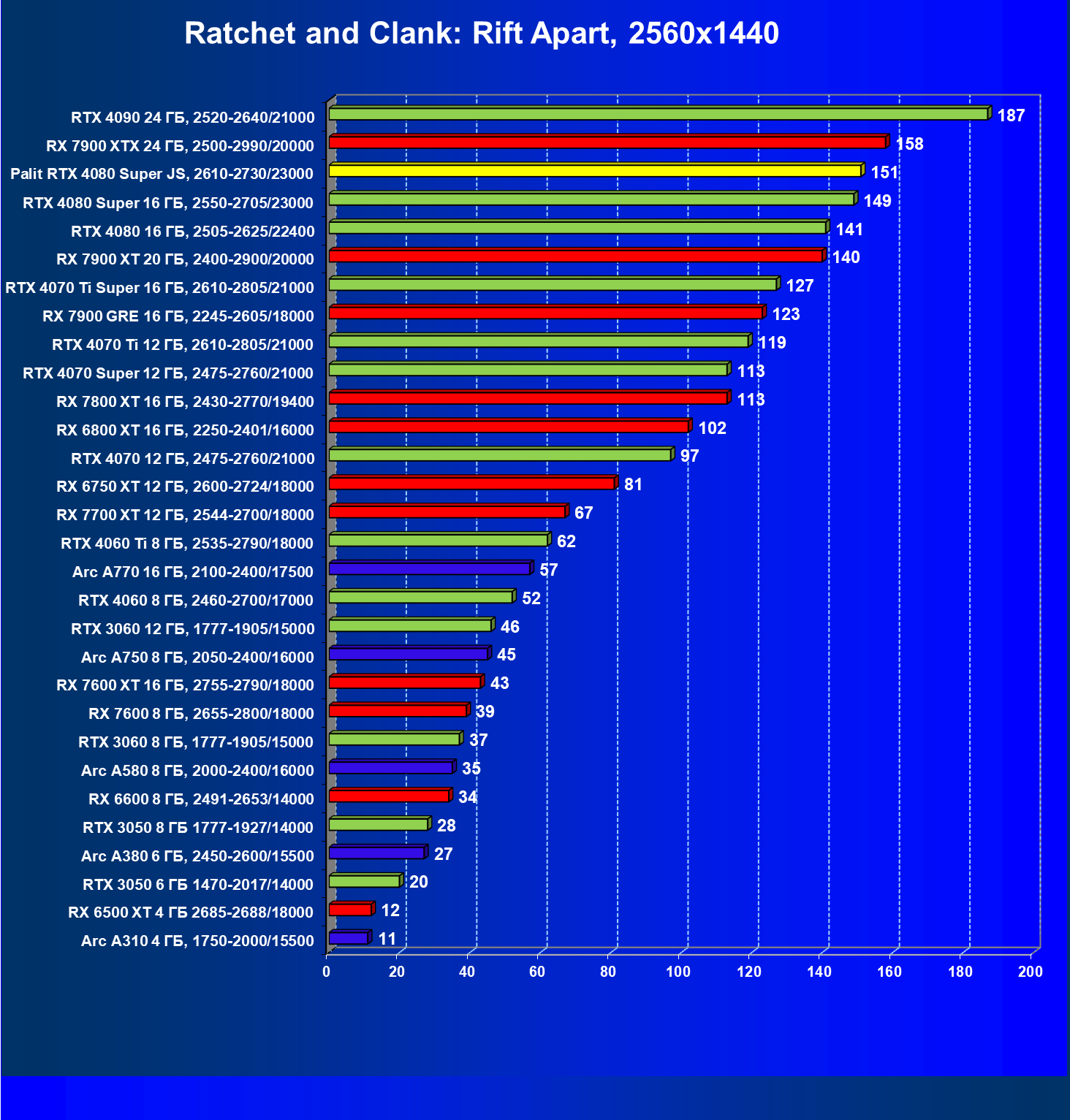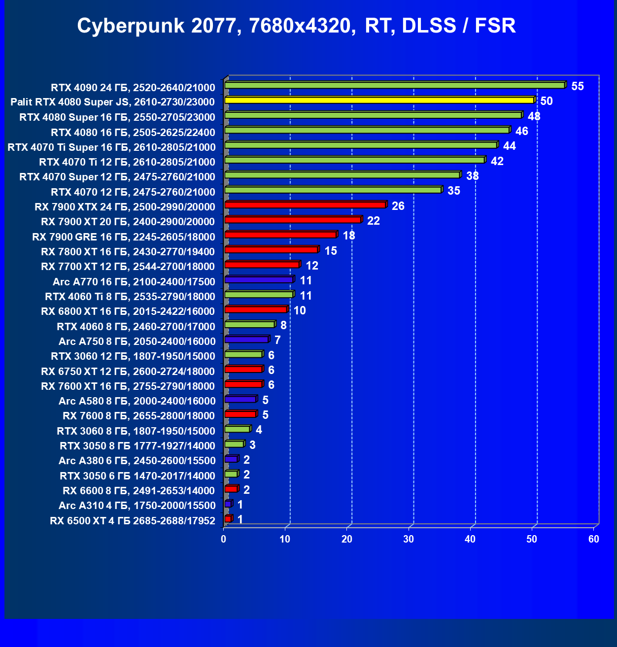 Да-да, у Radeon RX 7900 XT/XTX цены ниже (AMD вынуждена снижать, ибо иначе решения неконкурентоспособны), отсюда у них и рейтинг выше, но! Снова акцентируем внимание на том, что данном случае мы говорим о классических играх без трассировки лучей и технологий масштабирования, поэтому данный рейтинг для флагманского уровня решений как-то не показателен.
