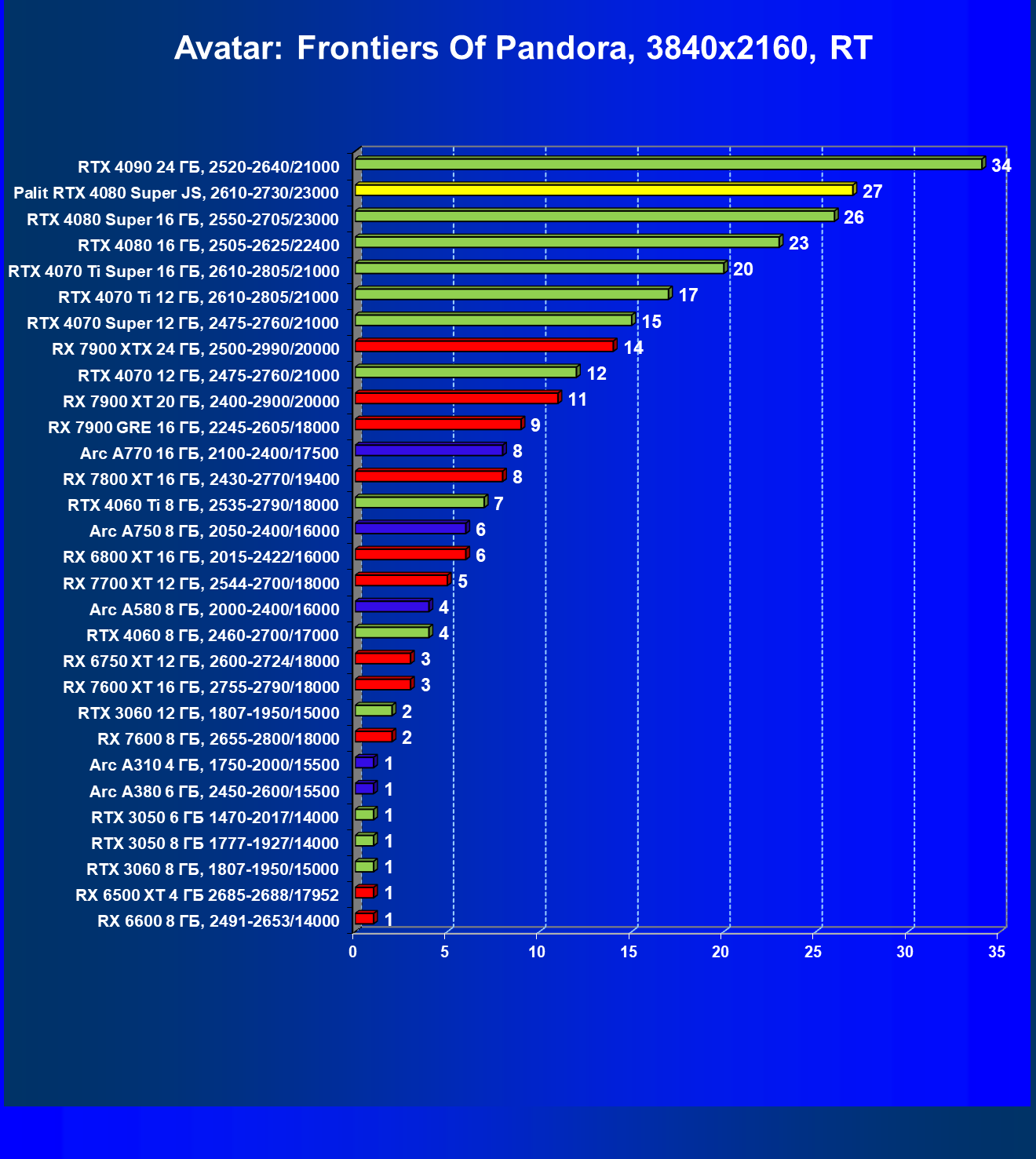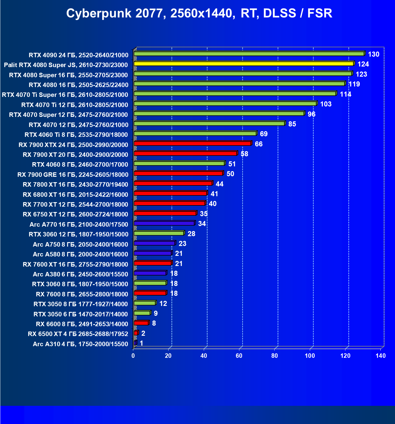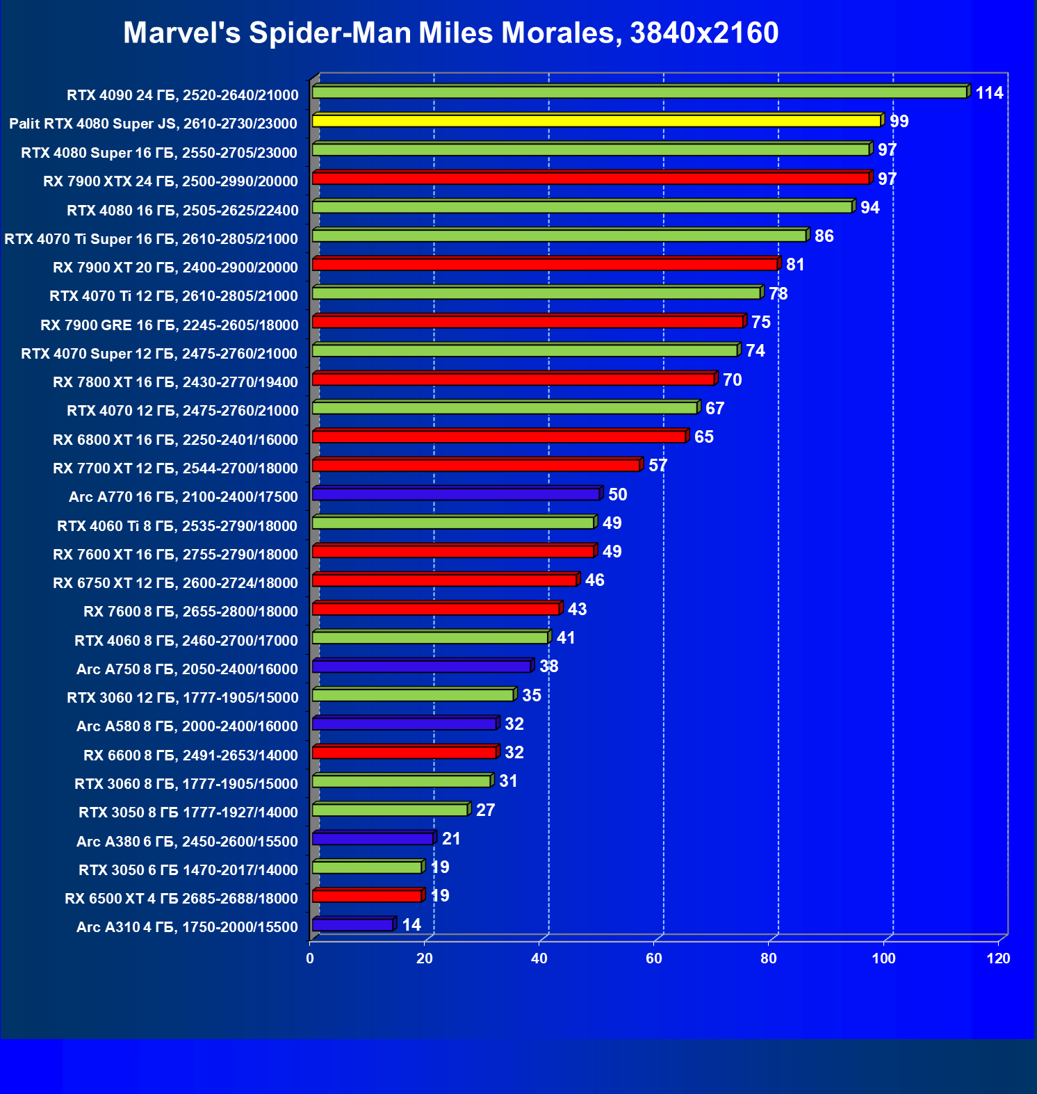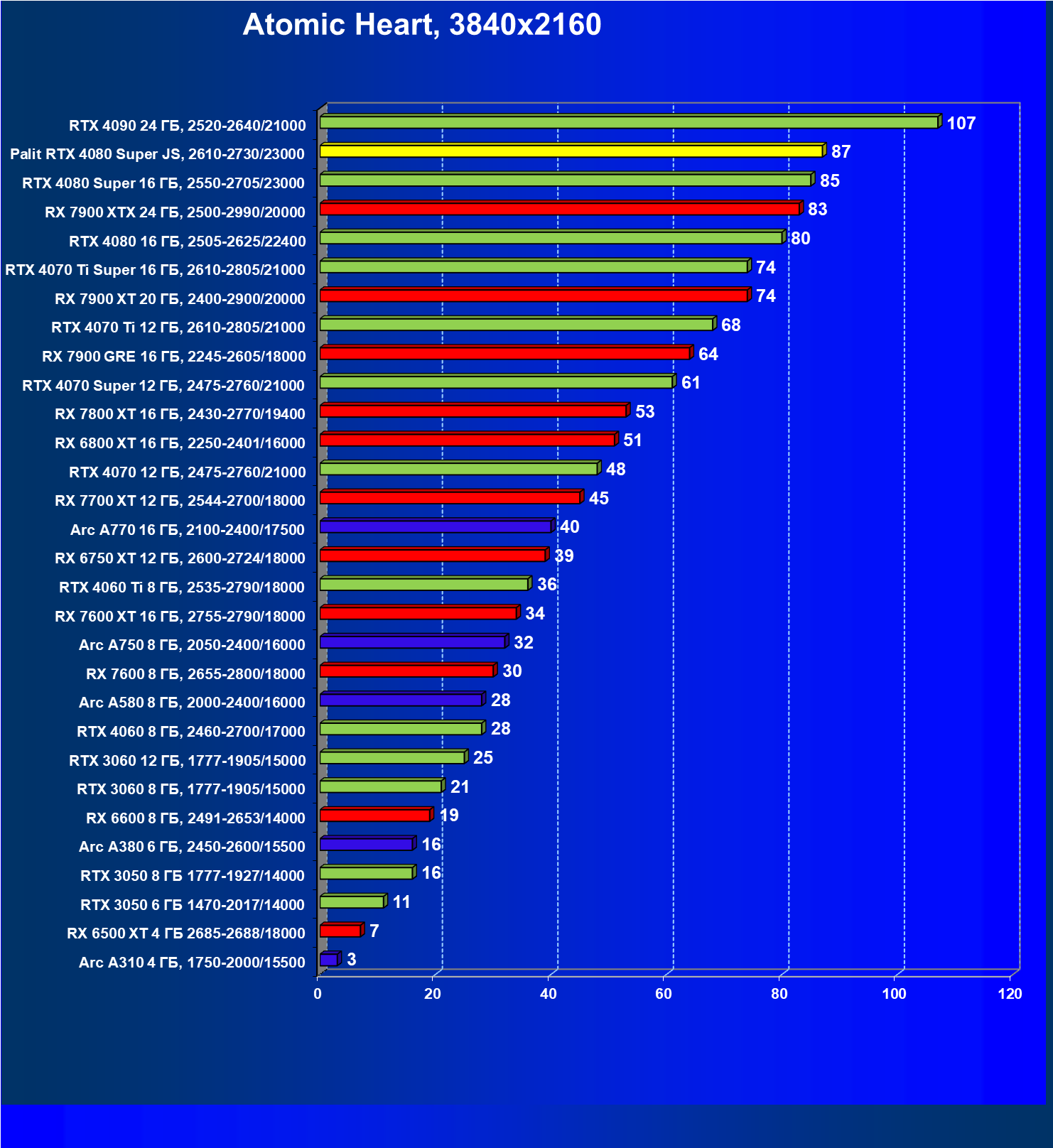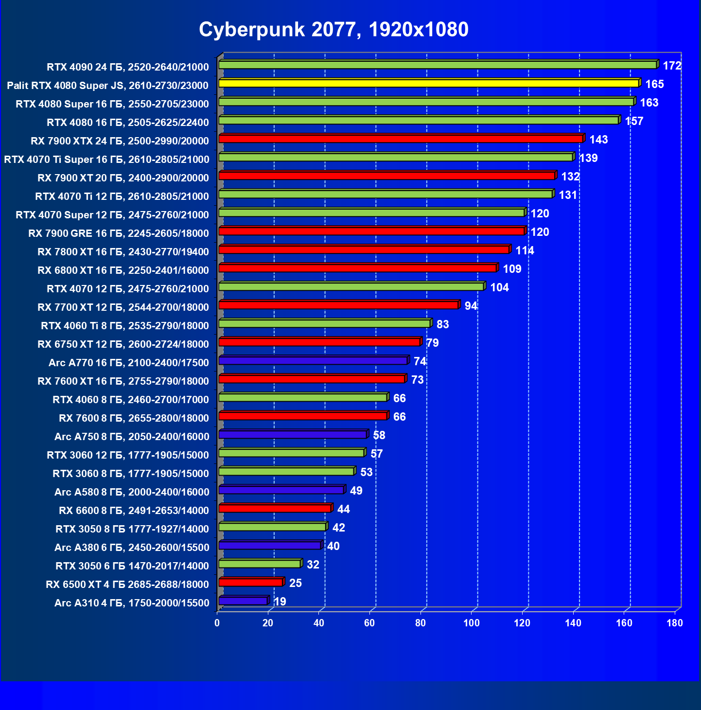 | 20 | Palit RTX 4080 Super JS, 2610—2730/23000 | 239 | 2864 | 120 000 |