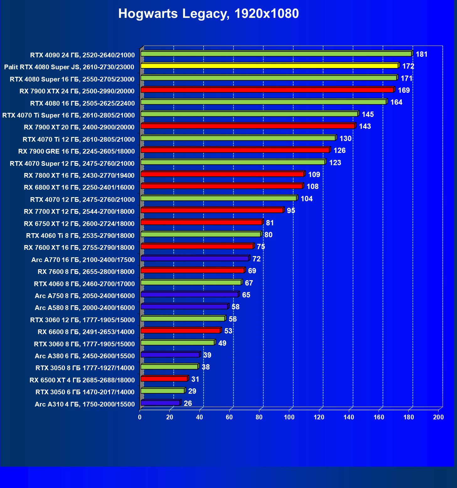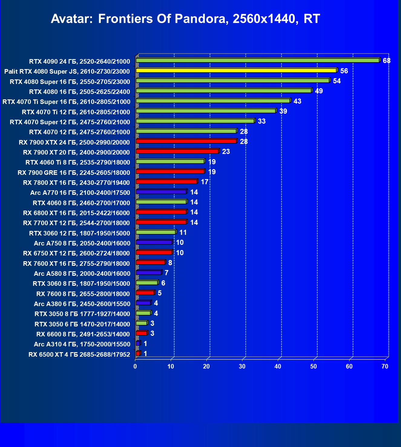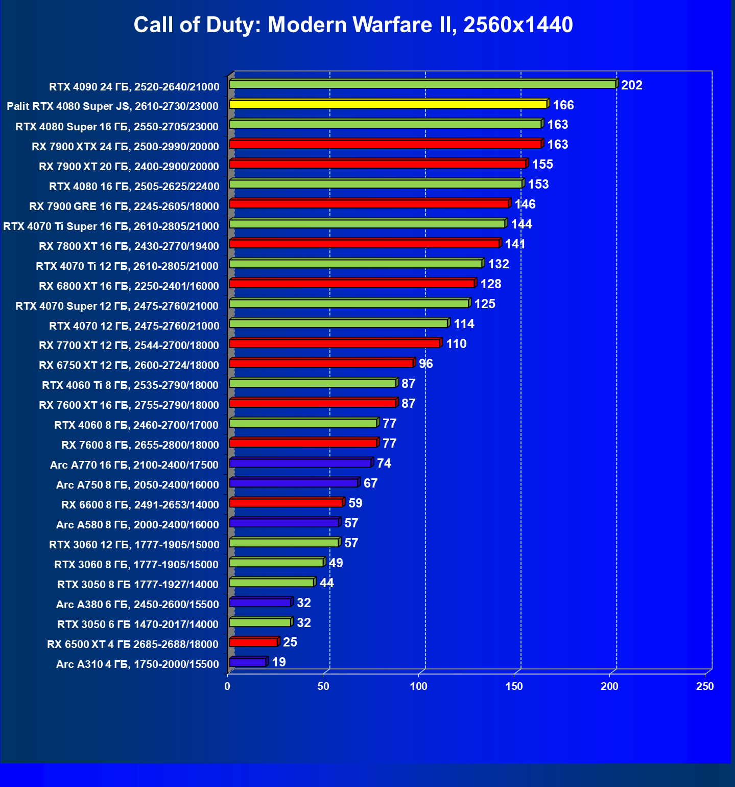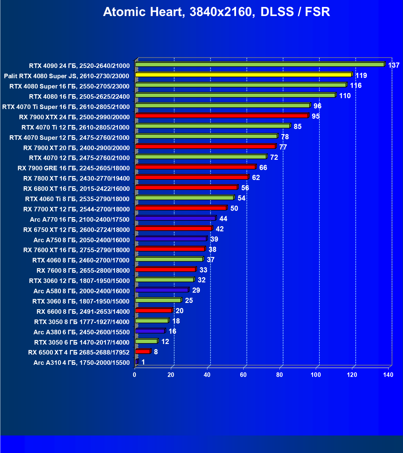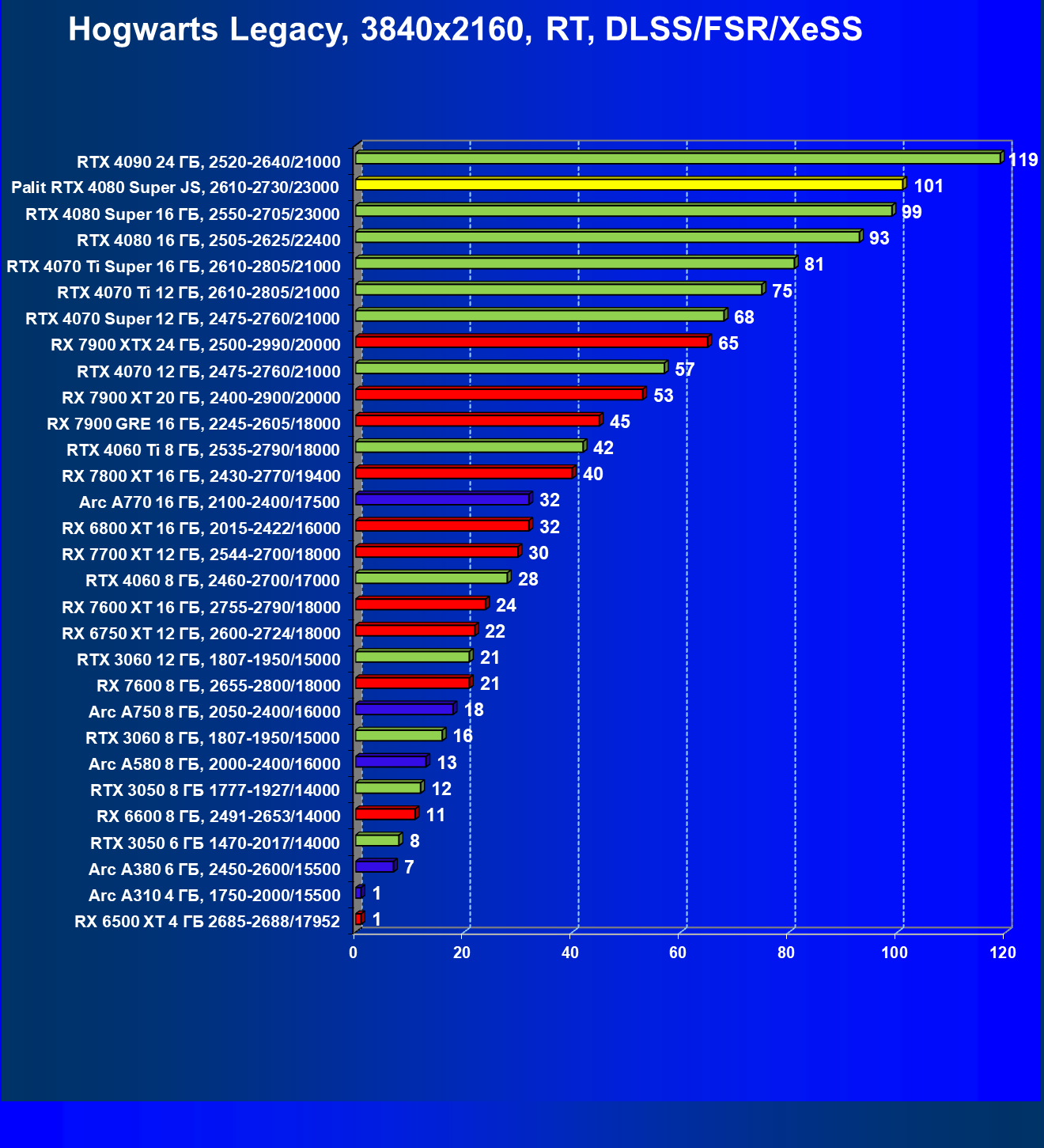 | 20 | Palit RTX 4080 Super JS, 2610—2730/23000 | 239 | 2864 | 120 000 |