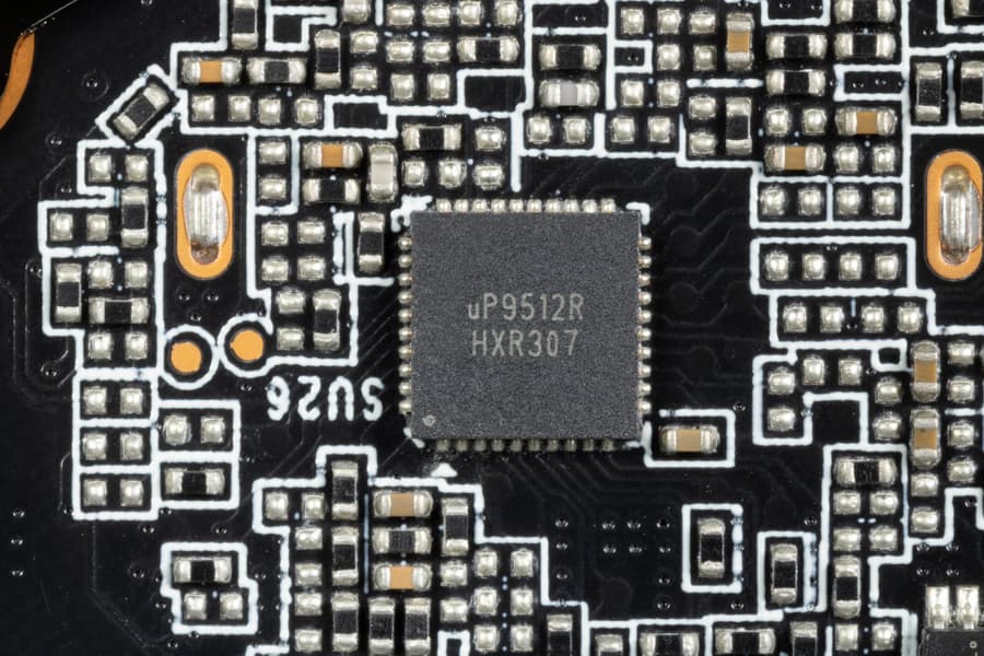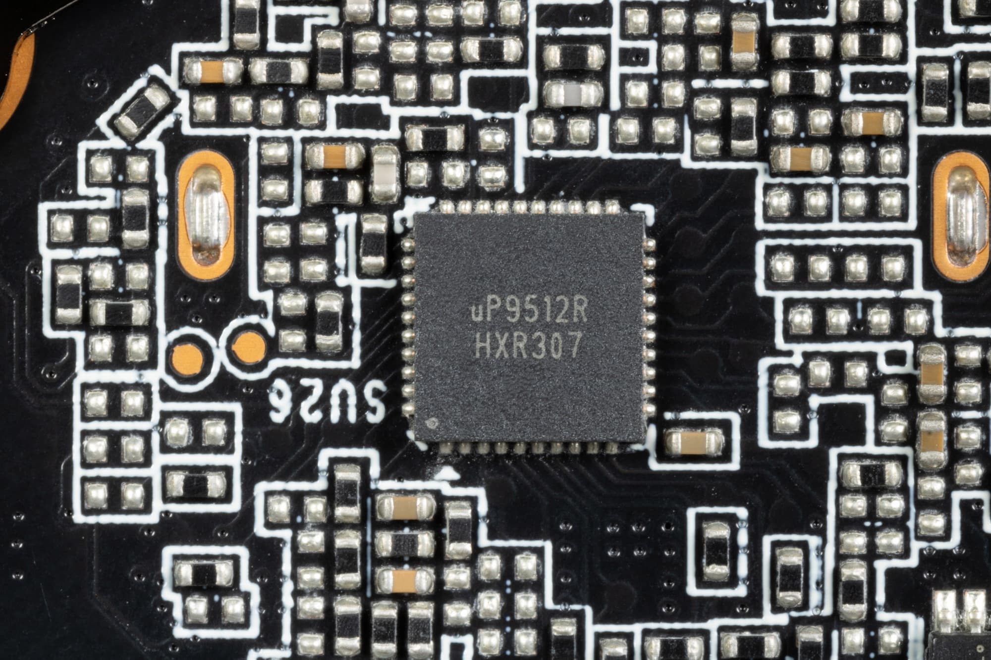12 фазами питания ядра управляет ШИМ-контроллер uP9512R (uPI Semiconductor).