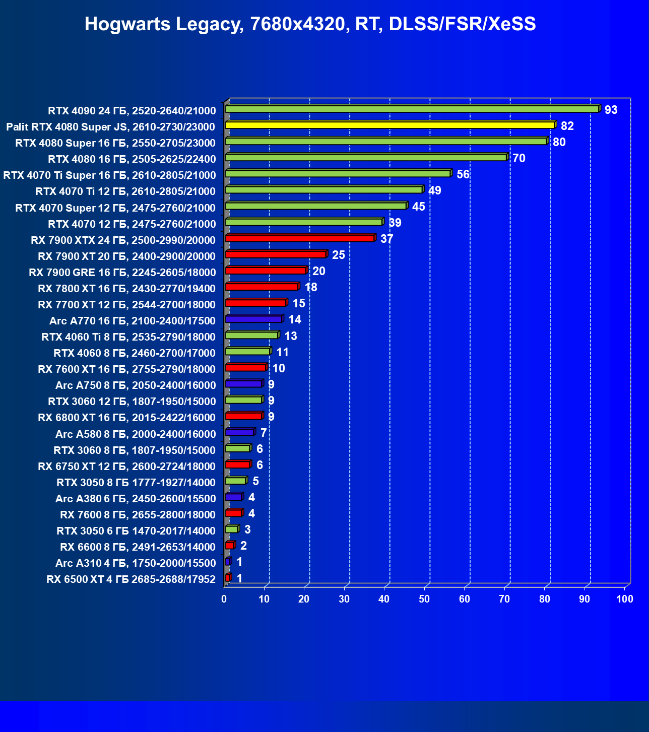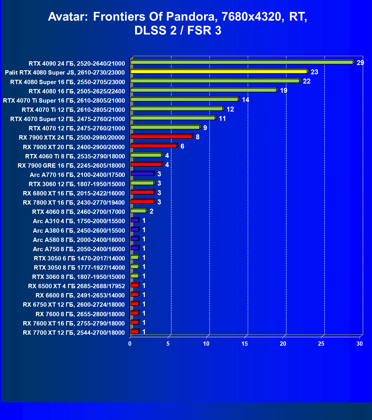 Результаты тестов с включенной аппаратной трассировкой лучей и DLSS/FSR/XeSS в разрешении 7680×4320 (8К)