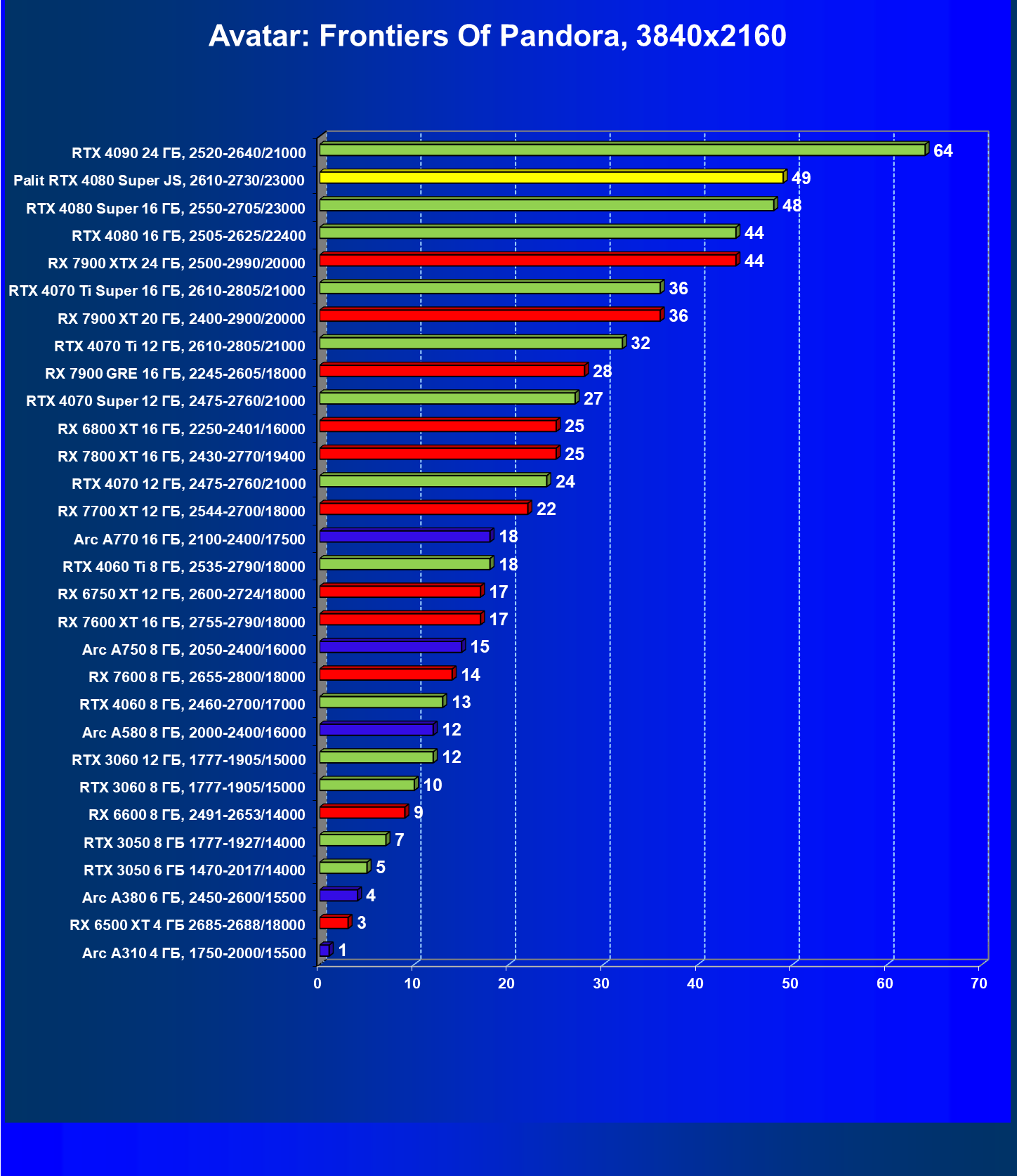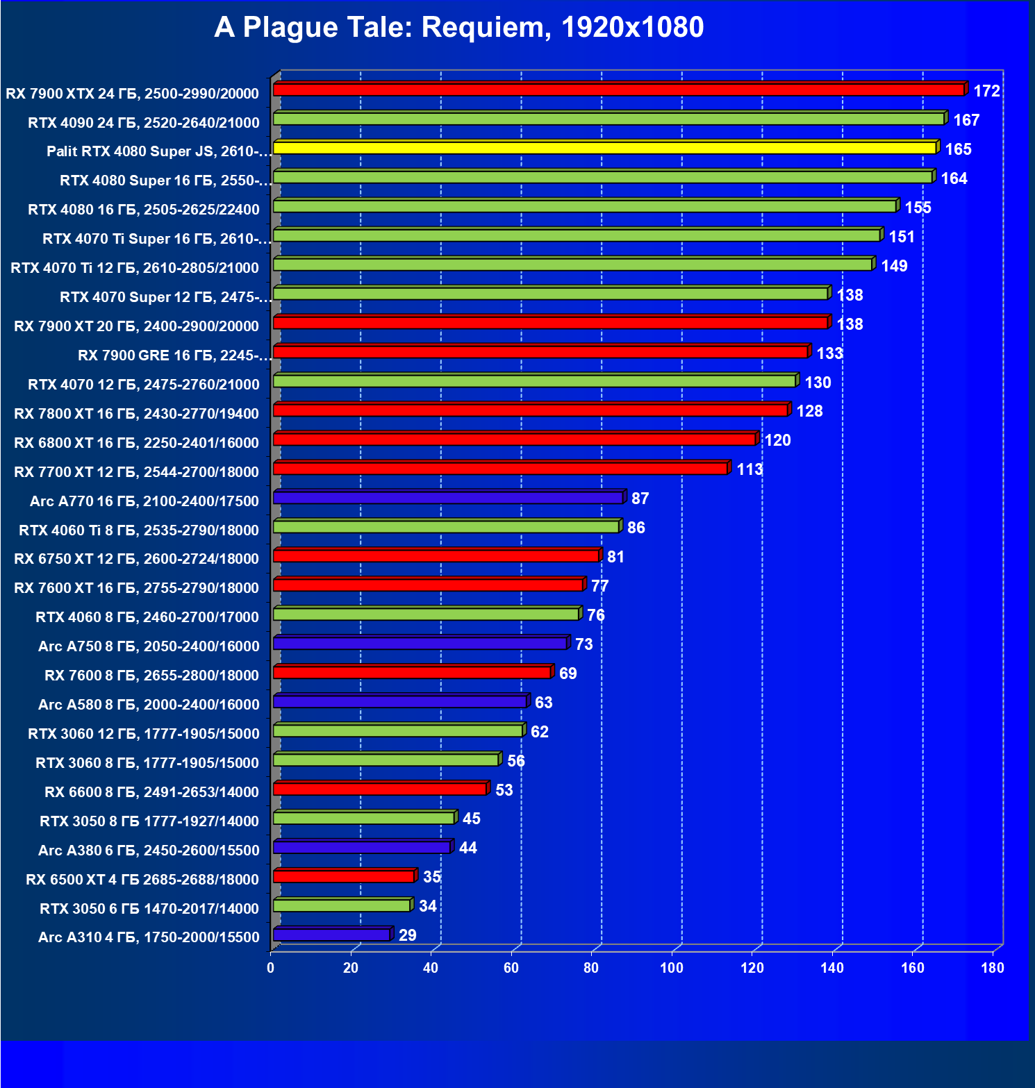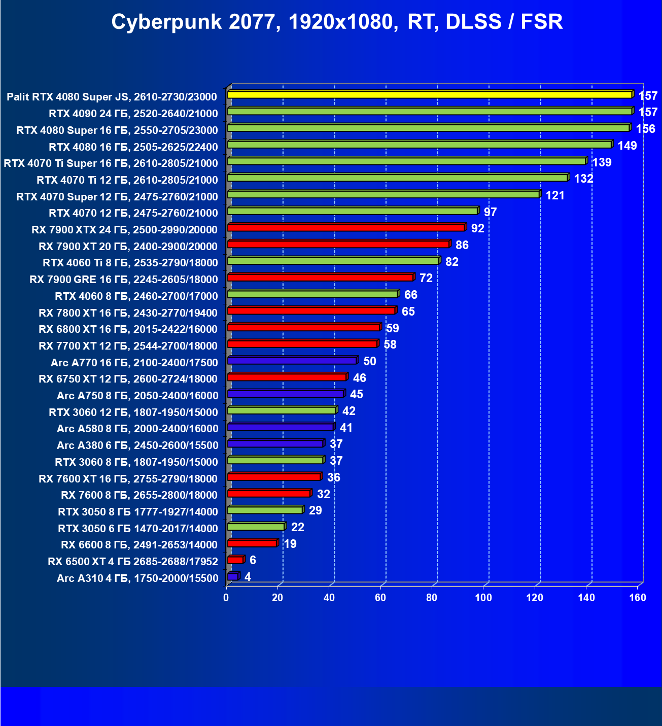 Ранее мы уже видели, что в классических играх RTX 4080 Super и RX 7900 XTX выдают практически идентичную производительность (карта Palit лишь чуть-чуть быстрее засчет фабричного разгона). Особо отметим, что здесь мы говорим про игры без использования RT и технологий масштабирования (при этом как-то странно покупать сегодня за большие деньги флагманский ускоритель и не использовать все возможности современных игр).