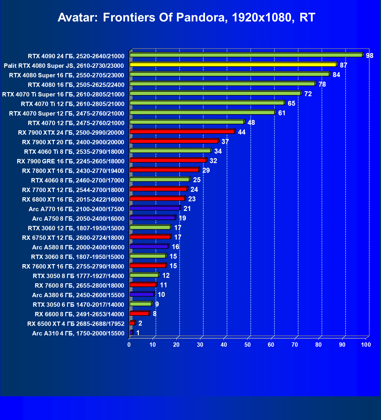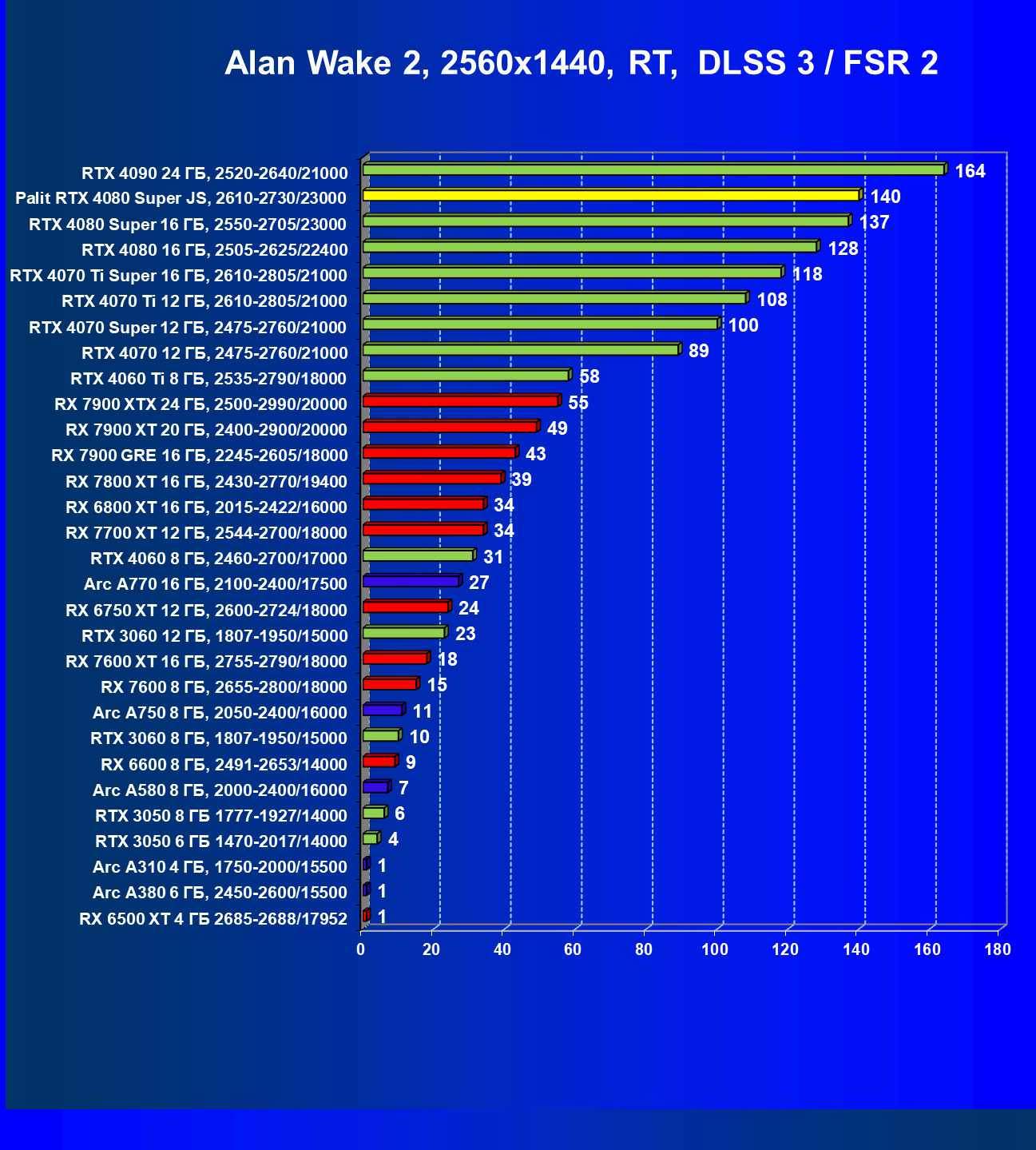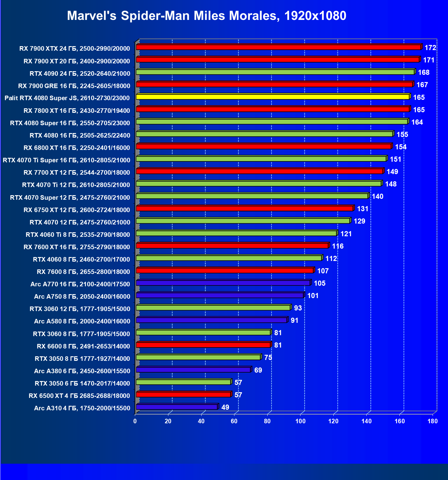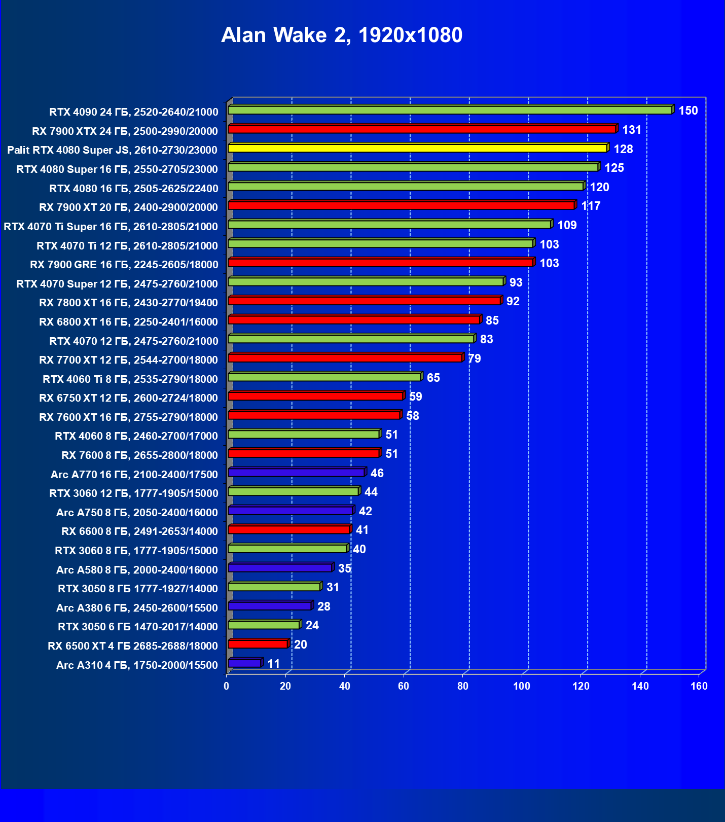 Ранее мы уже видели, что в классических играх RTX 4080 Super и RX 7900 XTX выдают практически идентичную производительность (карта Palit лишь чуть-чуть быстрее засчет фабричного разгона). Особо отметим, что здесь мы говорим про игры без использования RT и технологий масштабирования (при этом как-то странно покупать сегодня за большие деньги флагманский ускоритель и не использовать все возможности современных игр).