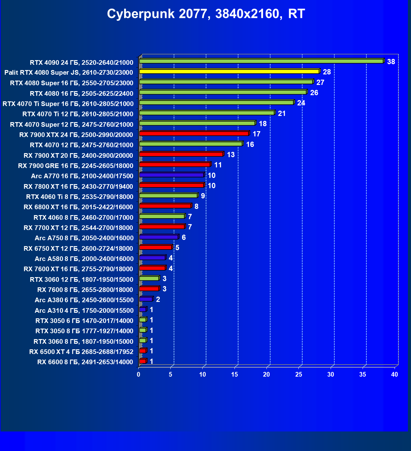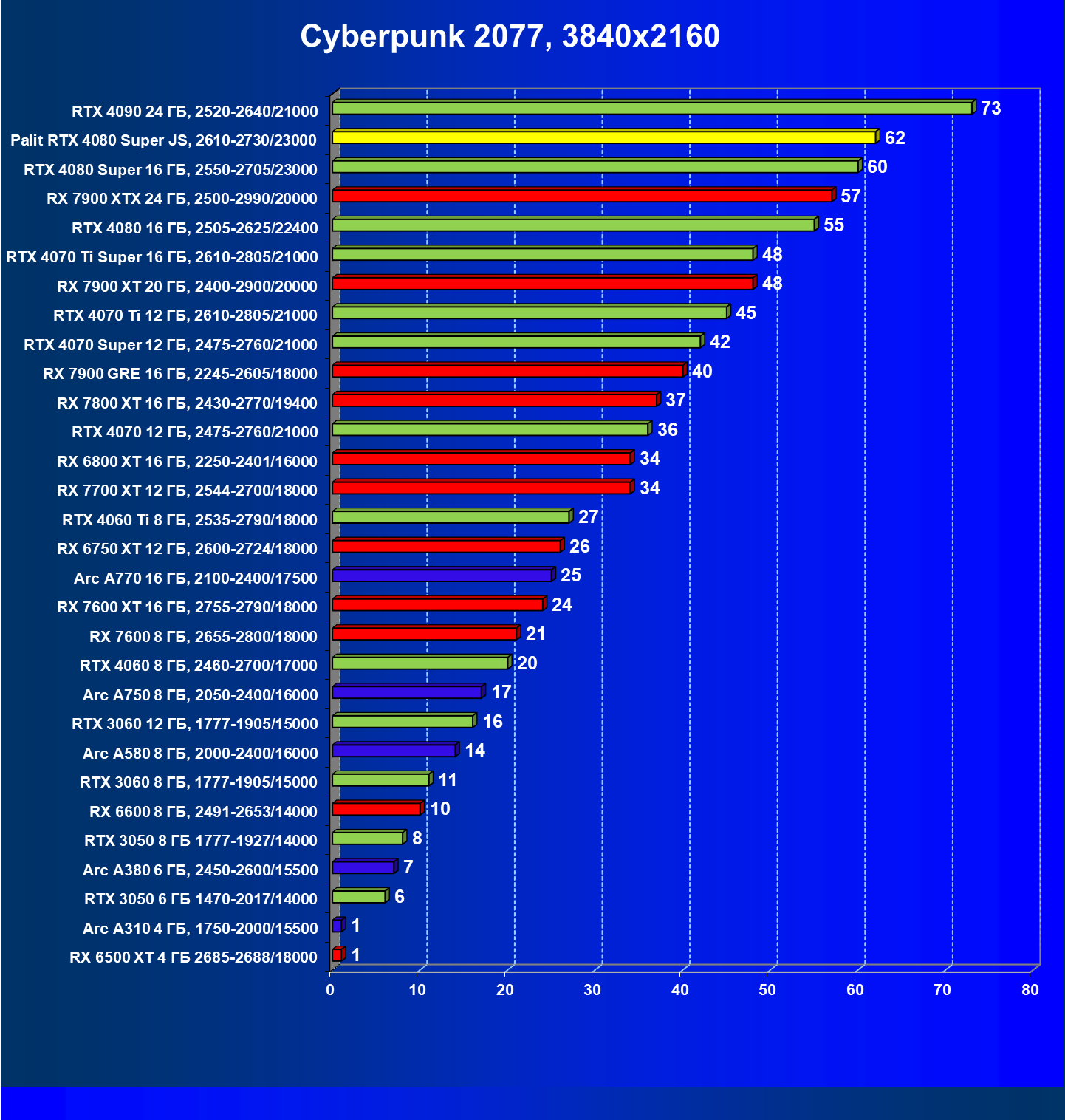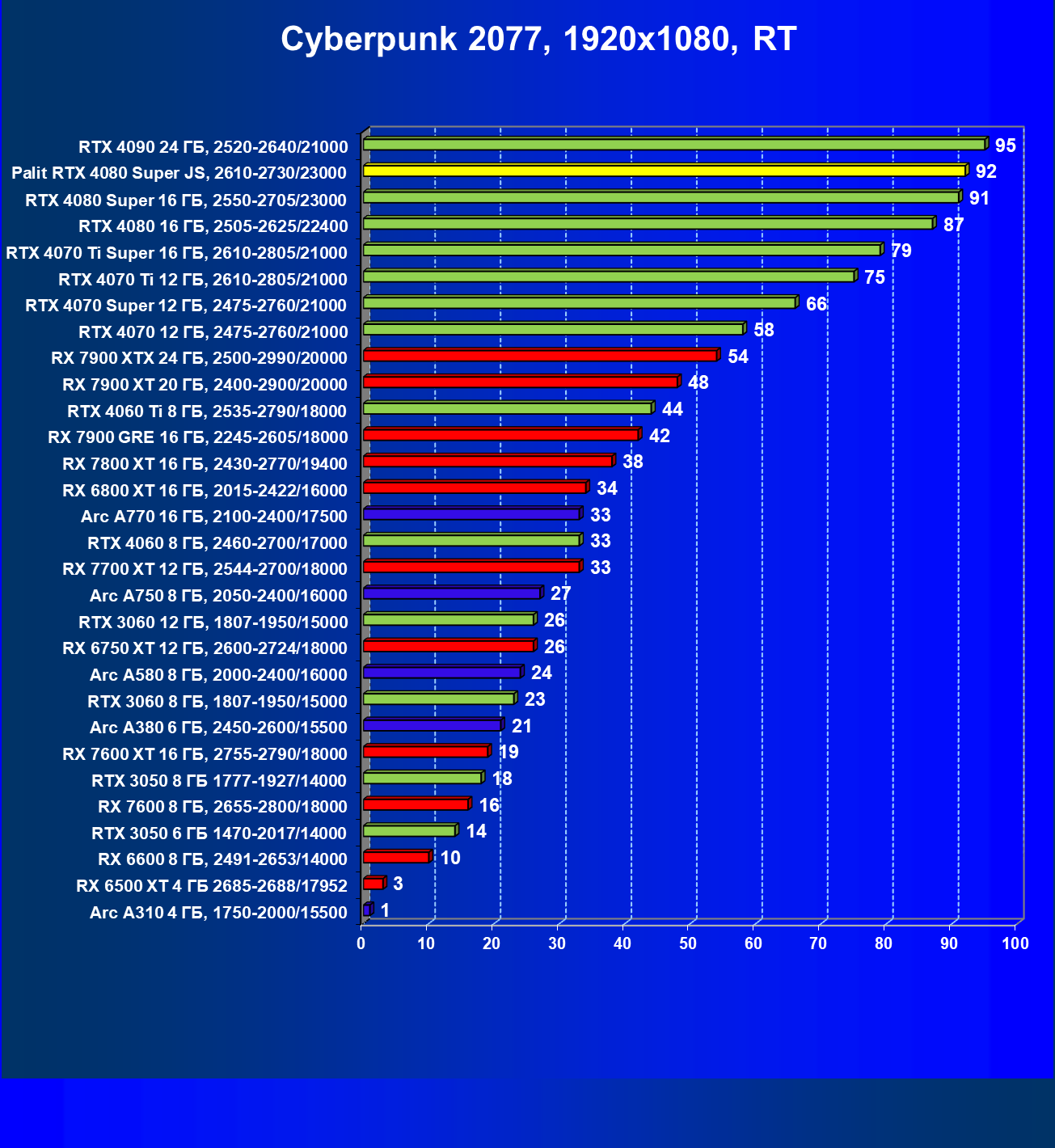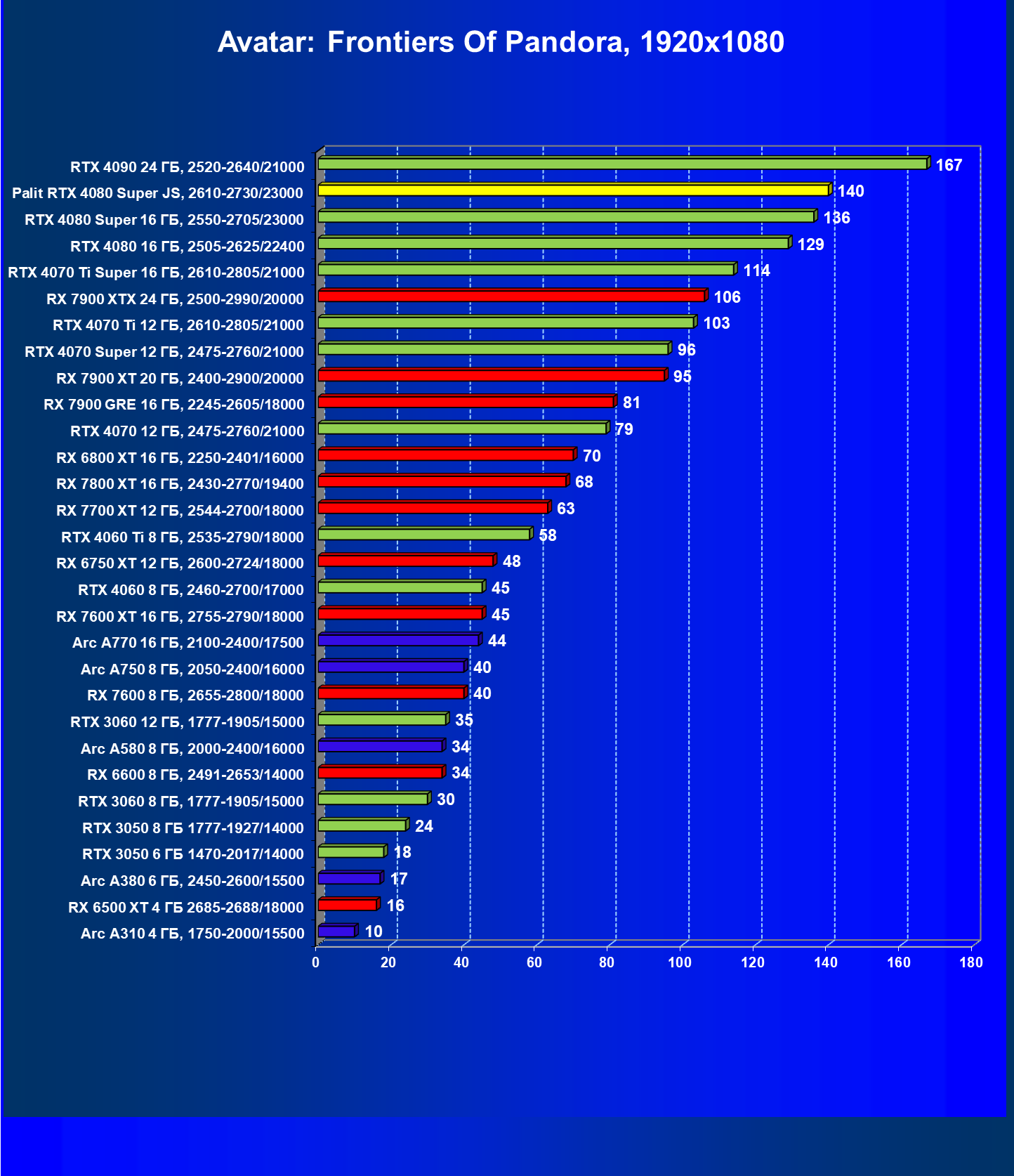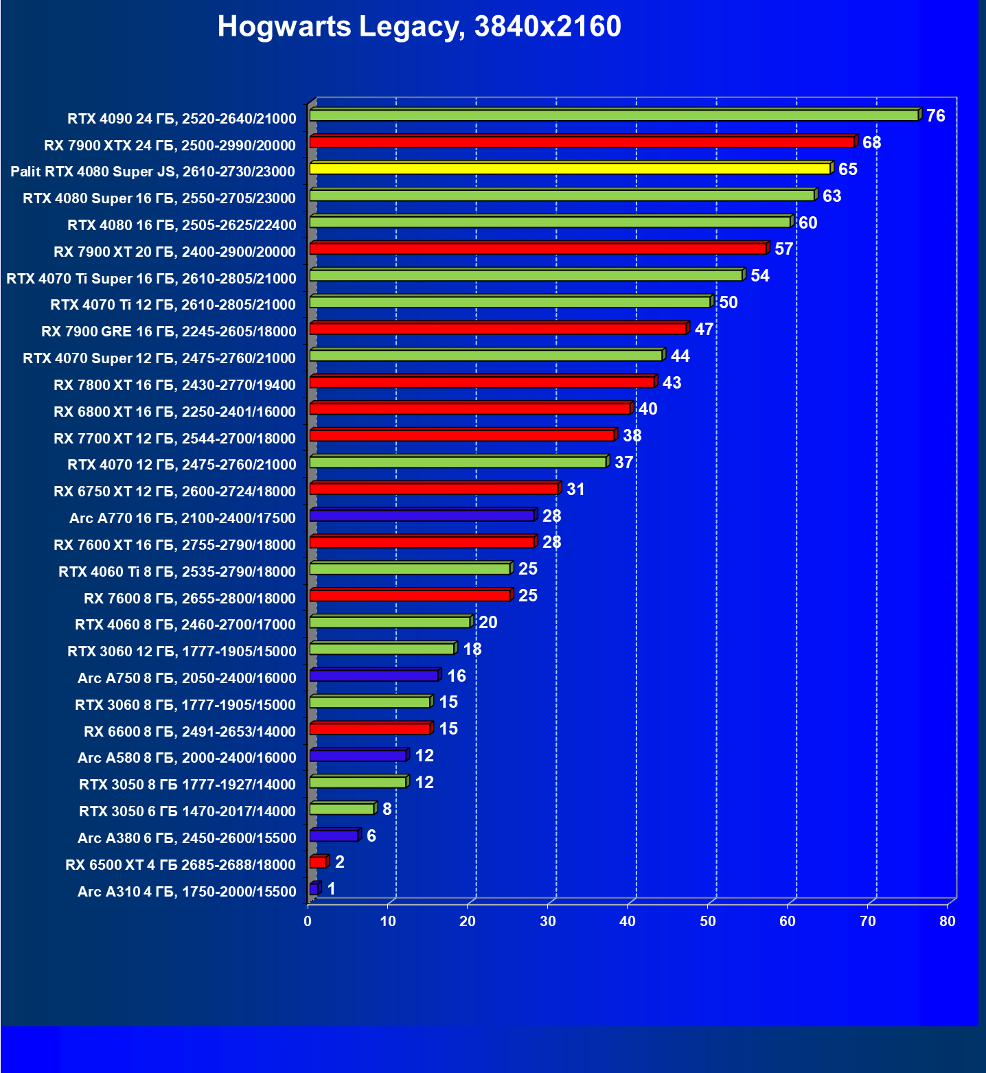| 02 | Palit RTX 4080 Super JS, 2610—2730/23000 | 2864 | 239 | 120 000 |