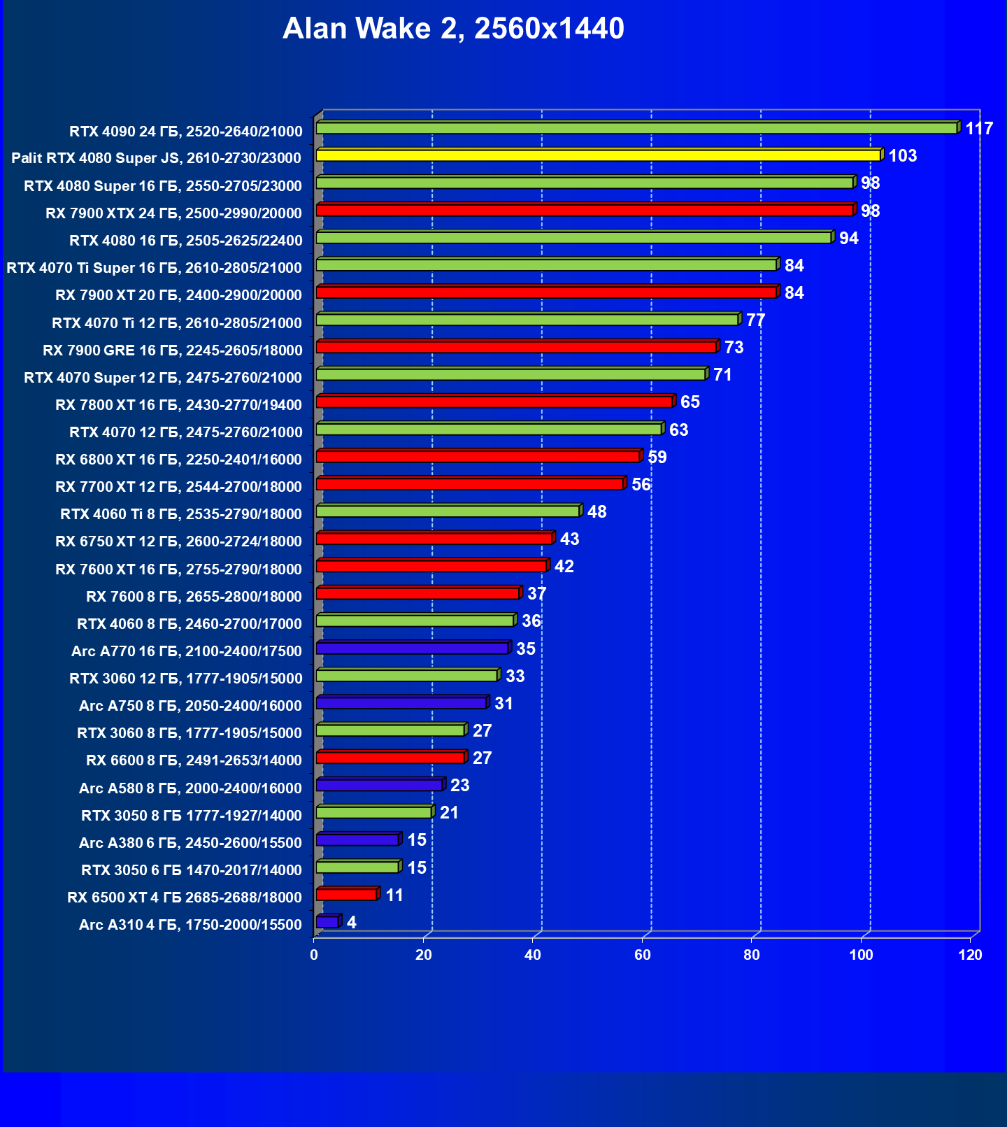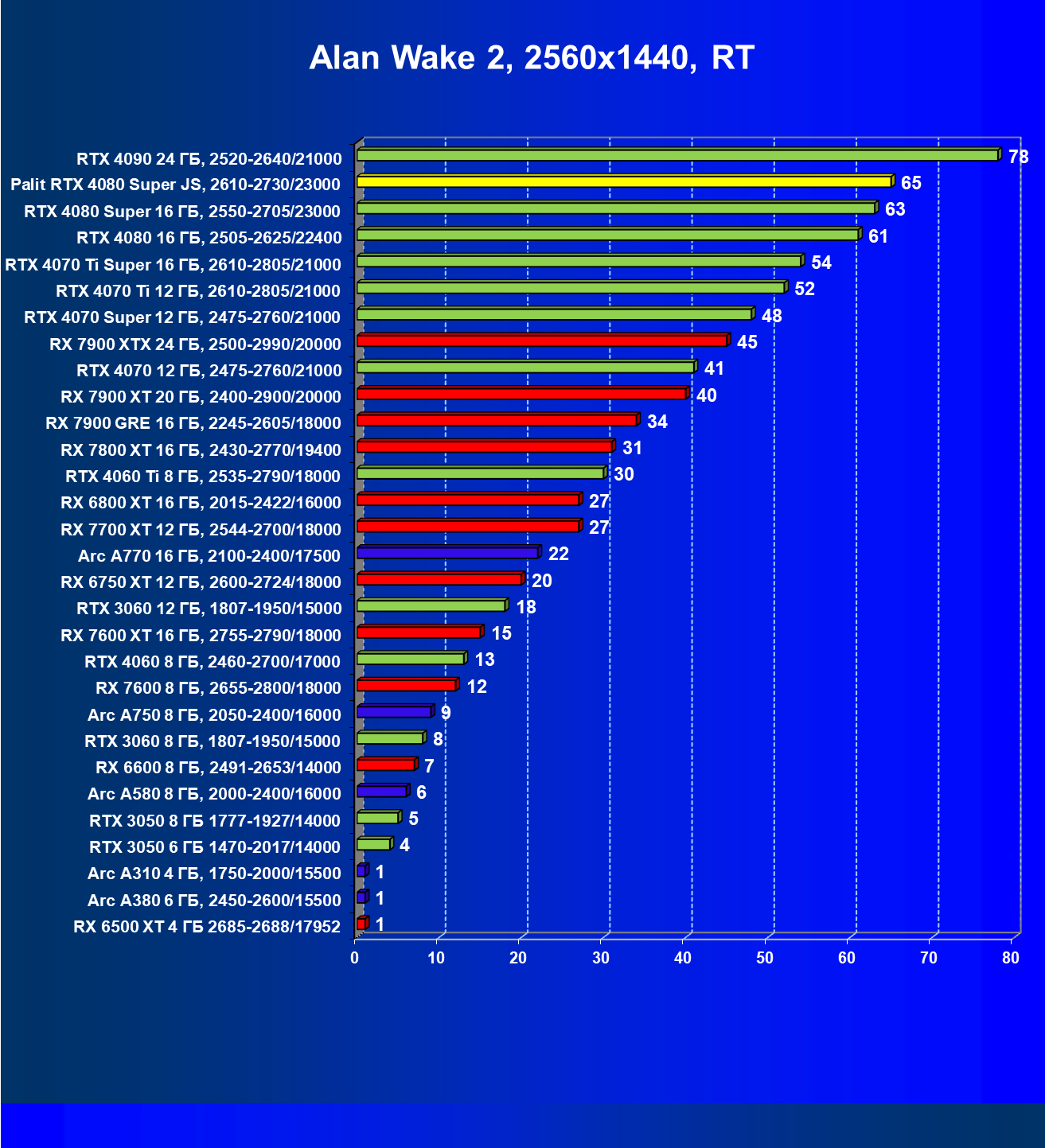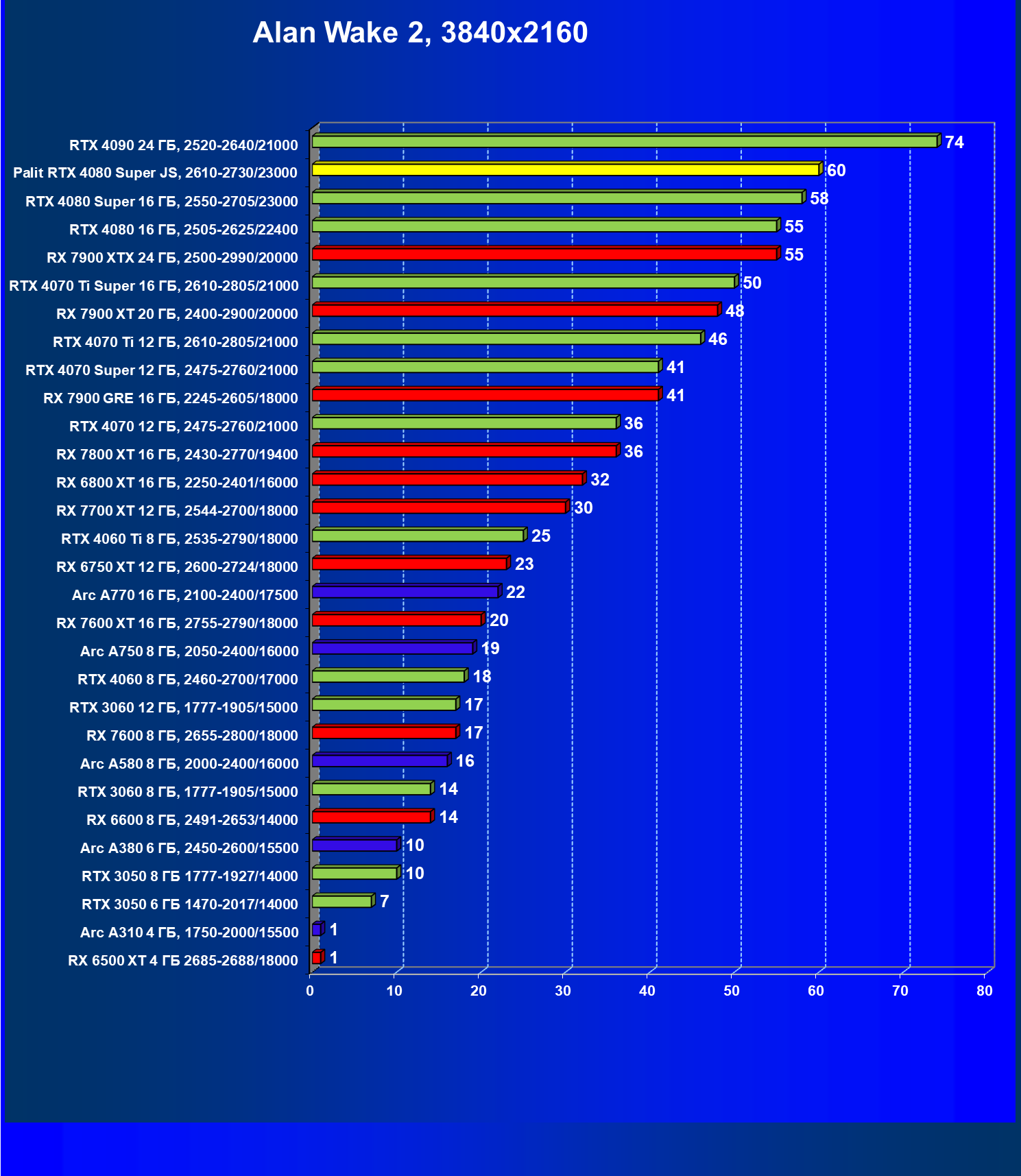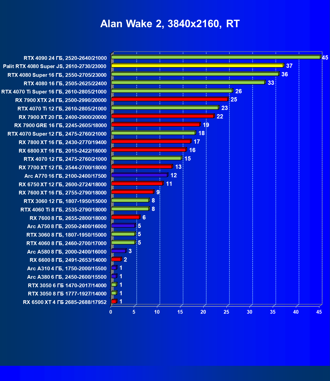 | 02 | Palit RTX 4080 Super JS, 2610—2730/23000 | 2864 | 239 | 120 000 |