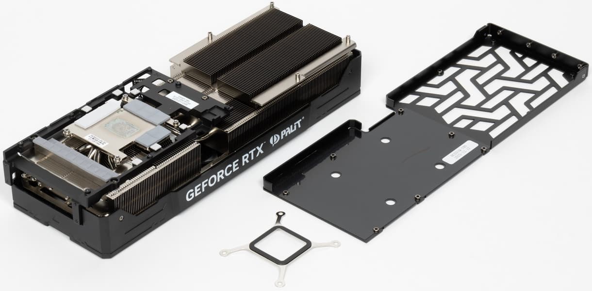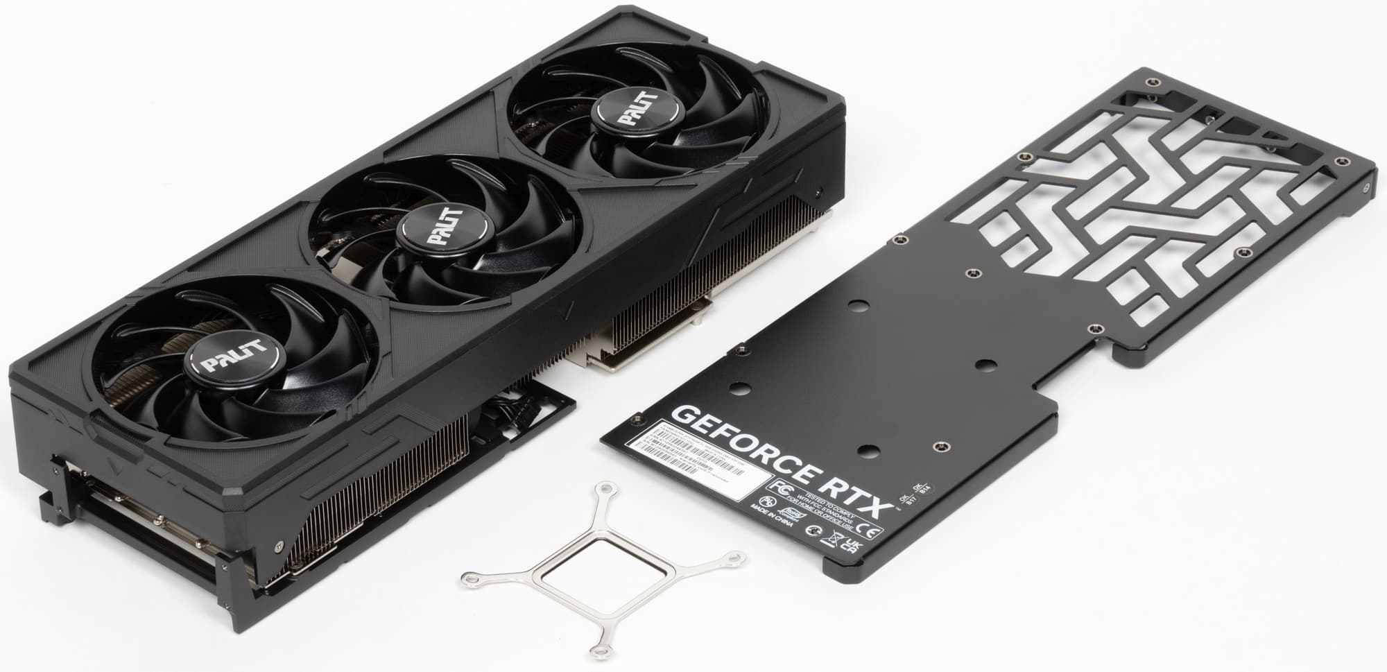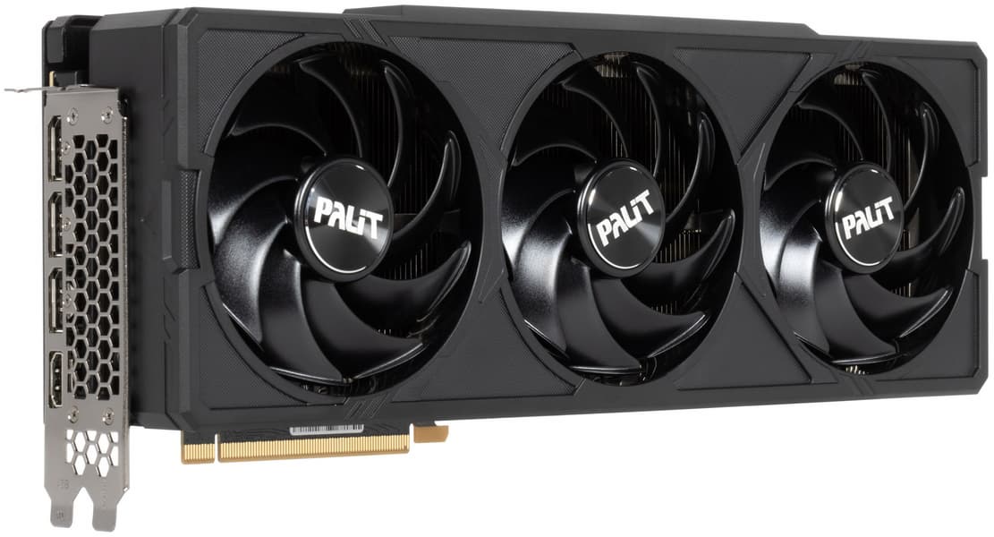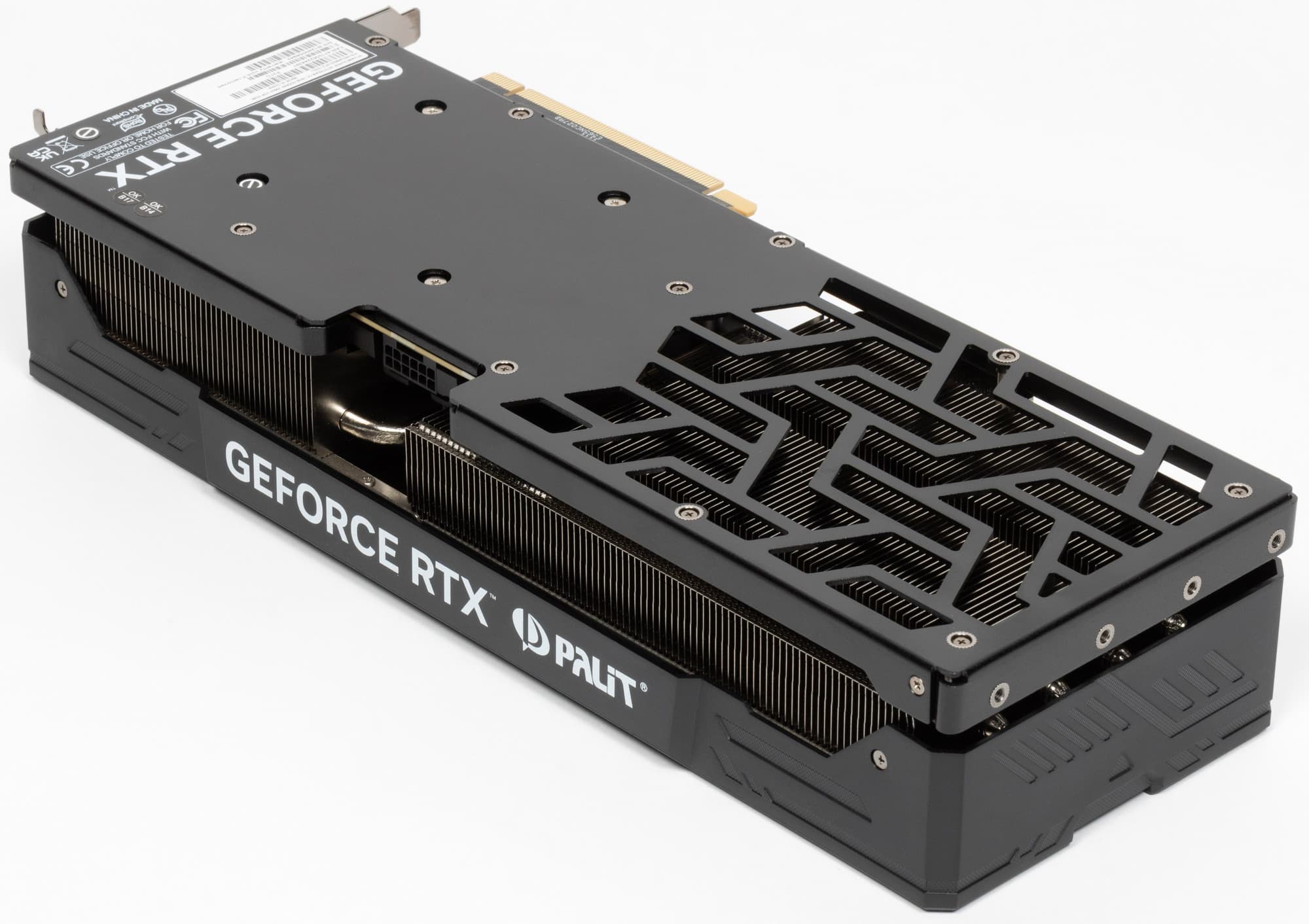 Карта Palit способна потреблять до 300 Вт. Система охлаждения мощная и эффективная, но все-таки не тихая. Габариты этой модели составляют 33 см в длину и 13 см в высоту, а по толщине видеокарта занимает 4 слота в корпусе. Набор видеовыходов стандартный: 3 DP 1.4a и 1 HDMI 2.1.