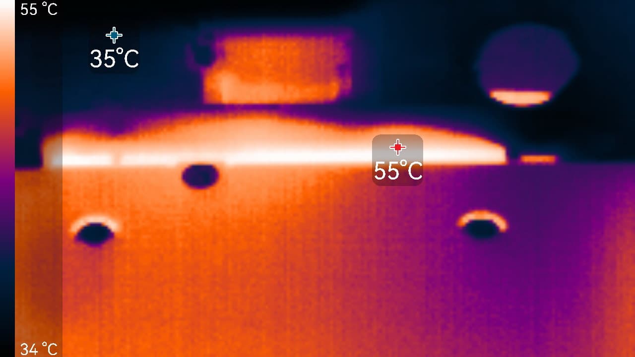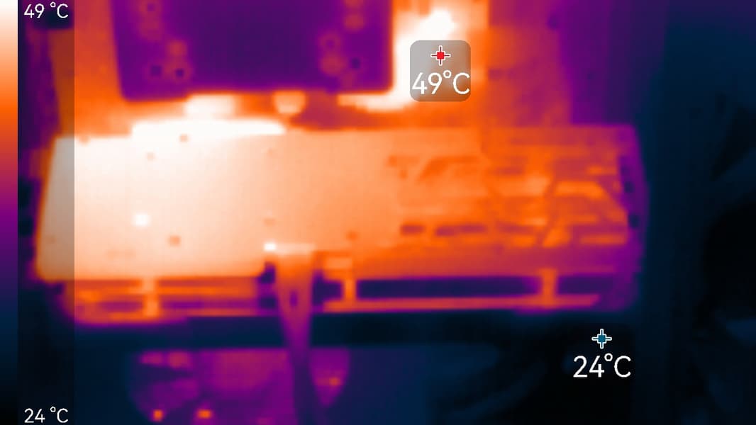 Максимальный нагрев наблюдался в центральной части PCB и у разъемов PCIe и питания.