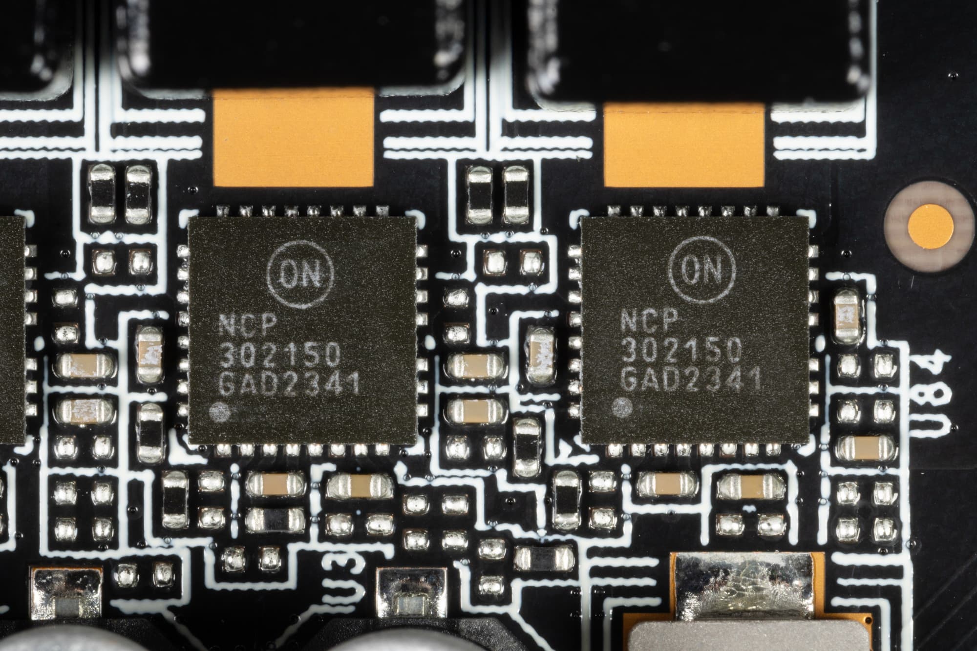 В преобразователе питания используются транзисторные сборки DrMOS — в данном случае NCP302150 (On Semi), каждая из которых рассчитана максимально на 50 А.