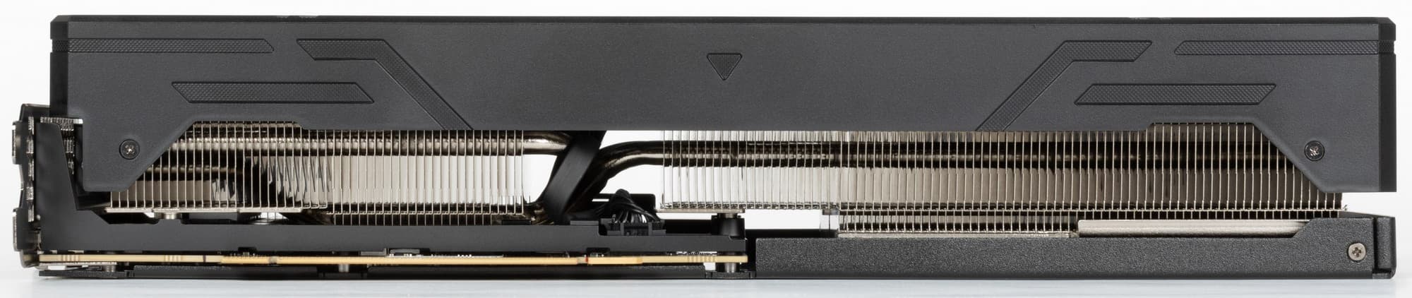 Длина кулера значительно больше длины печатной платы, правый вентилятор продувает радиатор насквозь в хвостовой части карты.