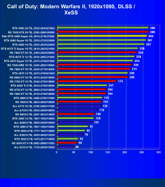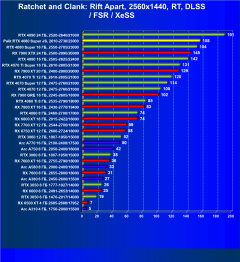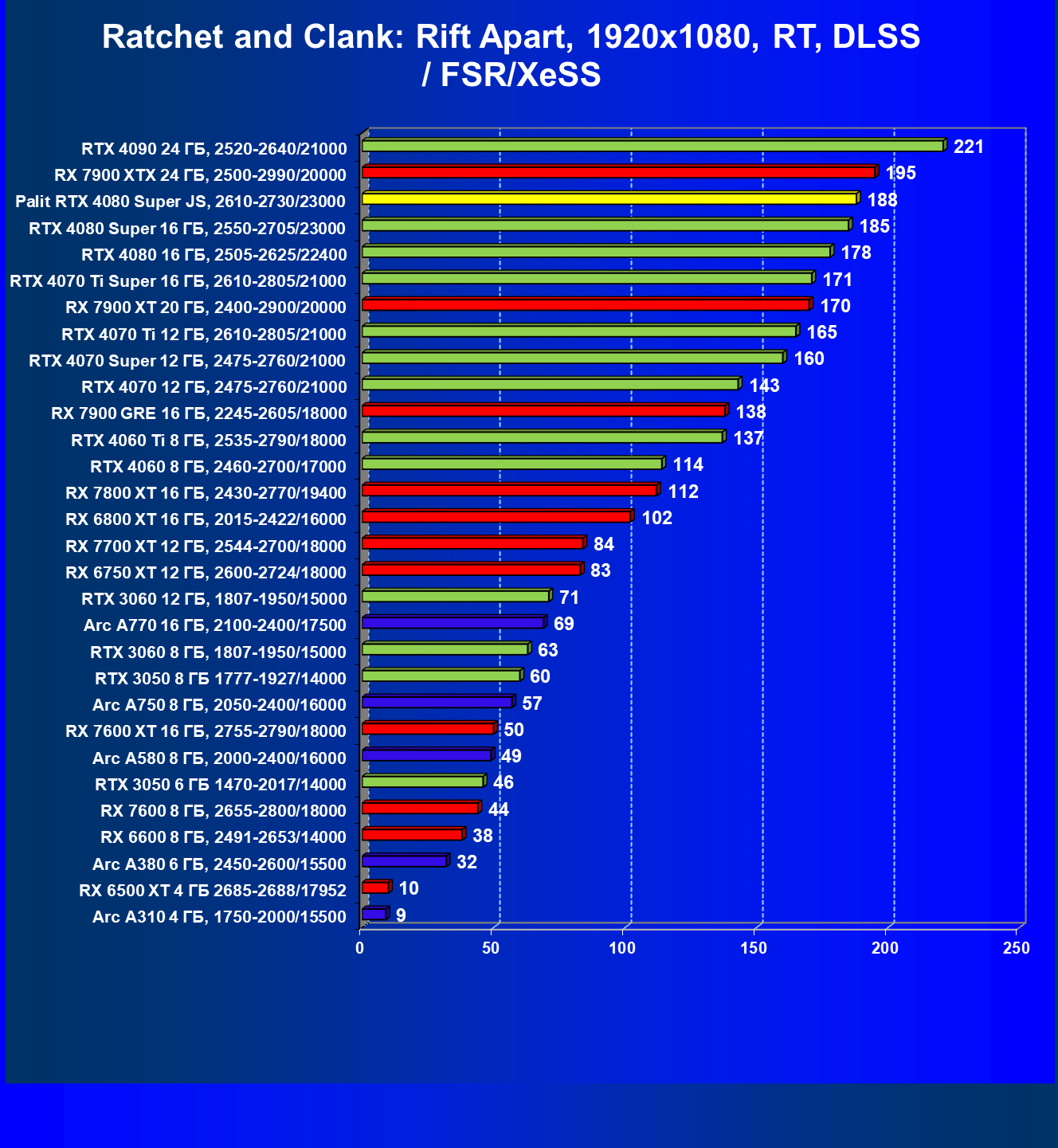 Рейтинг составлен по 9 тестам, в которых используется технология трассировки лучей и одновременно технология Nvidia DLSS, AMD FSR или Intel XeSS. Этот рейтинг нормирован по самому слабому ускорителю — Arc A310 (то есть сочетание скорости и функций Arc A310 приняты за 100%).