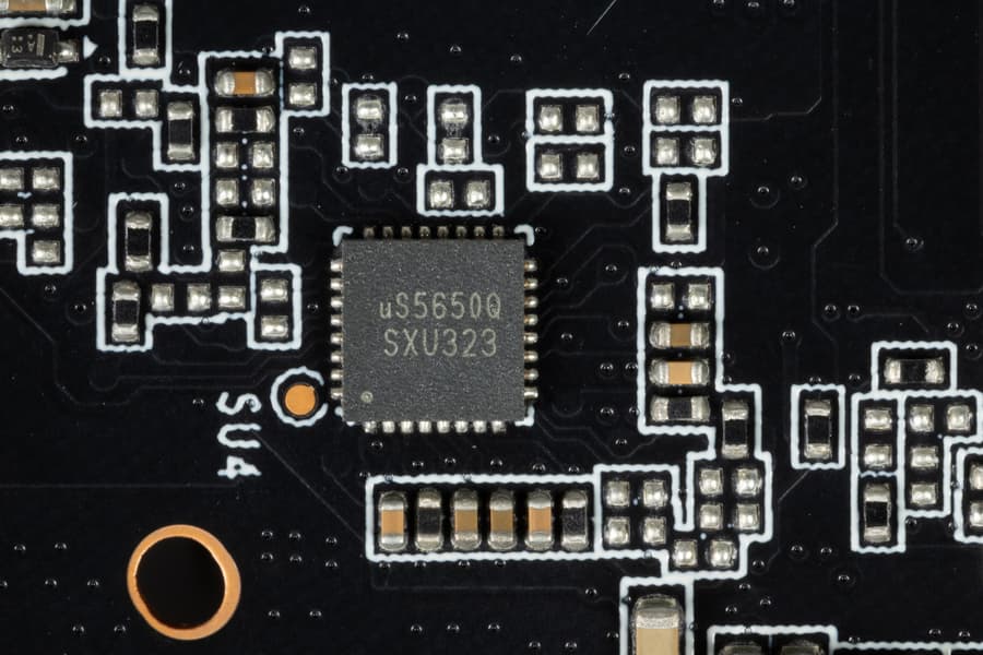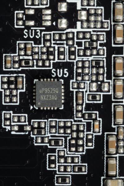 Также на тыльной стороне платы имеется контроллер uP5650Q (uPI Semi), который отвечает за мониторинг карты (отслеживание напряжений и температуры).
