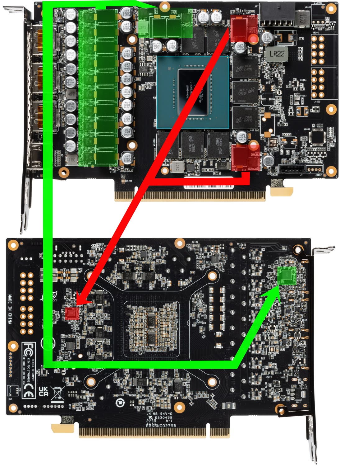 Зеленым цветом отмечена схема питания ядра, красным — памяти. Все ШИМ-контроллеры расположены на оборотной стороне PCB.