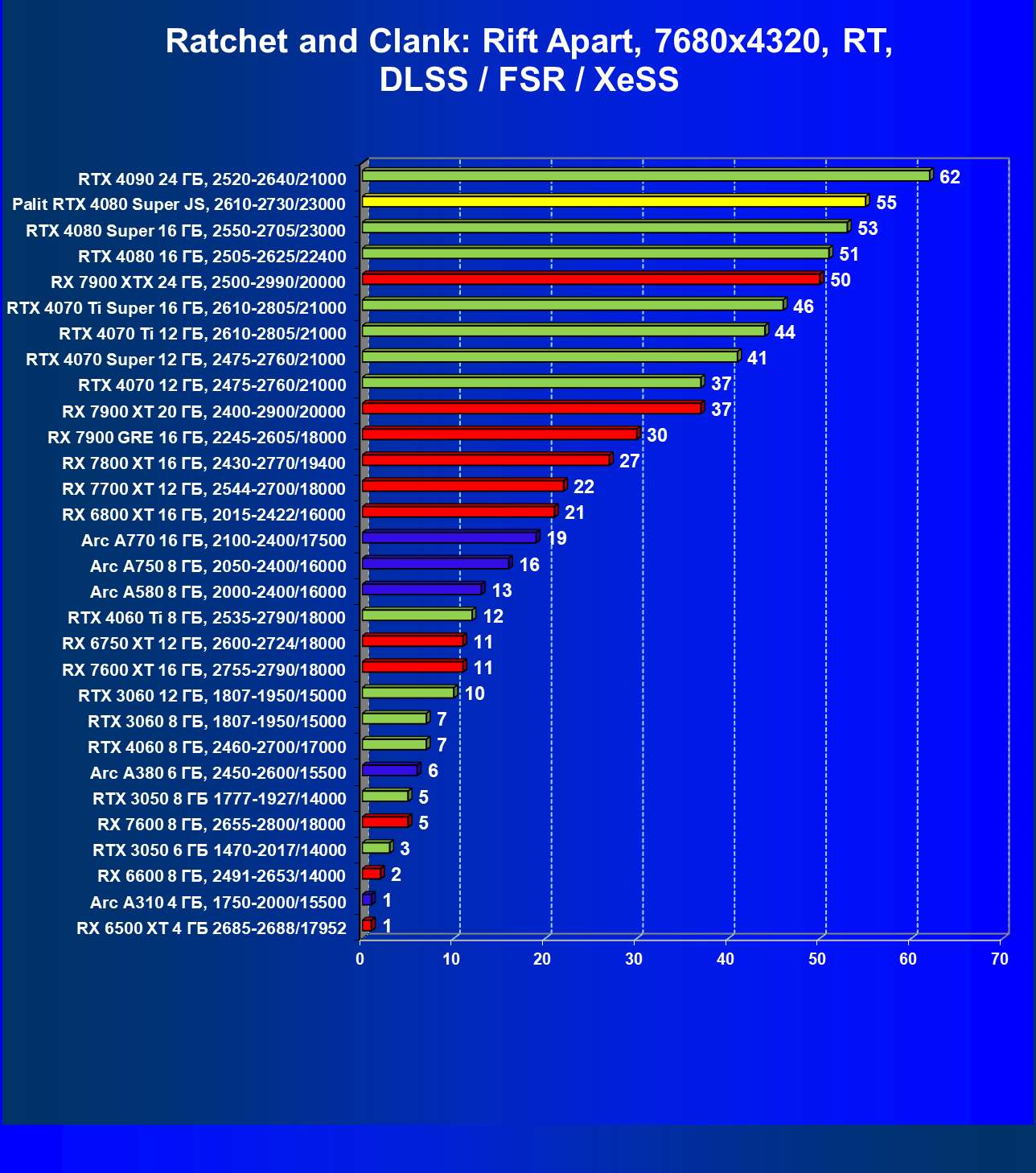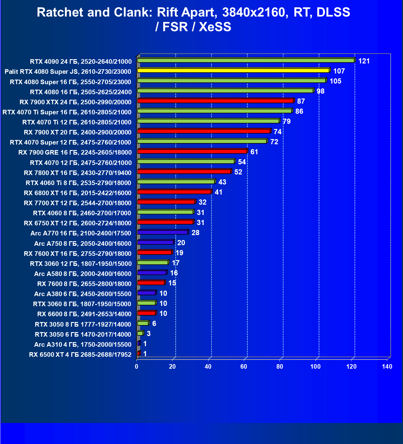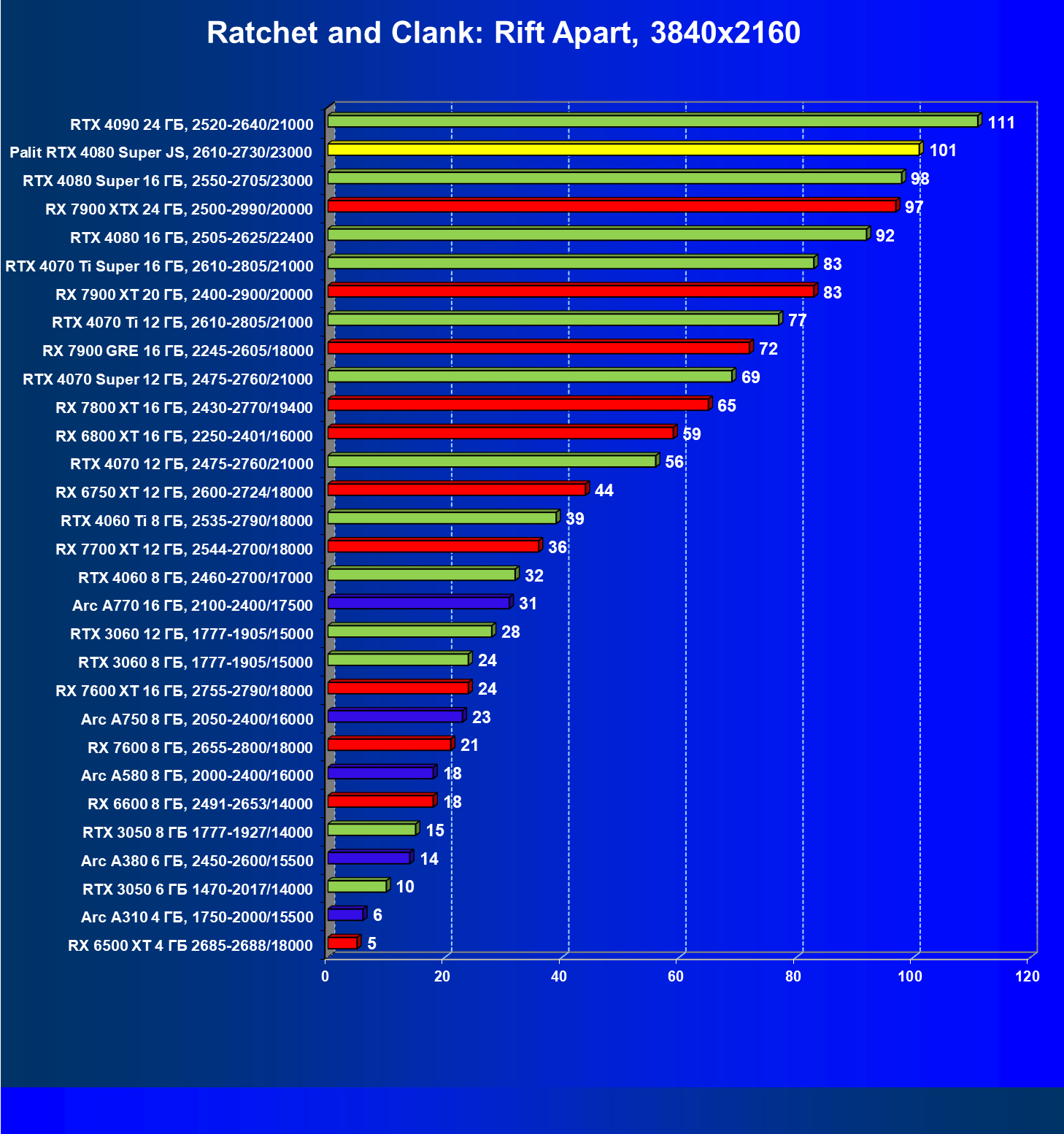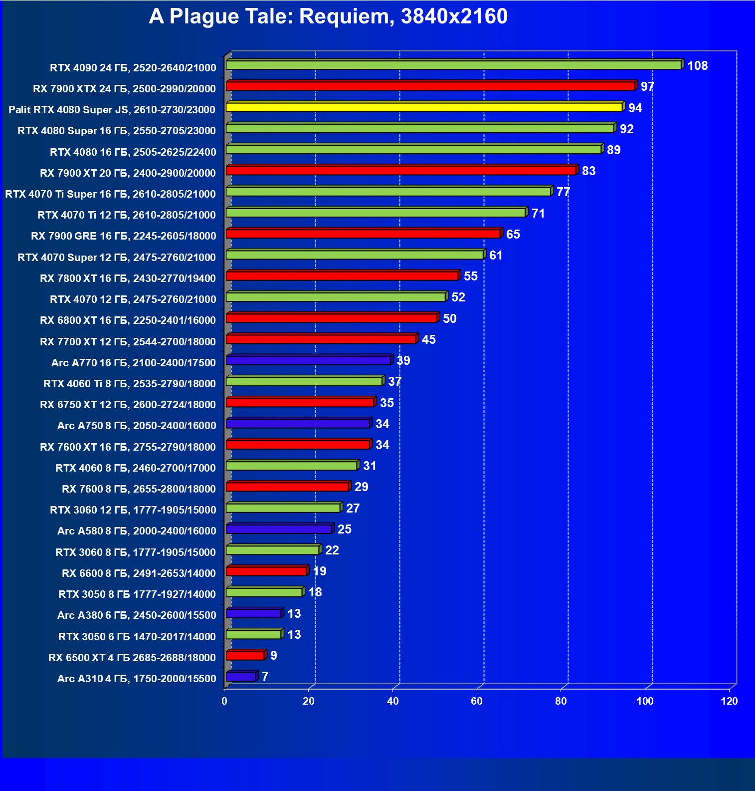 Учитывая нацеленность GeForce RTX 4080 Super на разрешение 4К, мы привели рейтинг, подсчитанный только при использовании разрешения 3840×2160.