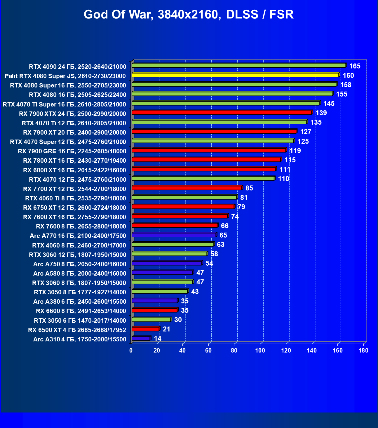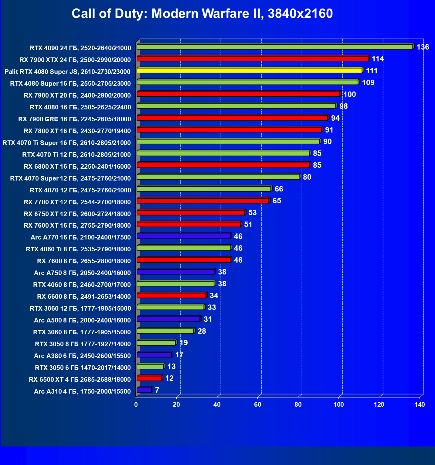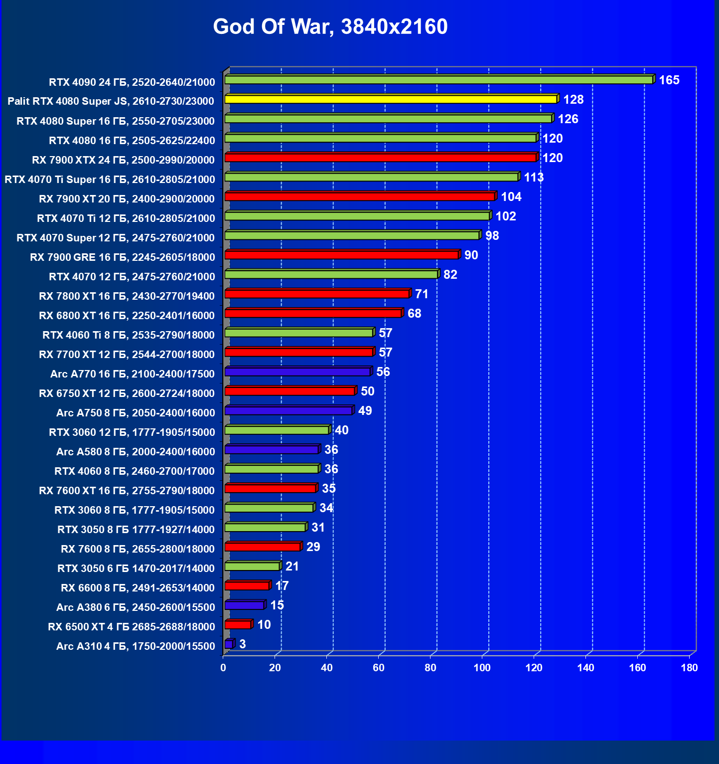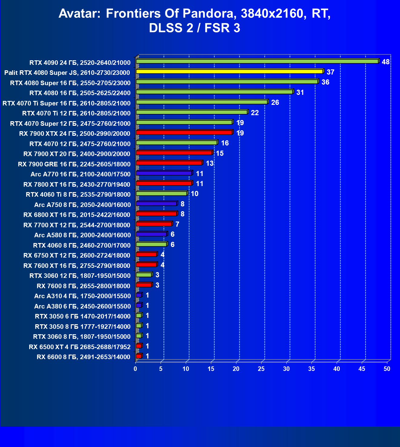 Учитывая нацеленность GeForce RTX 4080 Super на разрешение 4К, мы привели рейтинг, подсчитанный только при использовании разрешения 3840×2160.