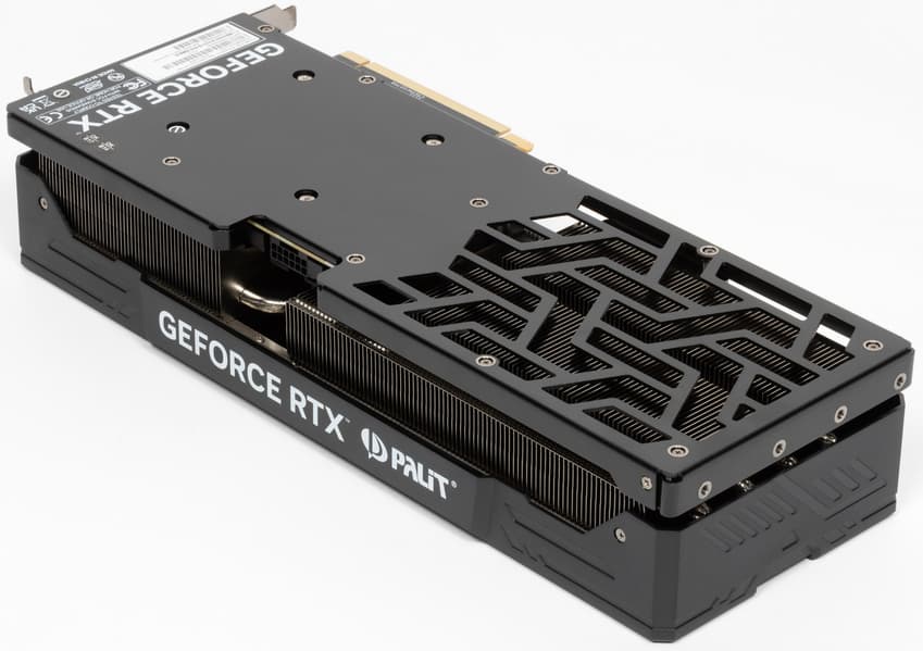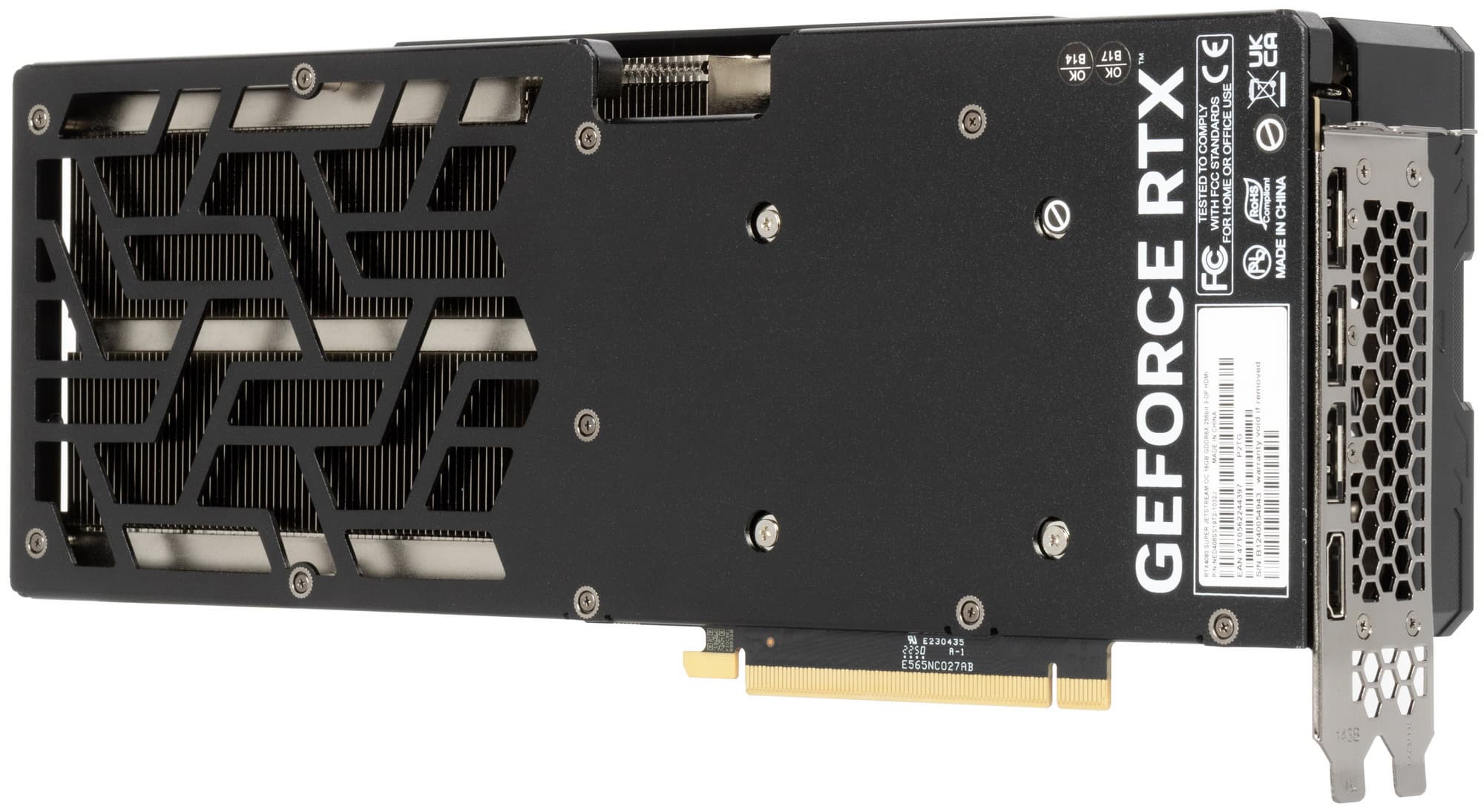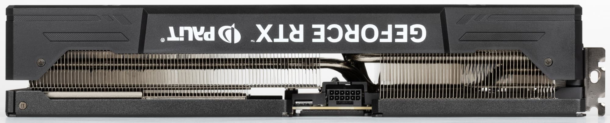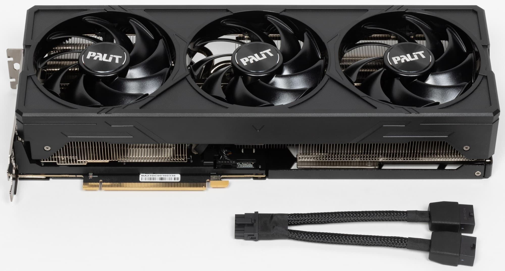 Карта Palit имеет 16-контактный разъем питания версии PCIe 5.0. Хотя в комплекте поставки имеется адаптер-переходник для подключения разъемов питания типа PCIe 2.0 (с 2 таких разъемов), лучше всё же использовать блоки питания стандарта ATX 3.0 с полноценной поддержкой питания PCIe 5.0 (с кабелем 12VHPWR).