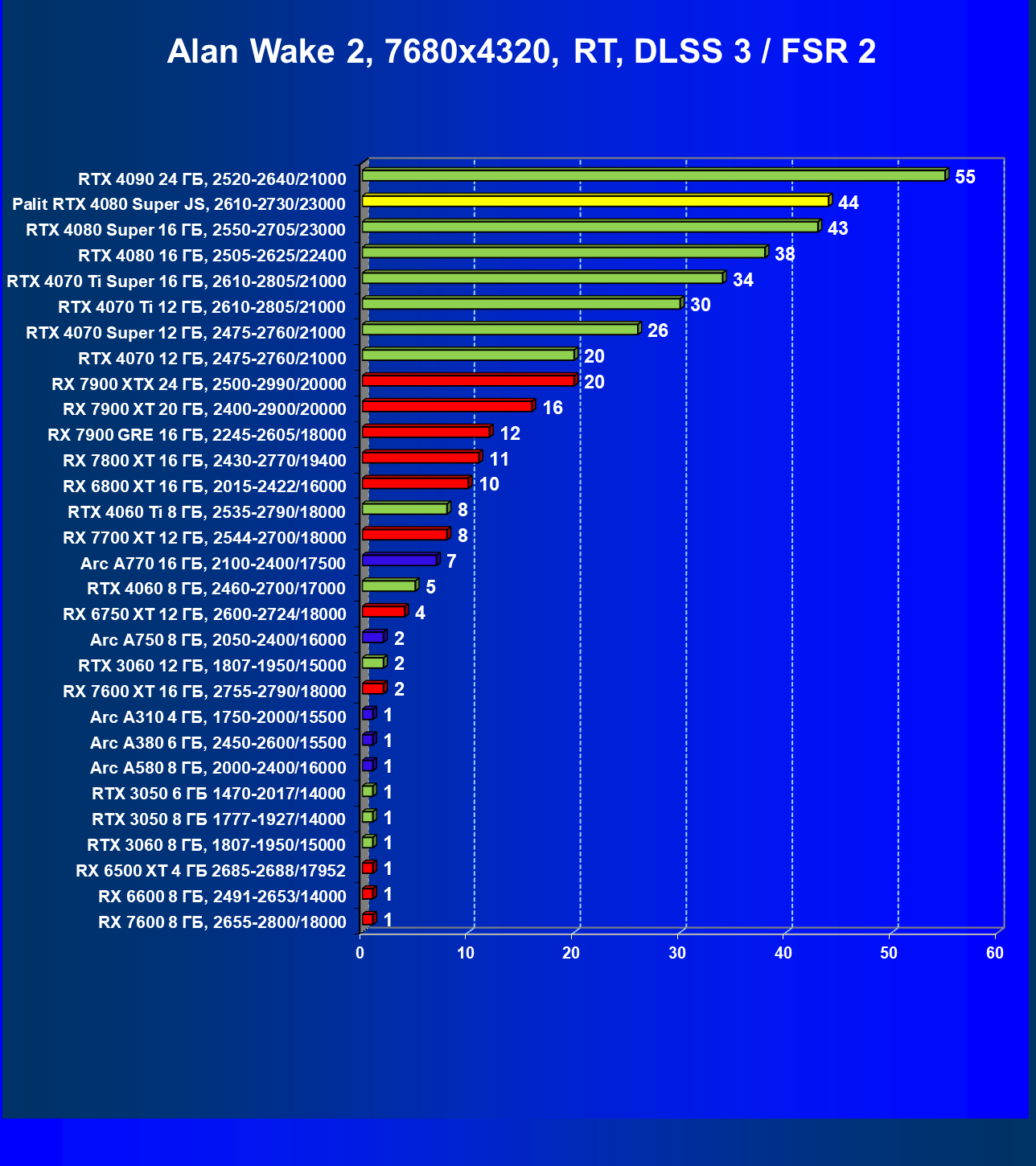 Уже почти 6 лет как известно, что трассировка лучей сильно снижает производительность, однако реализованные во многих играх с трассировкой лучей технологии масштабирования Nvidia, AMD и Intel прекрасно помогают компенсировать падение скорости от использования RT. Поэтому предыдущие выводы относительно разрешений до 4K для такой мощной карты, как GeForce RTX 4080 Super, остаются в силе. Разумеется, в 8K при активной трассировке лучей в ряде игр даже включение DLSS 3 не обеспечит достаточного комфорта, но всё же найдутся игры, в которые можно будет поиграть и в таком огромном разрешении.
