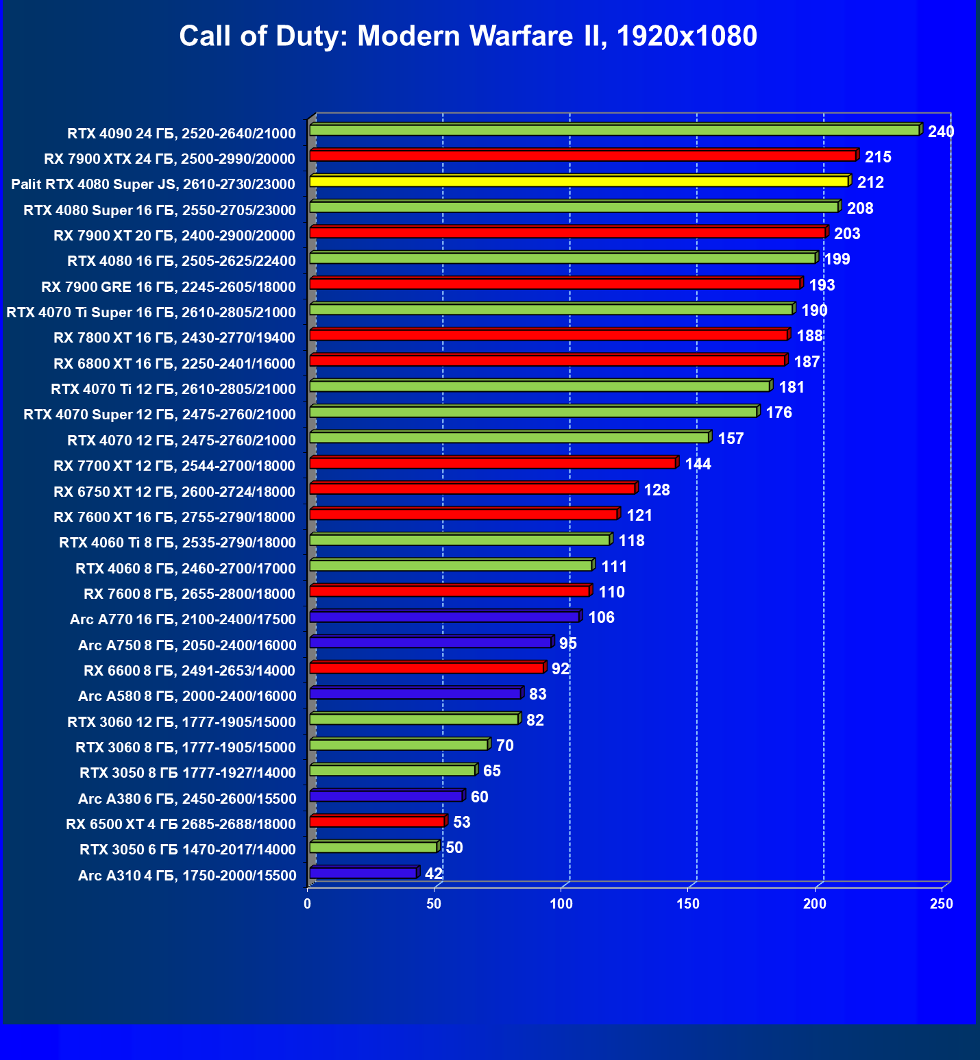| 17 | RX 7900 XT 20 ГБ, 2400—2900/20000 | 249 | 2365 | 95 000 |