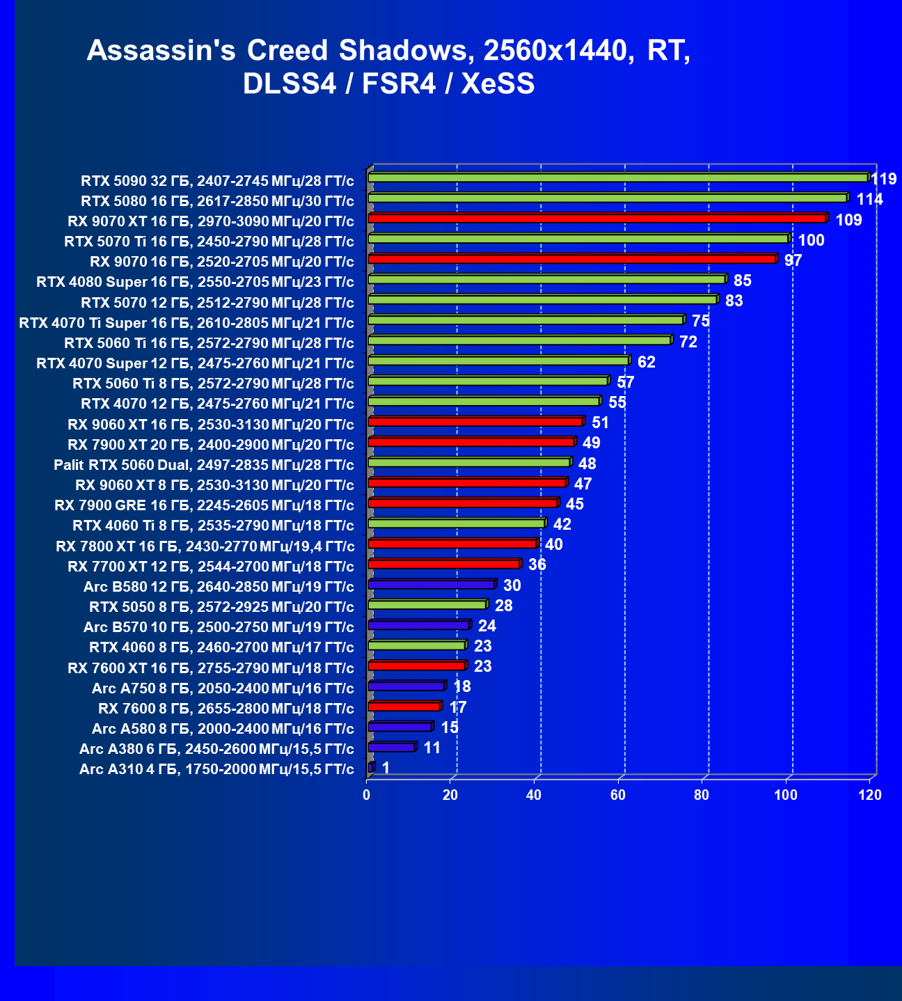 | 16 | RX 9060 XT 8 ГБ, 2530—3130 МГц/20 ГТ/с | 657 | 160 | 41 000 |
