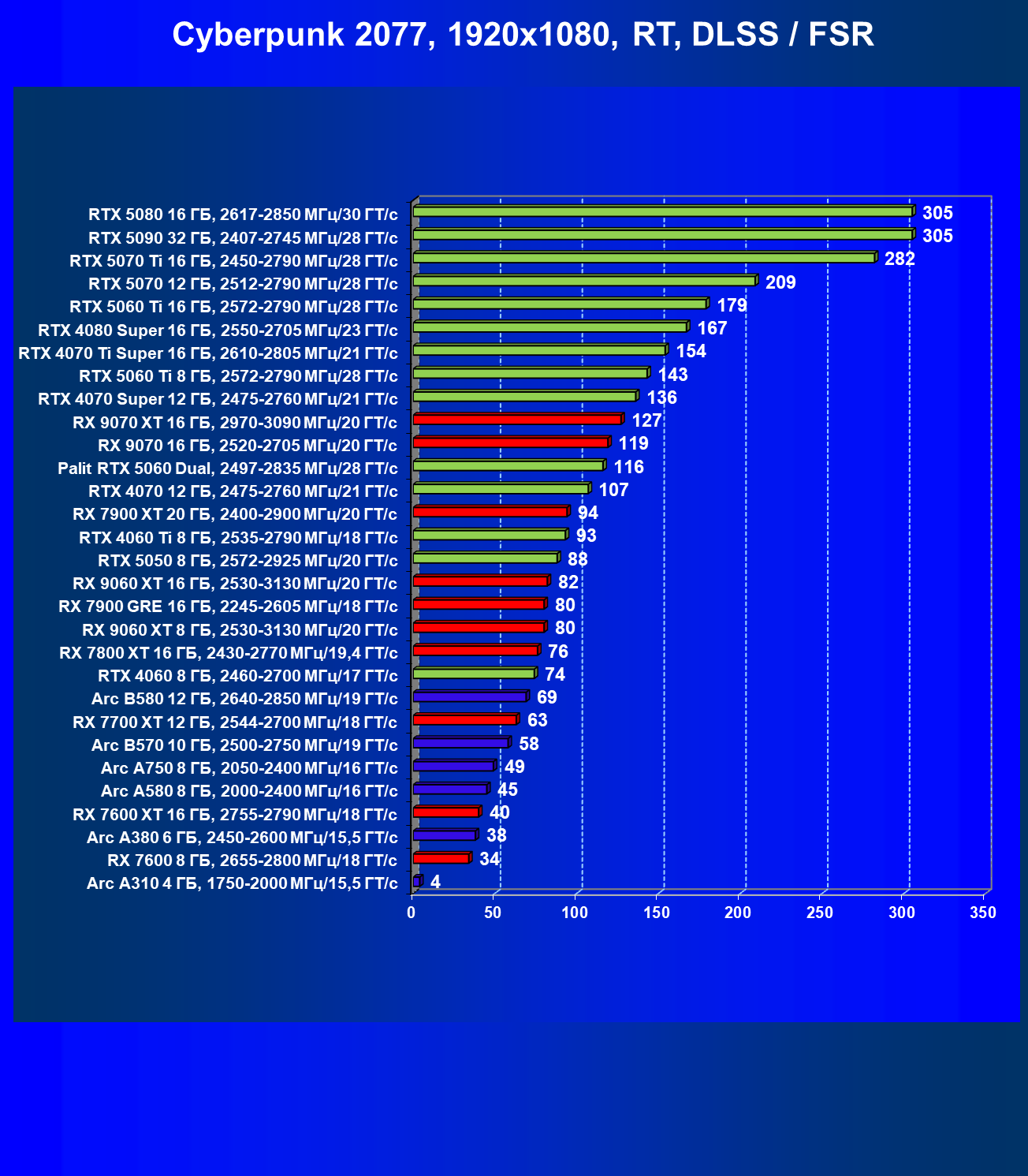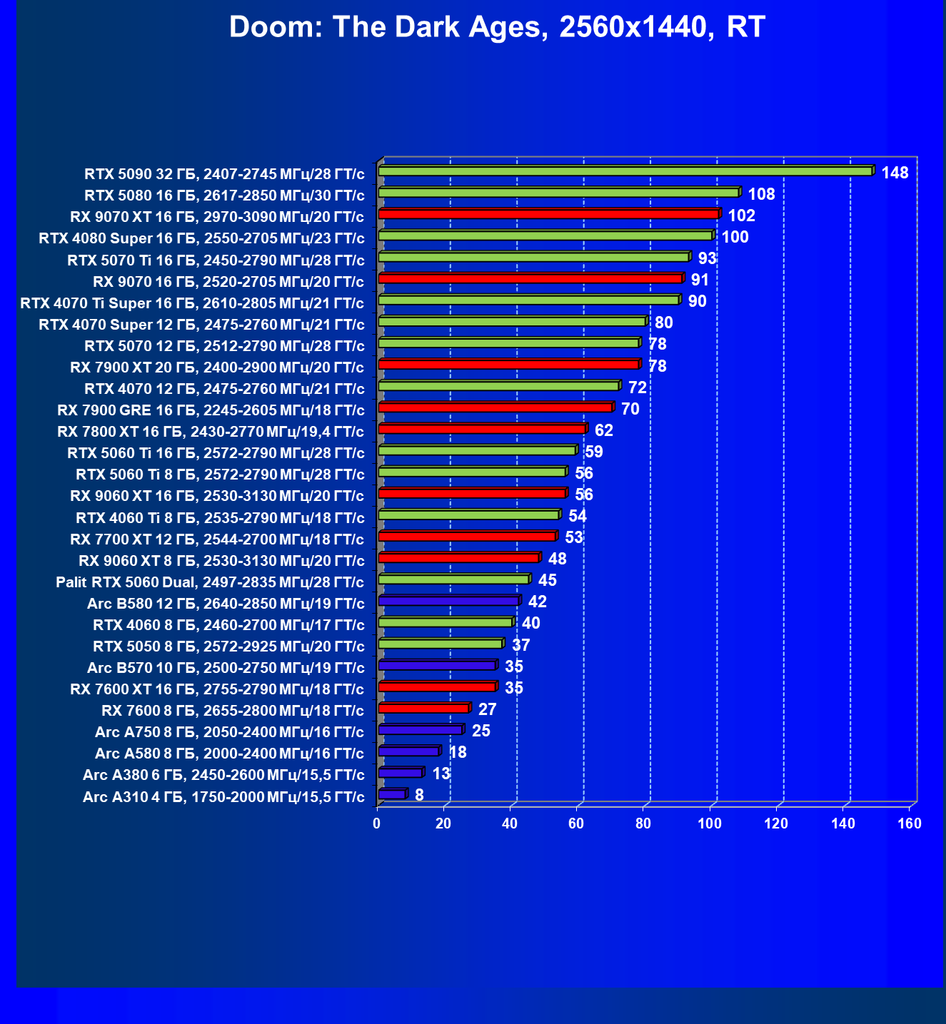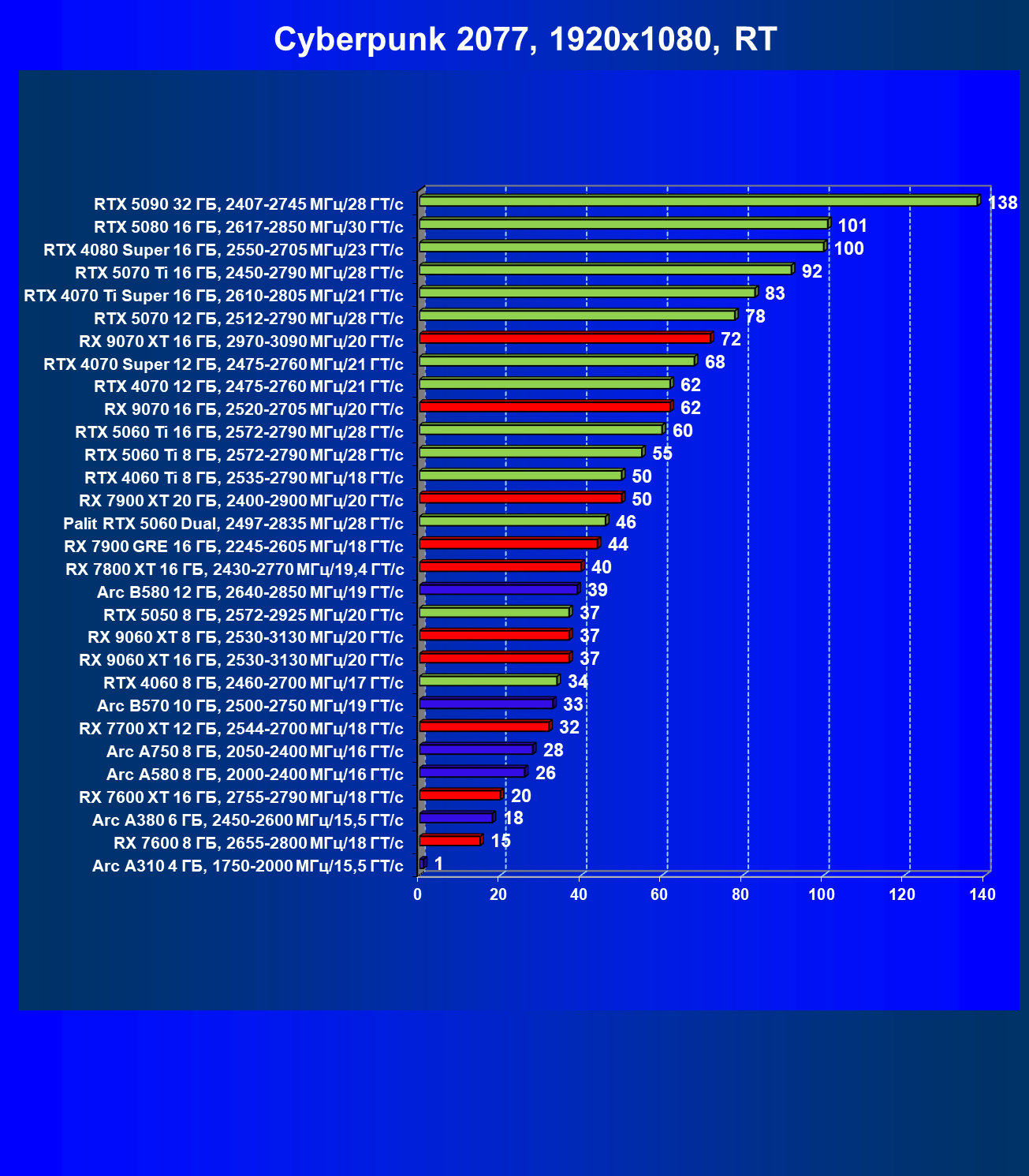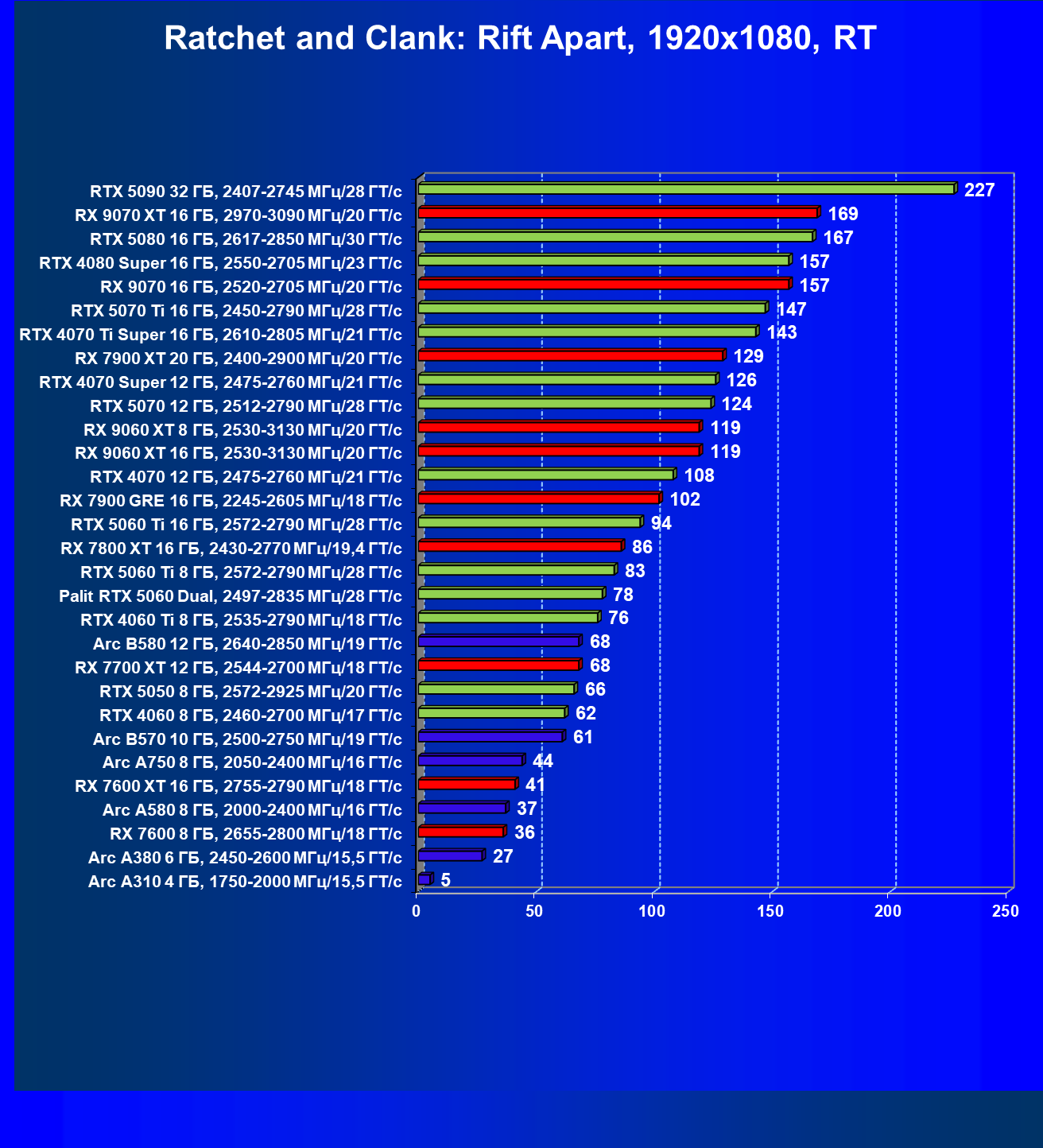 Мы видим, что GeForce RTX 5060 намного быстрее, чем Radeon RX 7600 XT (при этом последний дороже), также опережает GeForce RTX 4060 Ti, Arc B580 (однако последний сильно дешевле).