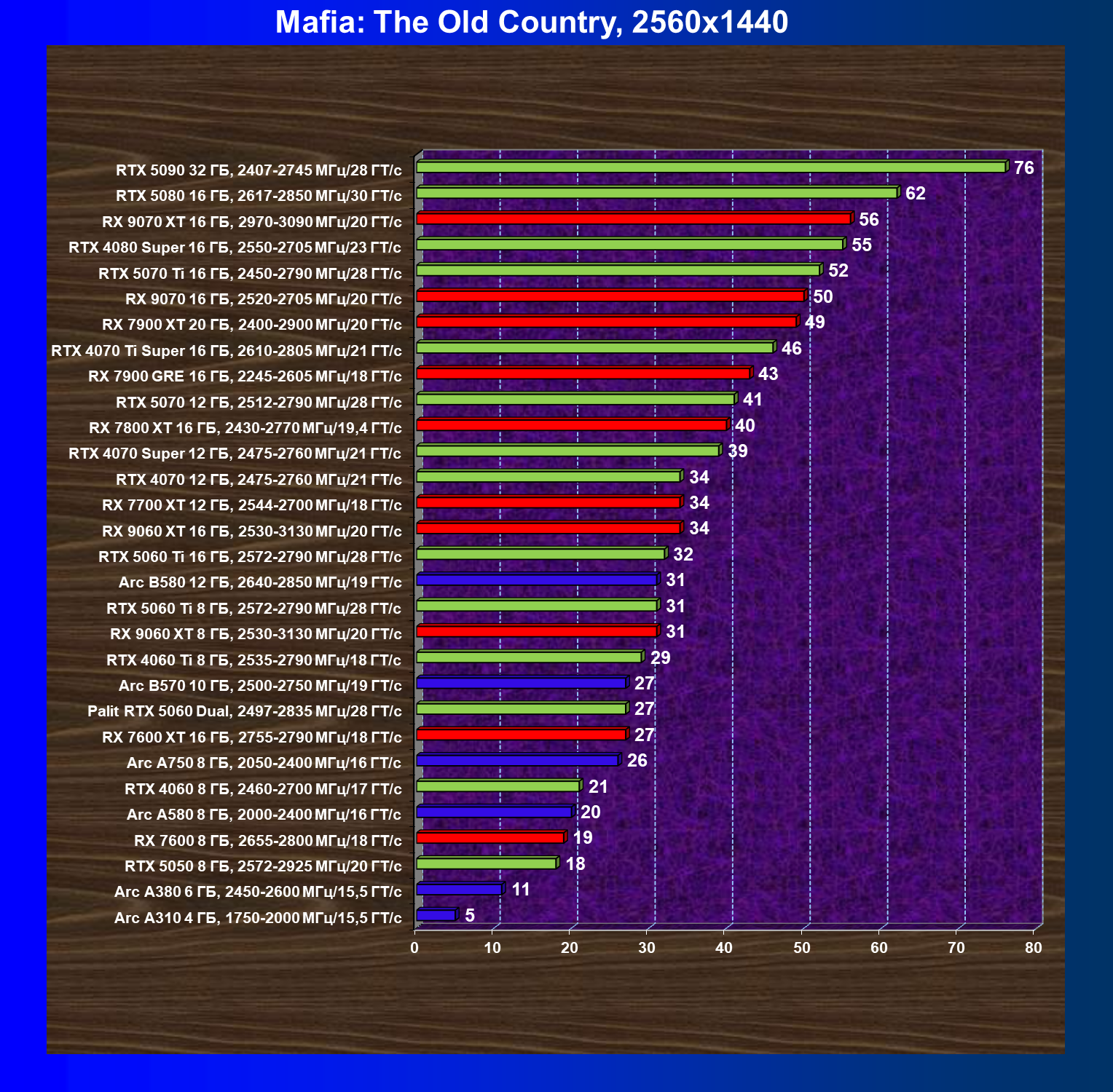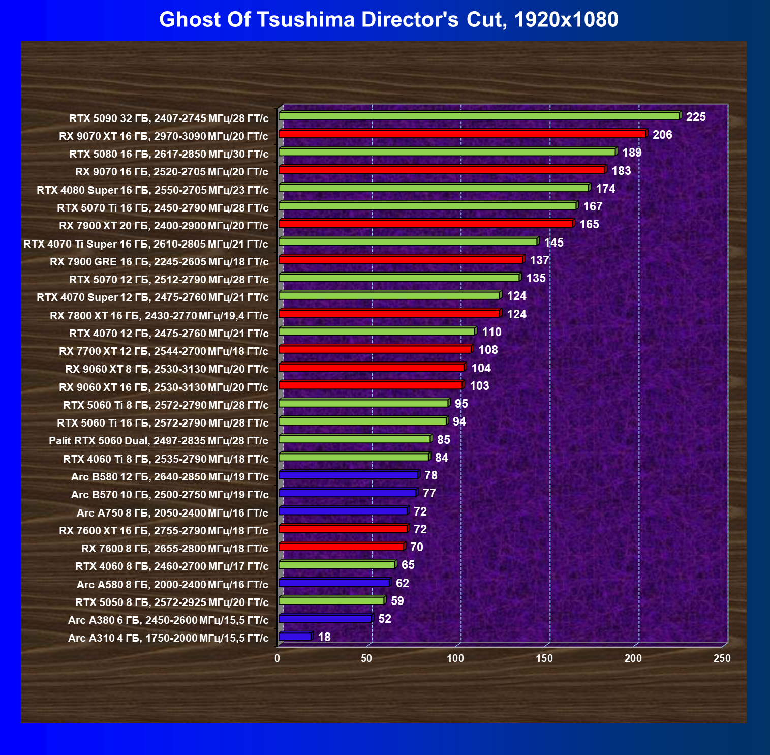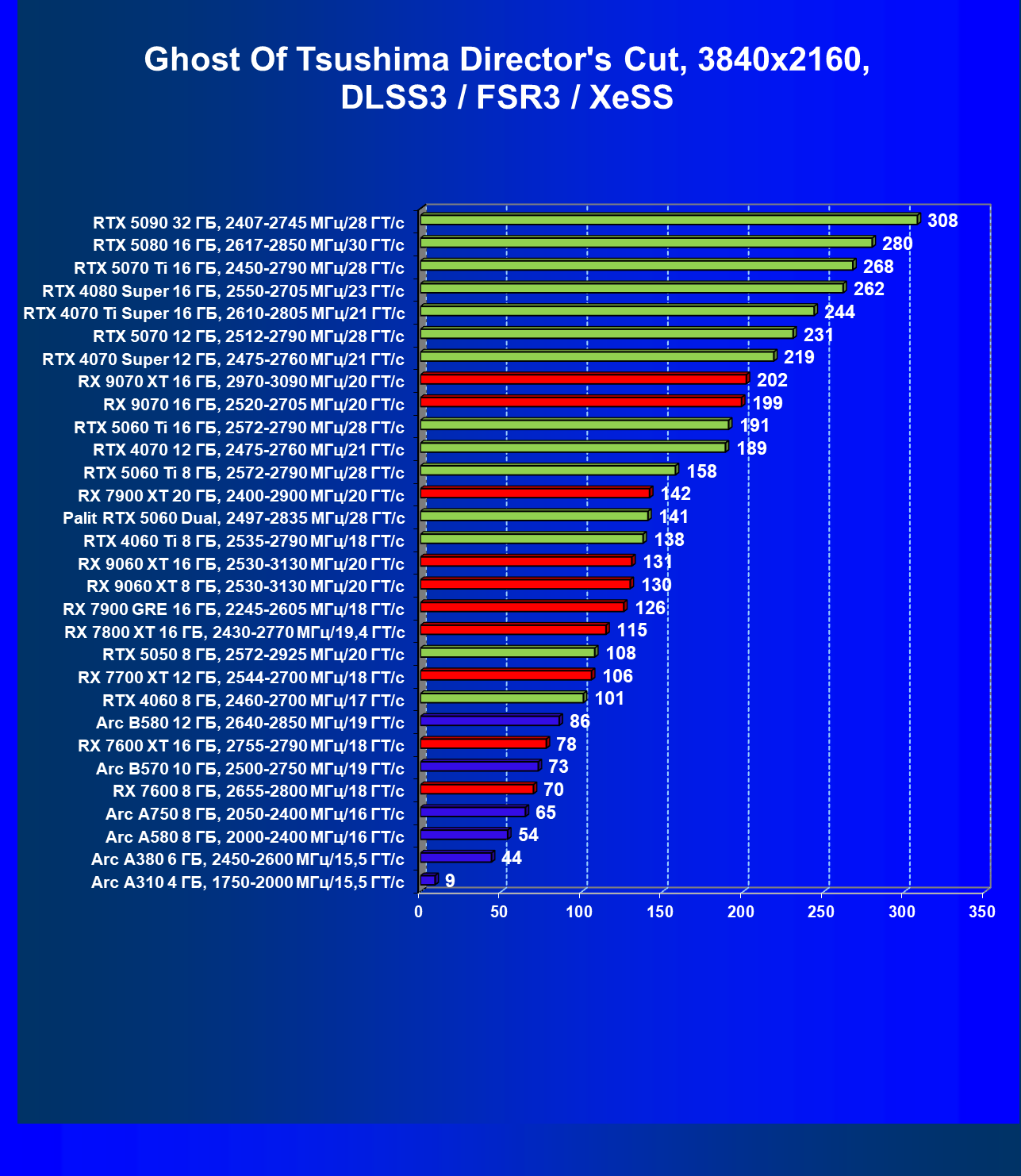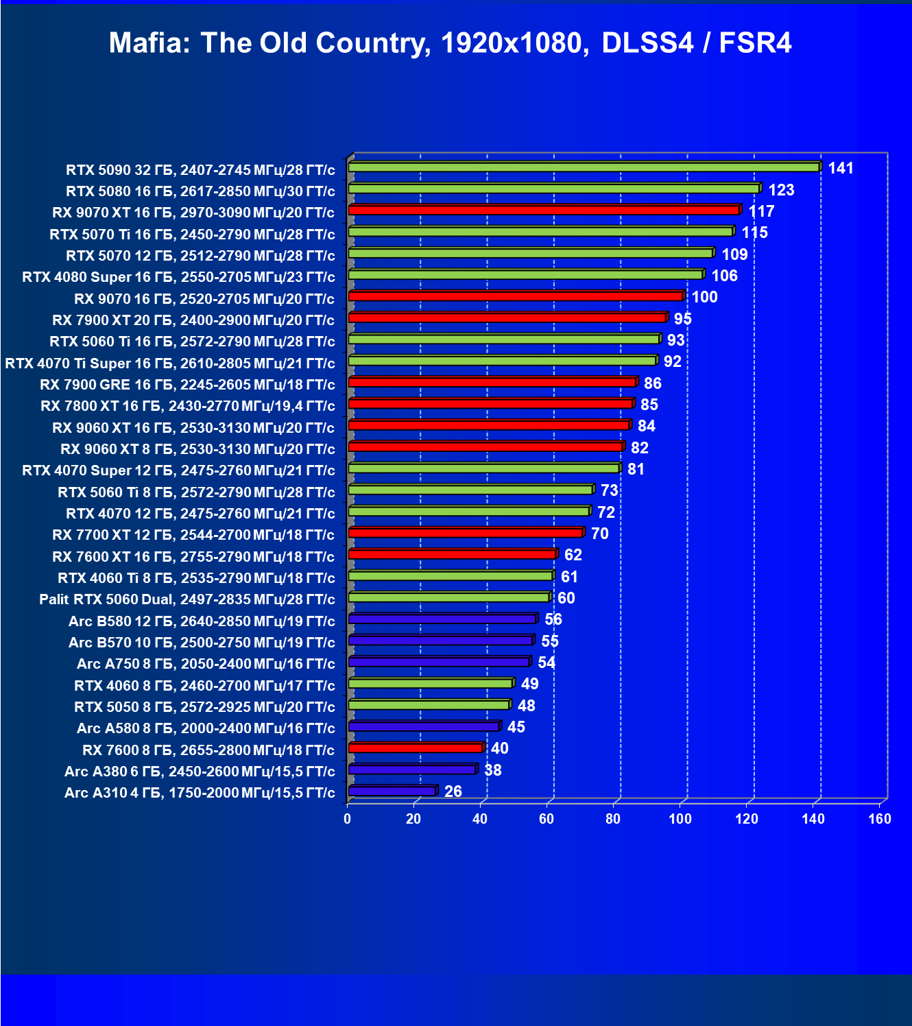 Мы видим, что GeForce RTX 5060 намного быстрее, чем Radeon RX 7600 XT (при этом последний дороже), также опережает GeForce RTX 4060 Ti, Arc B580 (однако последний сильно дешевле).