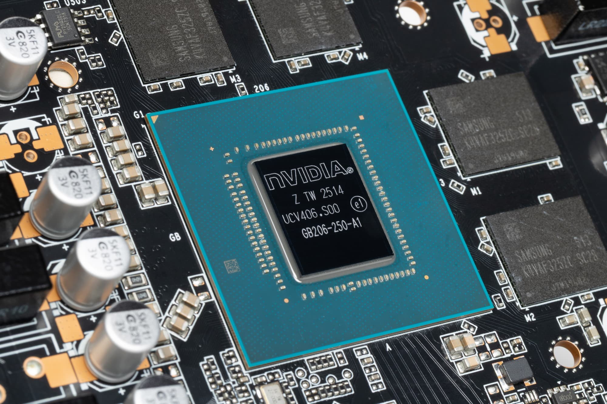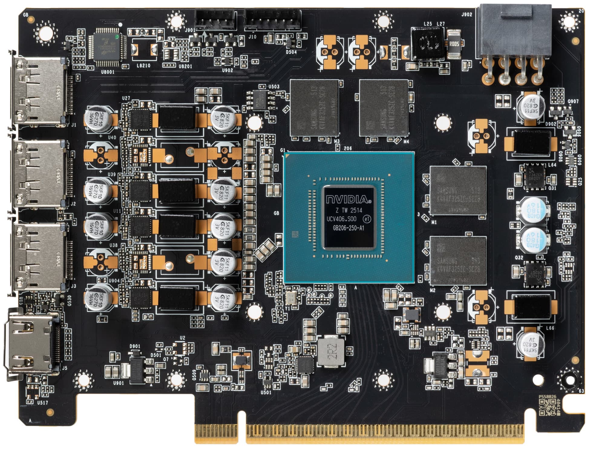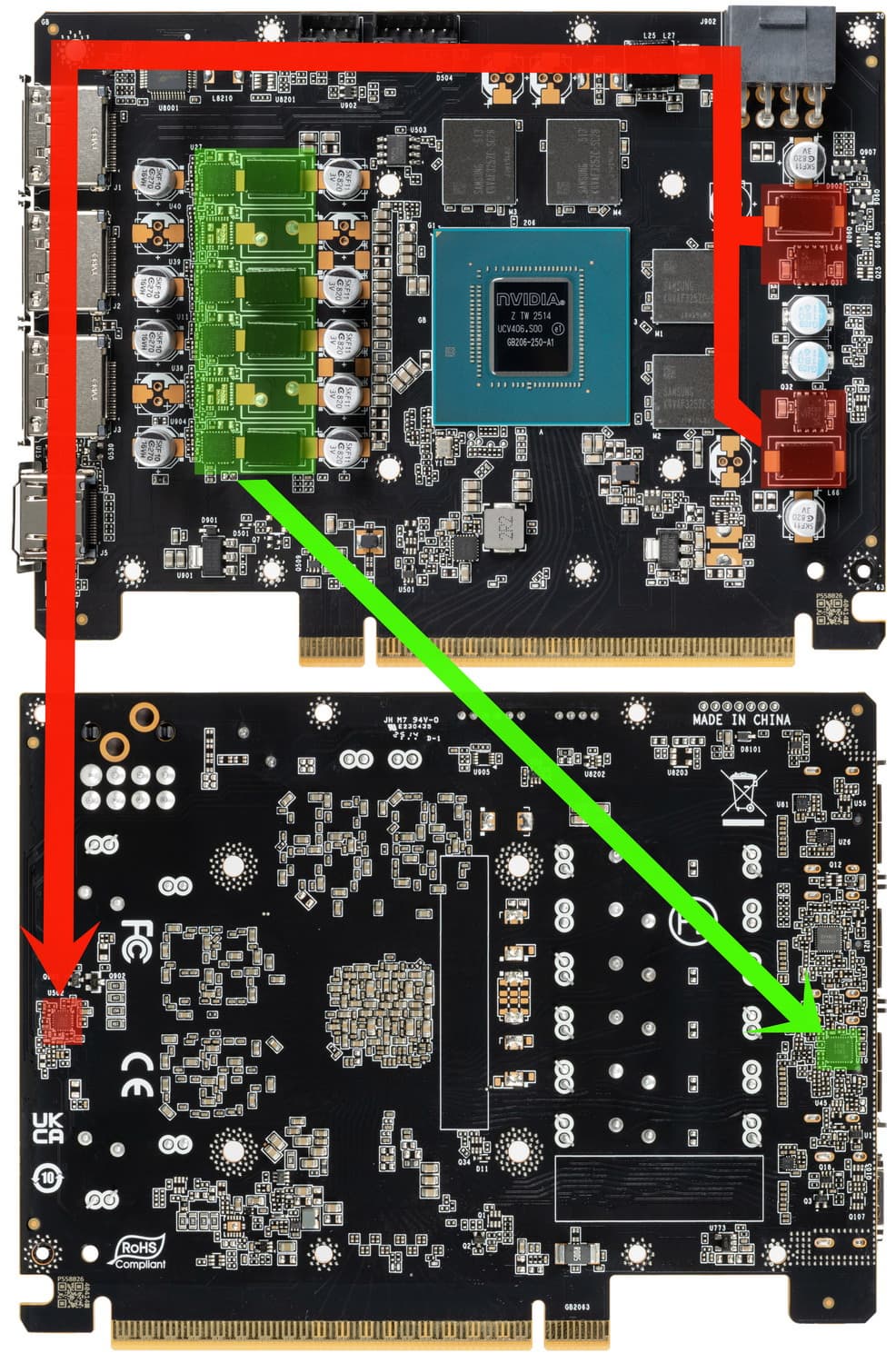 Ядро произведено на 14-й неделе 2025 года (кристалл выполнен по техпроцессу TSMC 4N — по разным оценкам это 5 нм). Маркировка — GB206-250, что означает урезанный в той или иной мере чип.