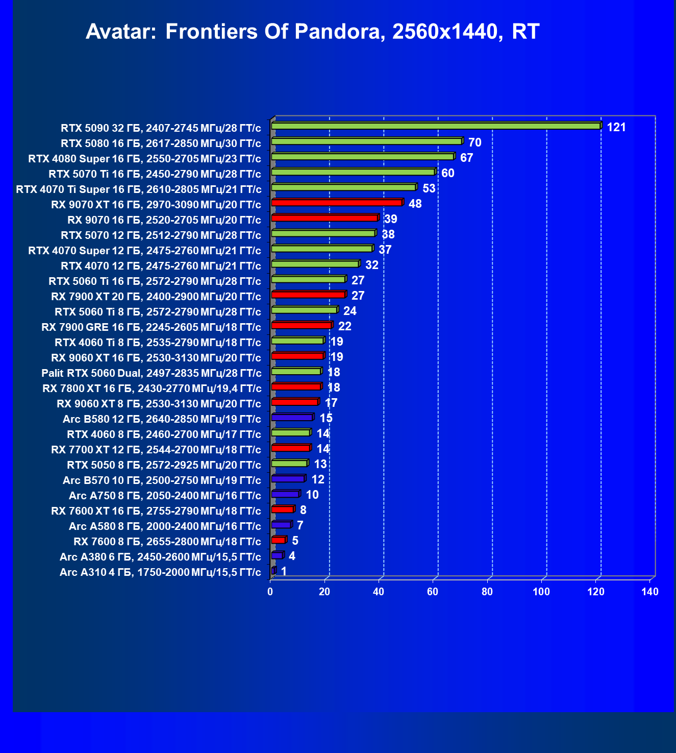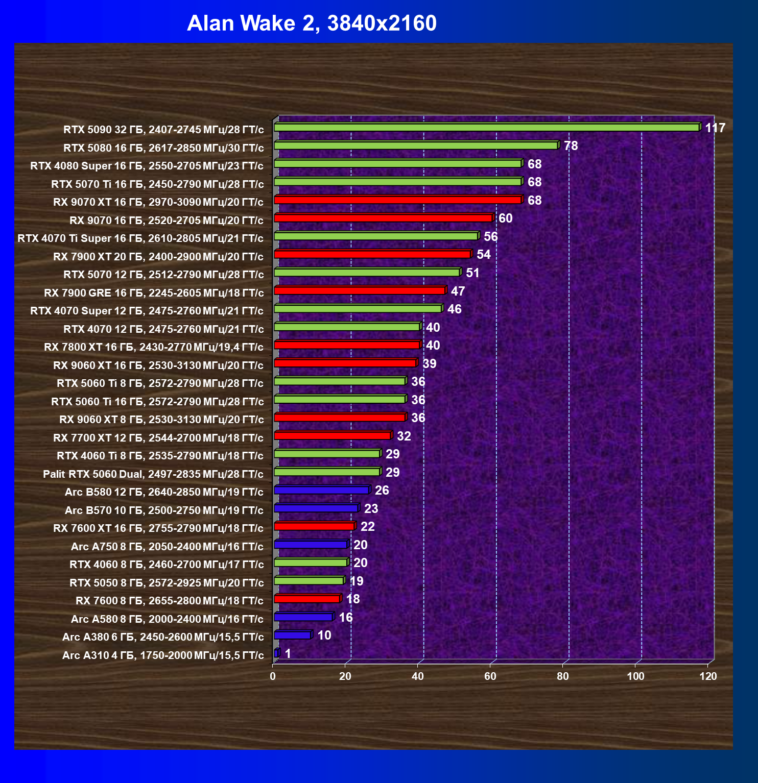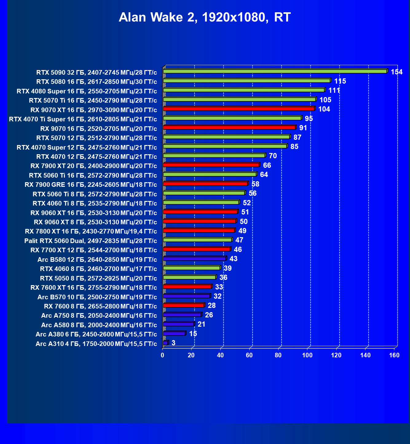 | 04 | RX 9060 XT 8 ГБ, 2530—3130 МГц/20 ГТ/с | 160 | 657 | 41 000 |