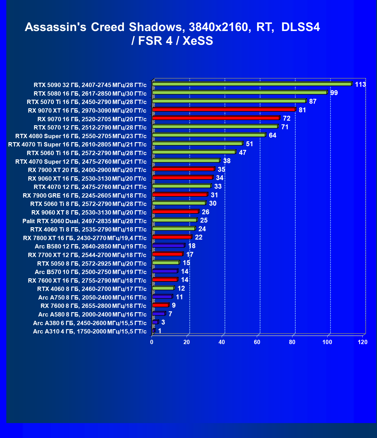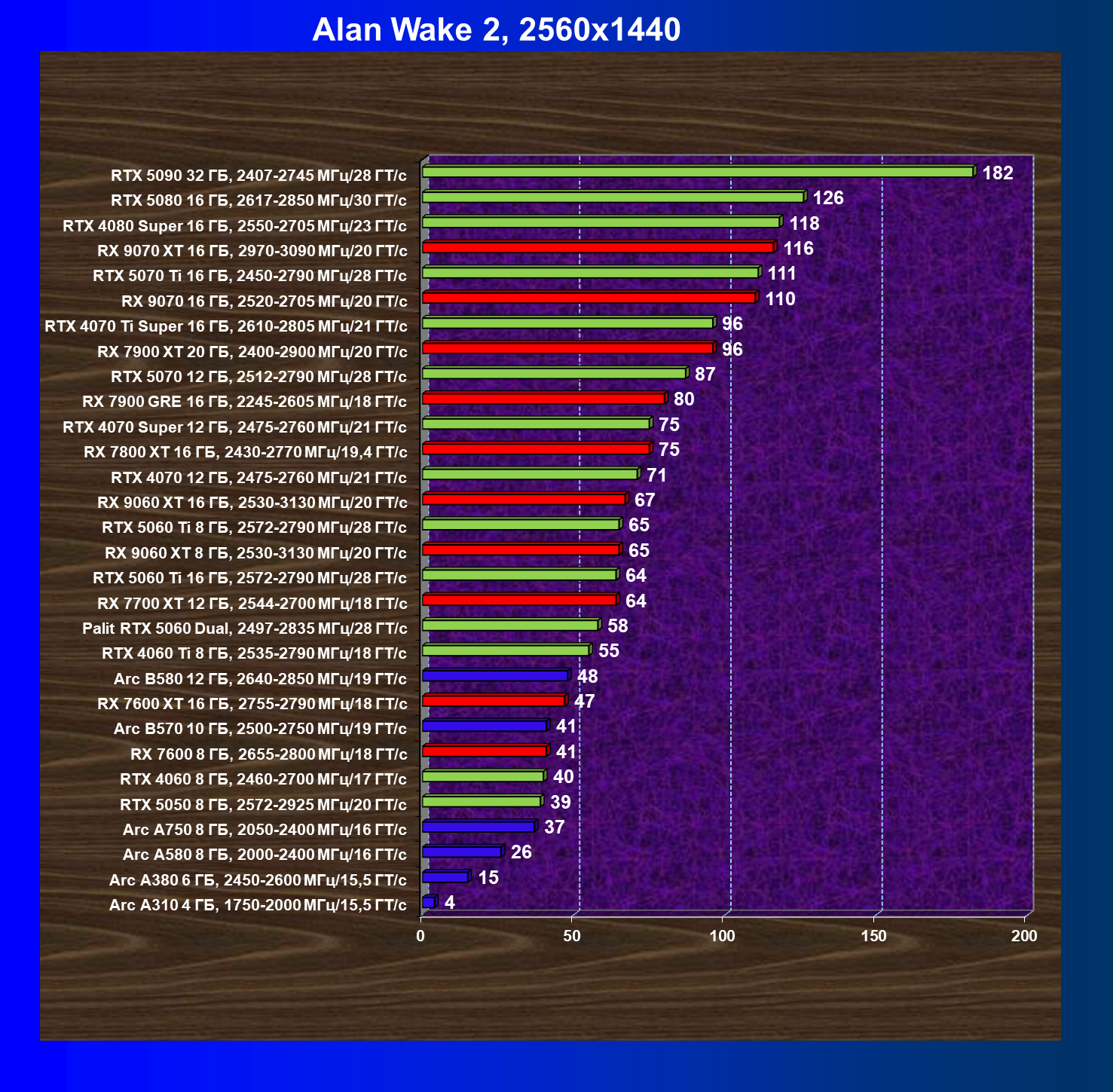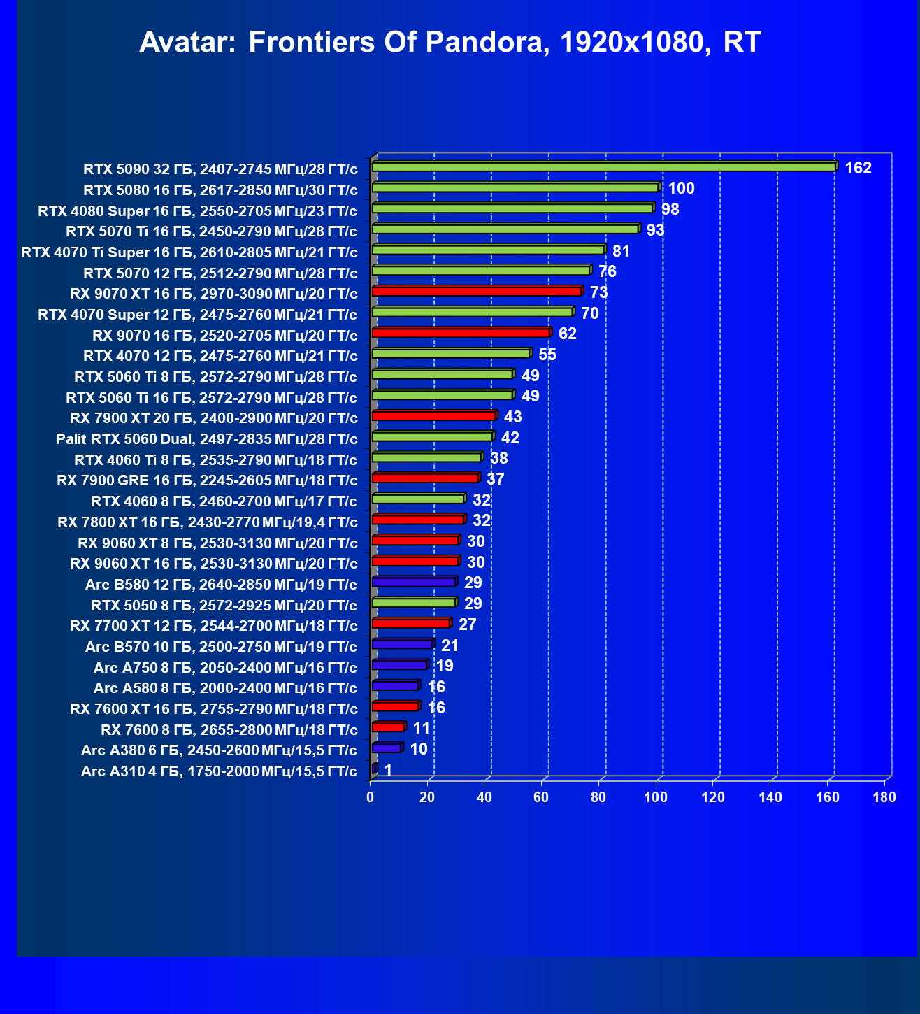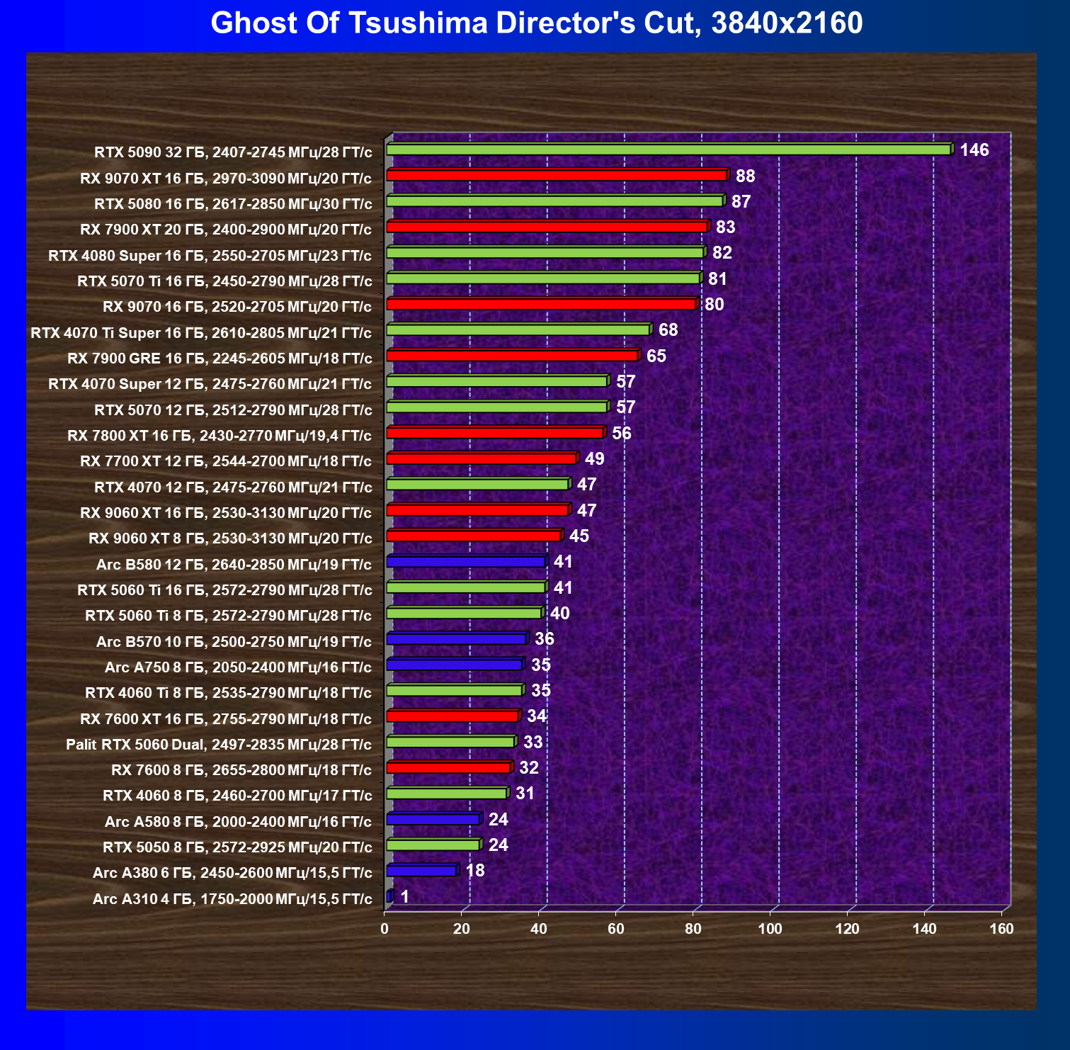 | 04 | RX 9060 XT 8 ГБ, 2530—3130 МГц/20 ГТ/с | 160 | 657 | 41 000 |