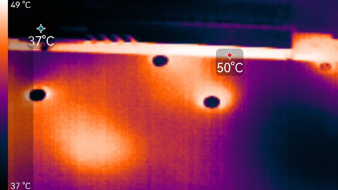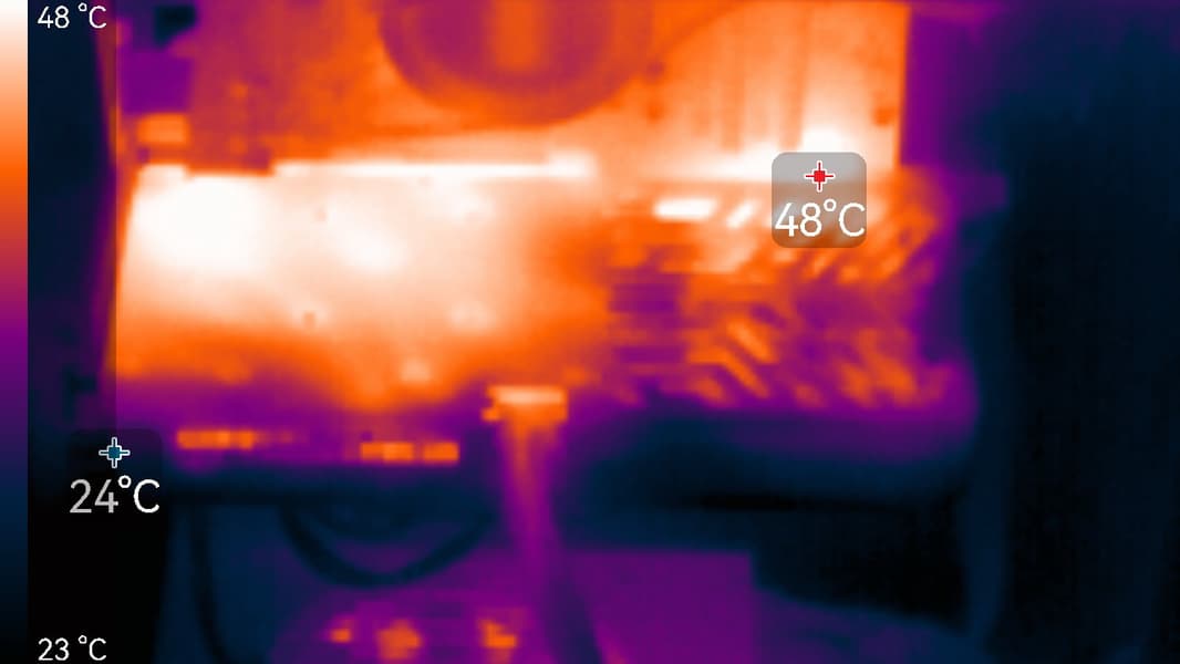 Максимальный нагрев наблюдался в центральной части PCB, а также около разъема PCIe.