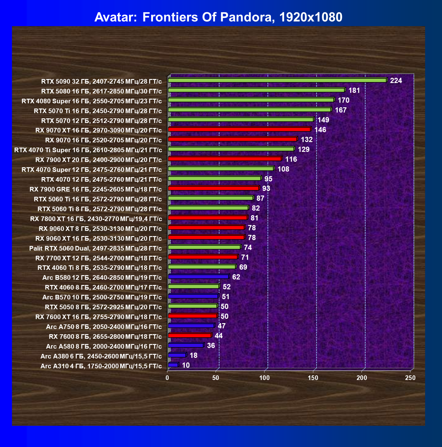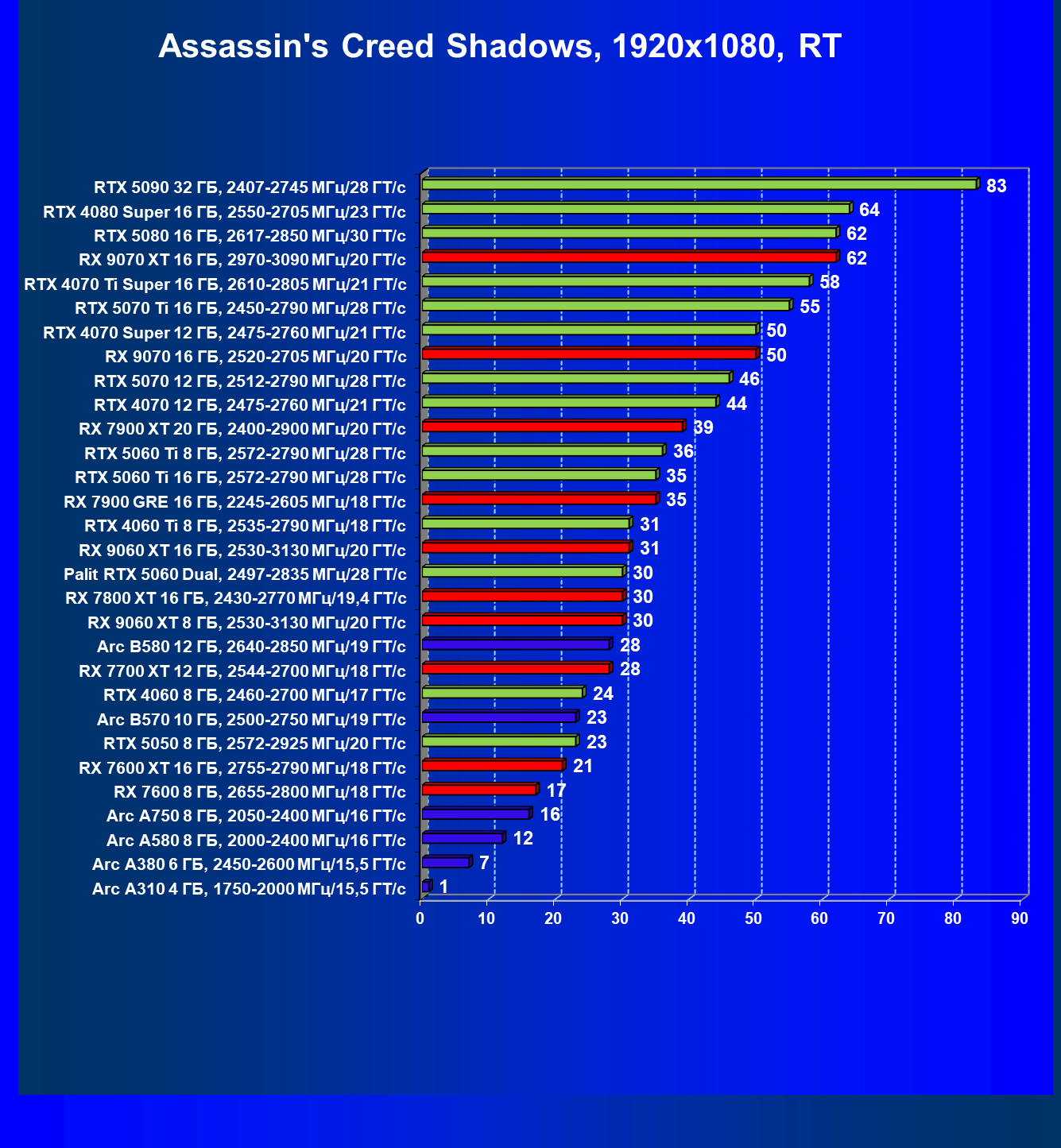 | 06 | RX 9060 XT 8 ГБ, 2530—3130 МГц/20 ГТ/с | 324 | 1327 | 41 000 |