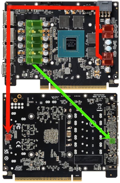 Мы сравниваем видеокарту Palit с аналогичным продуктом другого производителя, поскольку эталонной карты у нас нет, а первым ускорителем на базе GeForce RTX 5060 была именно видеокарта Gigabyte. Очевидно, что дизайны сильно отличаются в плане размещения подсистемы питания, включая разъем для дополнительного питания. Дизайн карты Palit наиболее близок к эталонному, а у карты Gigabyte, вероятно, конструкция СО потребовала переделки дизайна PCB.