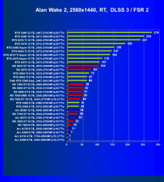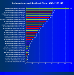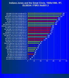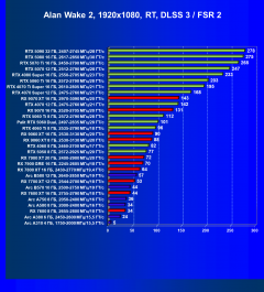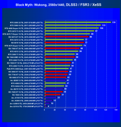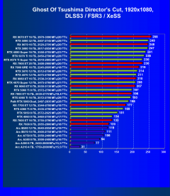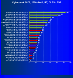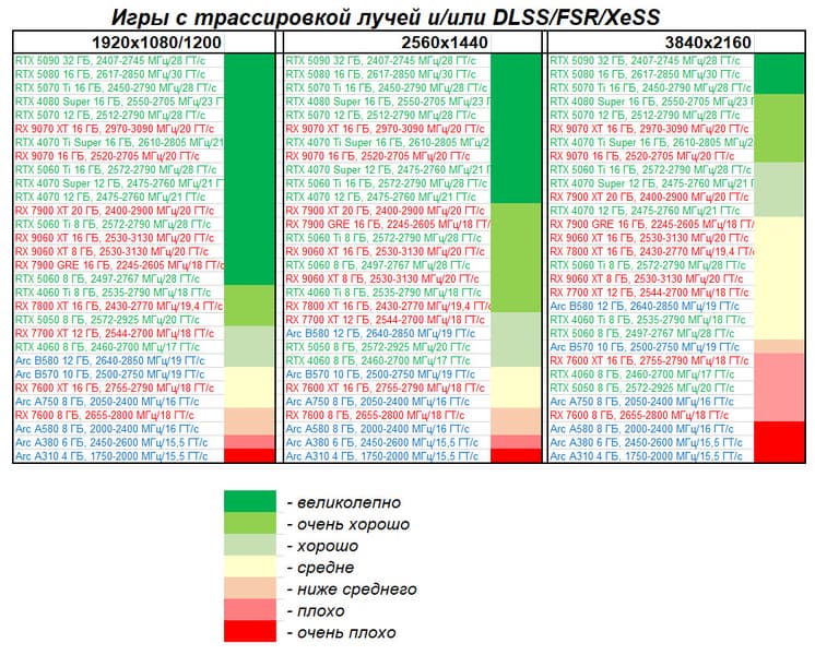 - Результаты тестов со включенной аппаратной трассировкой лучей и/или DLSS/FSR/XeSS в разрешениях 1920×1080, 2560×1440 и 3840×2160