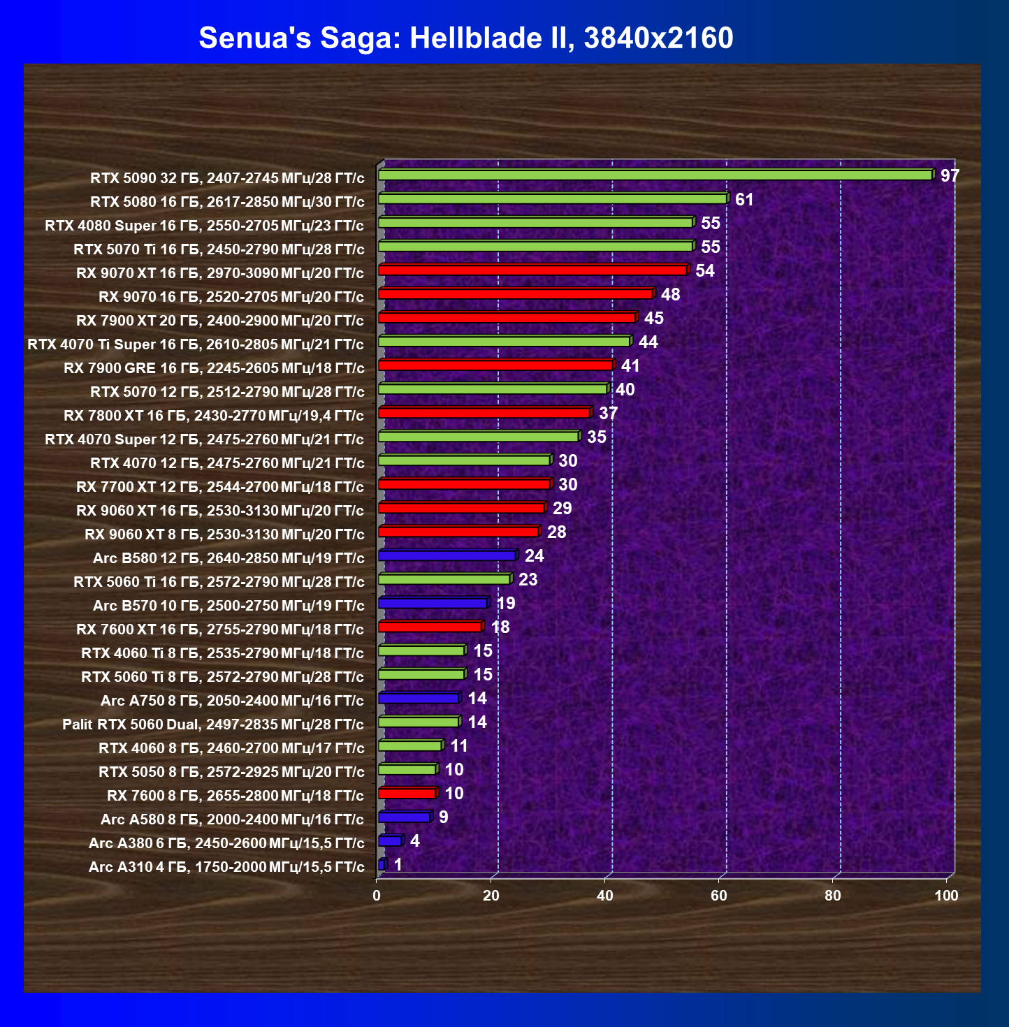| 21 | Arc B580 12 ГБ, 2640—2850 МГц/19 ГТ/с | 510 | 170 | 30 000 |