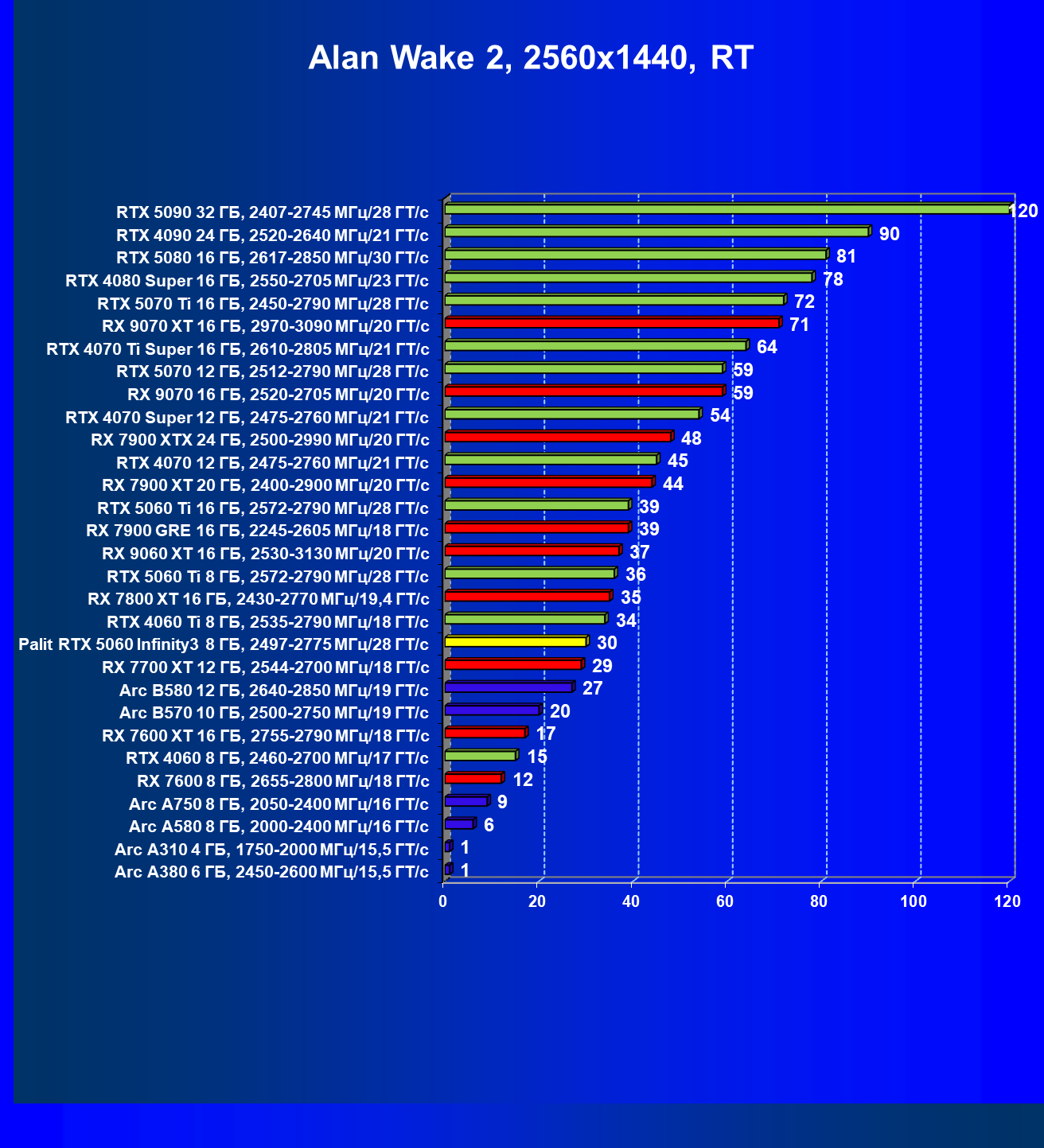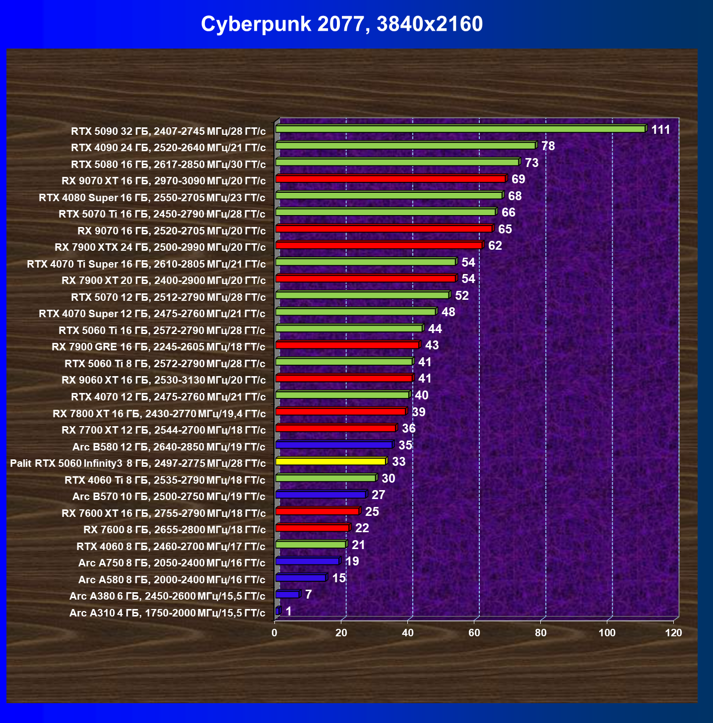 | 01 | Palit RTX 5060 Infinity3 8 ГБ, 2497—2775 МГц/28 ГТ/с | 176 | 582 | 33 000 |