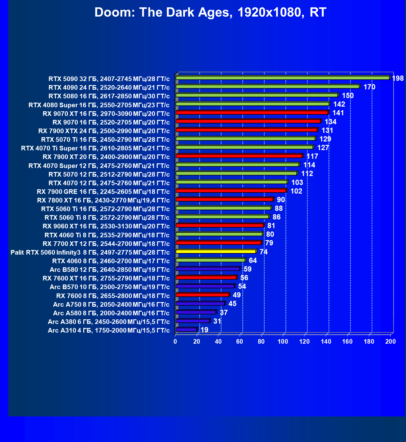 | 05 | RX 9060 XT 16 ГБ, 2530—3130 МГц/20 ГТ/с | 288 | 1210 | 42 000 |