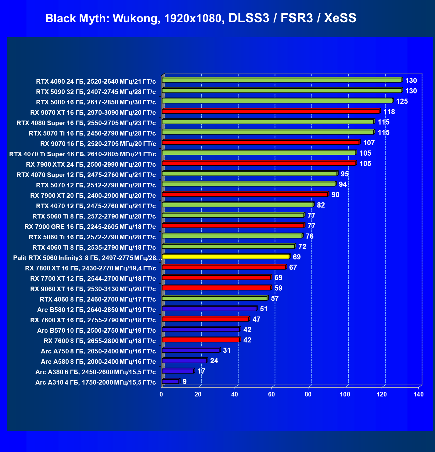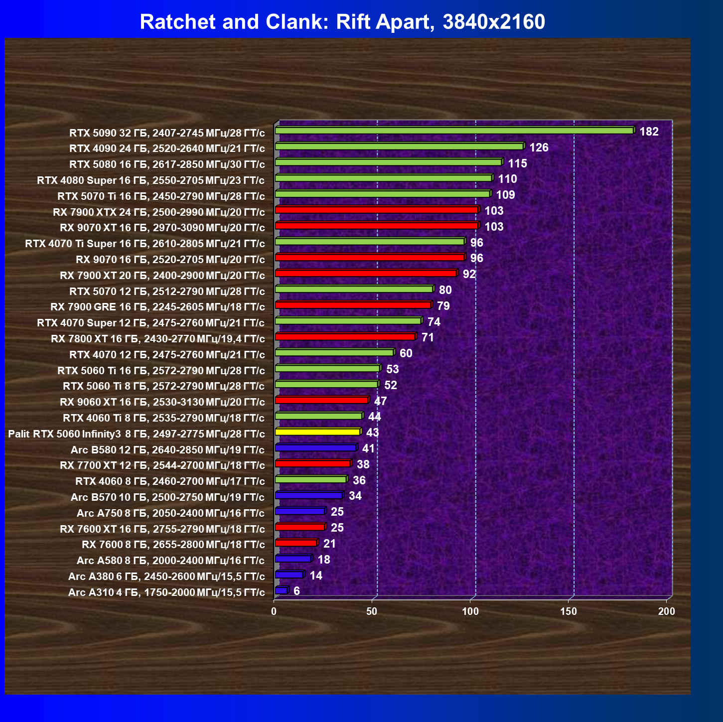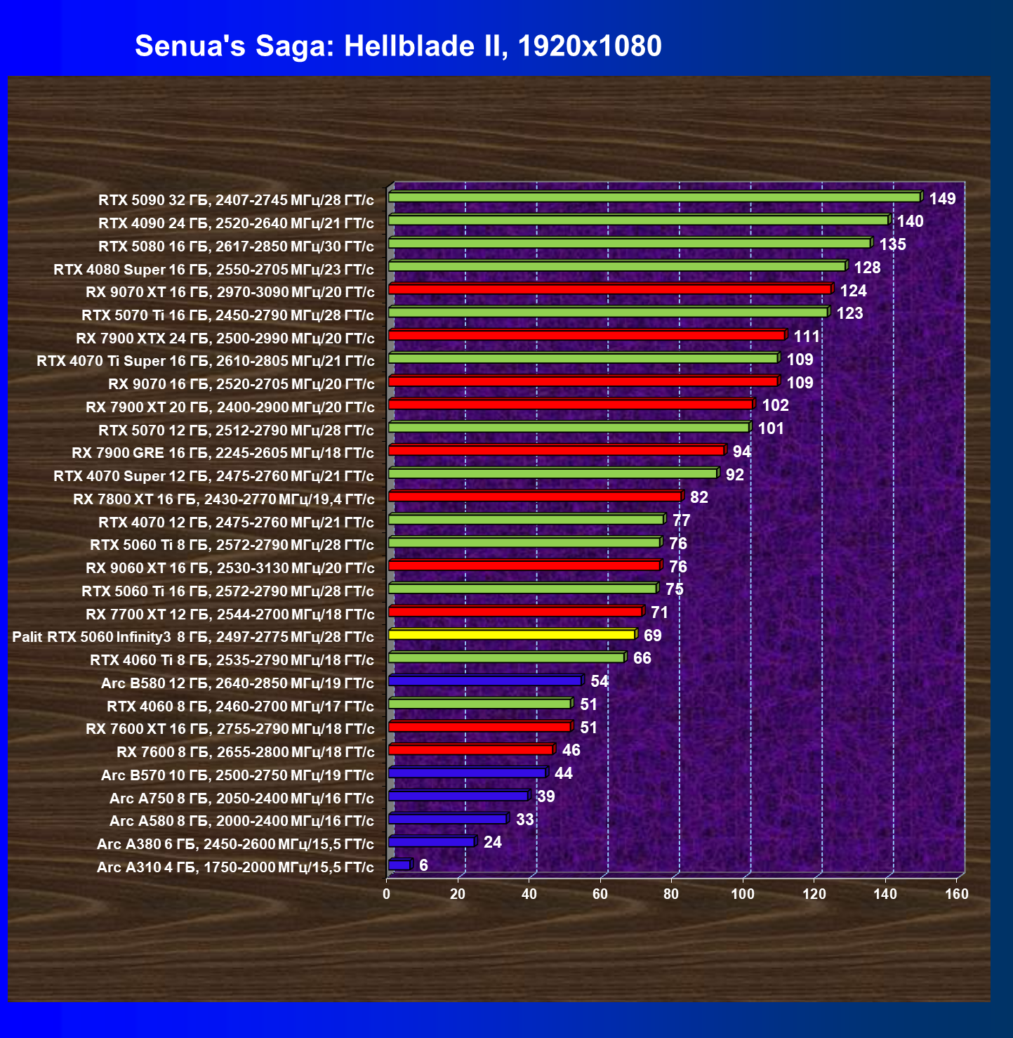 В данном рейтинге учитываются только результаты в играх без включения RT и DLSS, в целом в классических играх RTX 5060 в целом, и карта Palit в частности, смотрится очень хорошо!