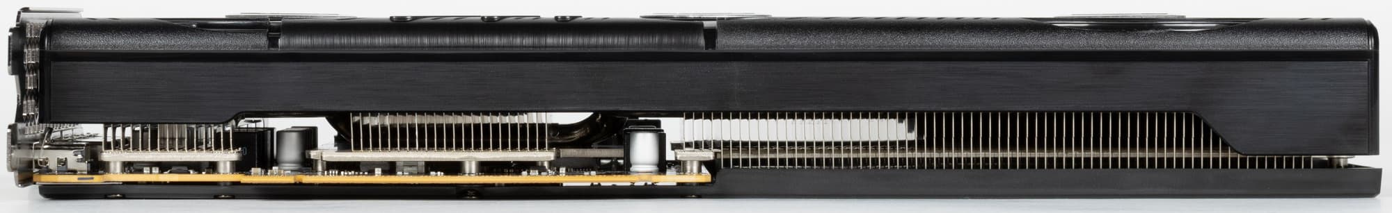 Длина кулера значительно больше длины печатной платы, правый вентилятор продувает радиатор насквозь в хвостовой части карты.