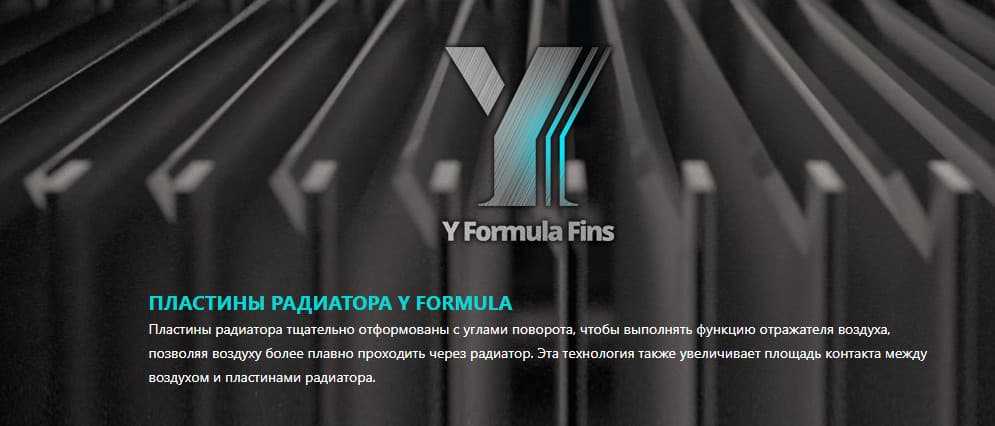 Пластины радиатора выполнены по формуле Y Formula Fins. В зависимости от расположения в радиаторе пластины имеют разные углы наклона, улучшая прохождение воздушного потока. Эта технология также увеличивает площадь поверхности ребер для более эффективного рассеивания тепла.