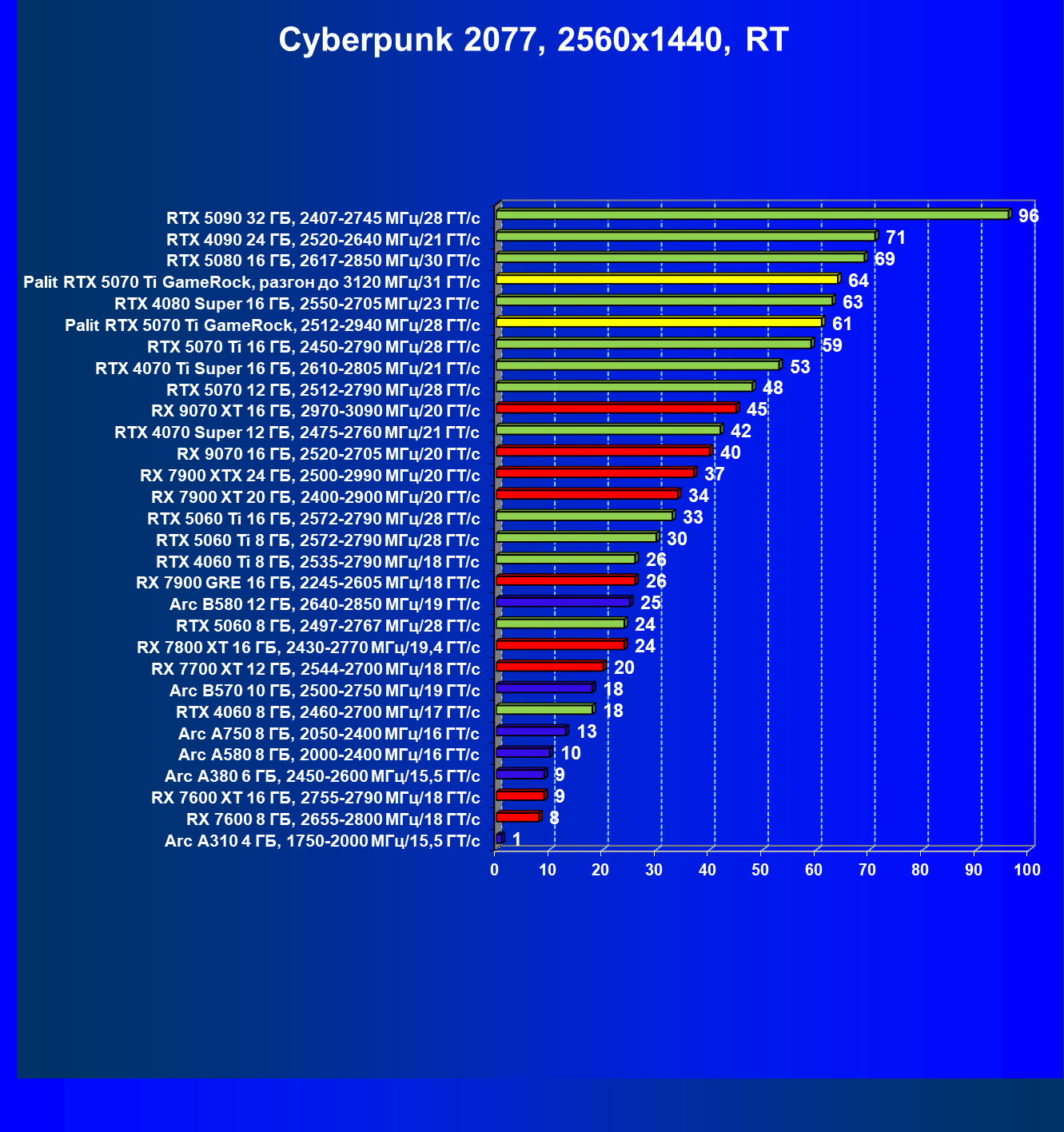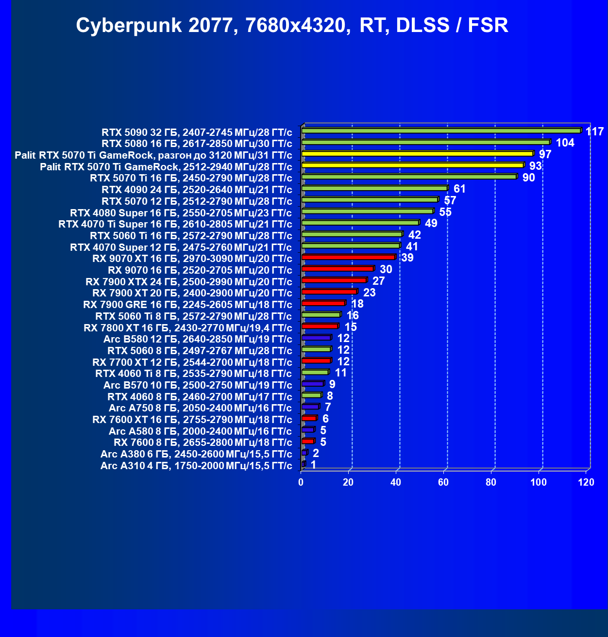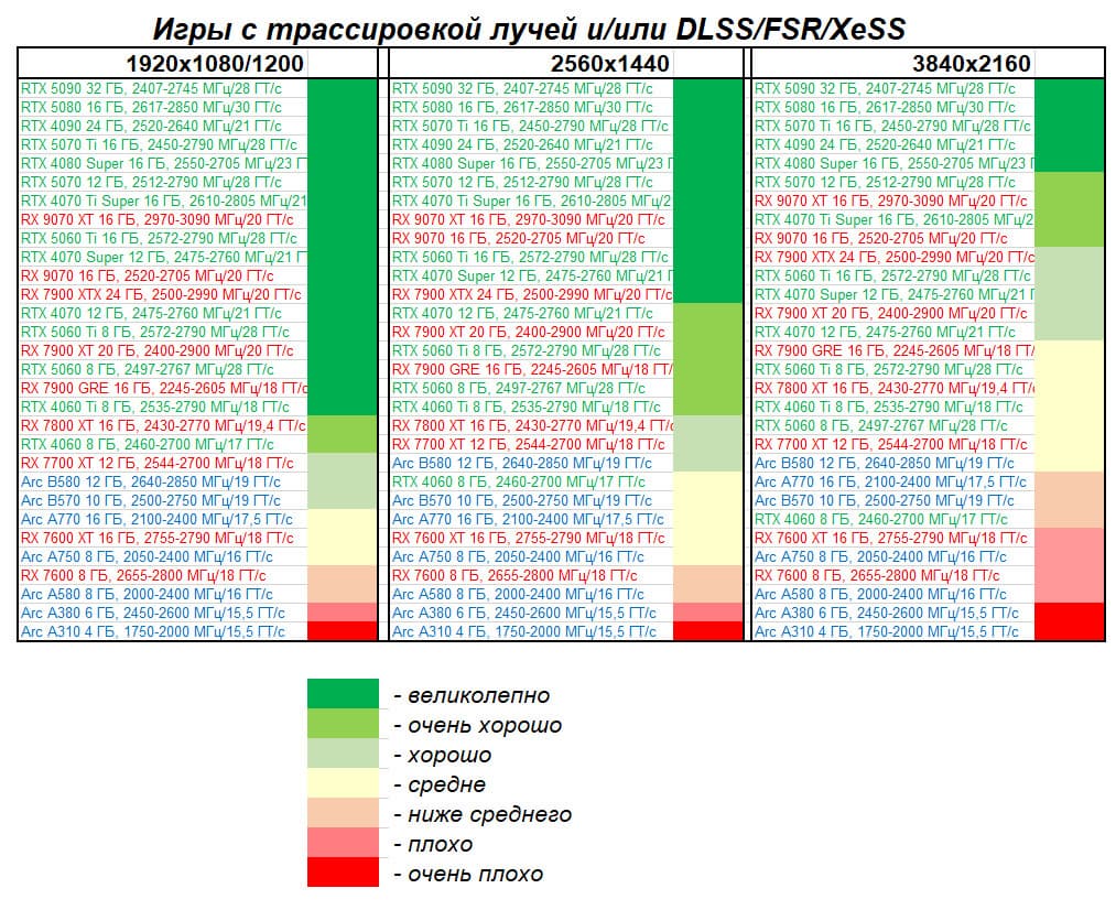 | 09 | RX 9070 XT 16 ГБ, 2970—3090 МГц/20 ГТ/с | 7679 | 960 | 80 000 |