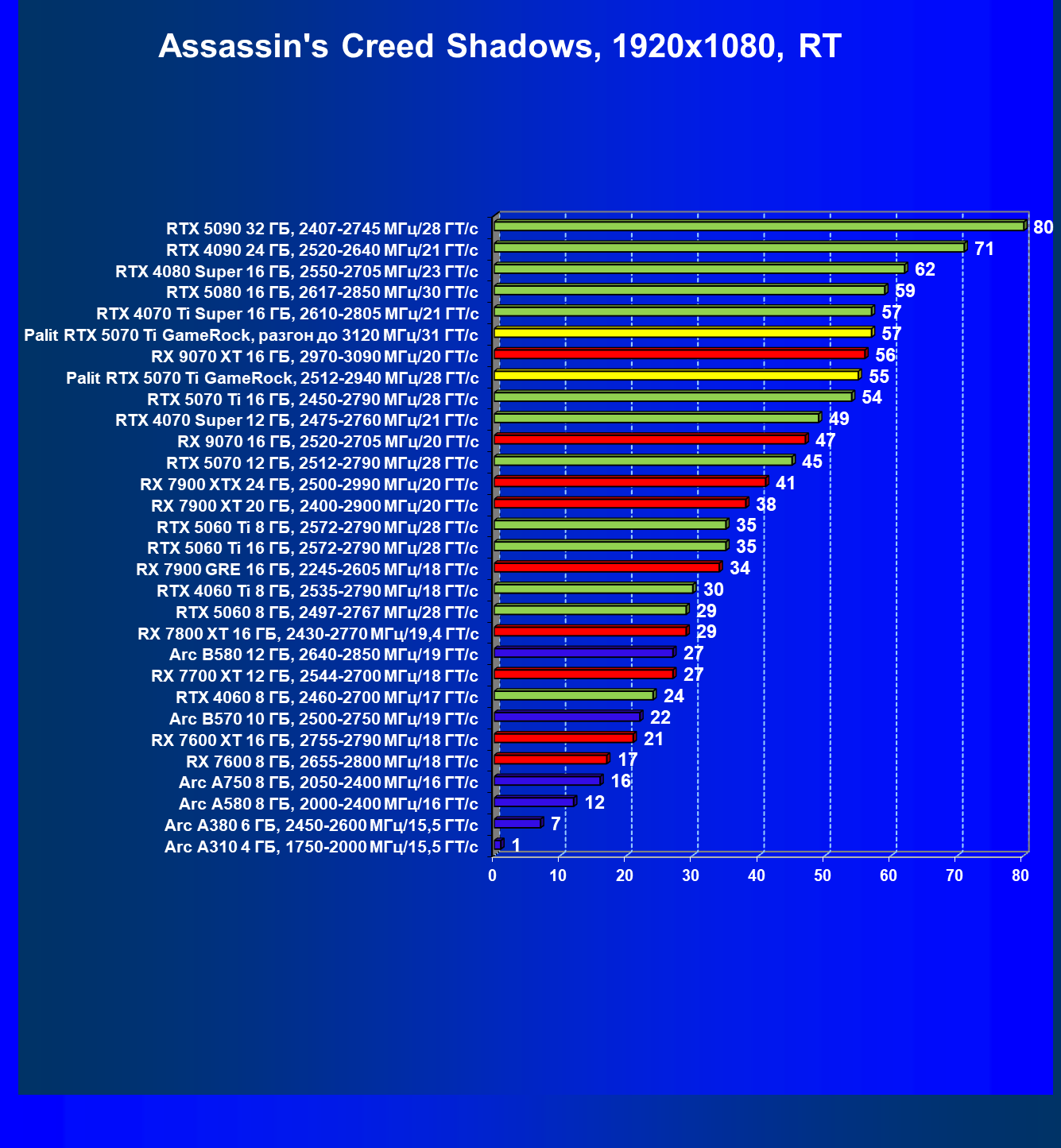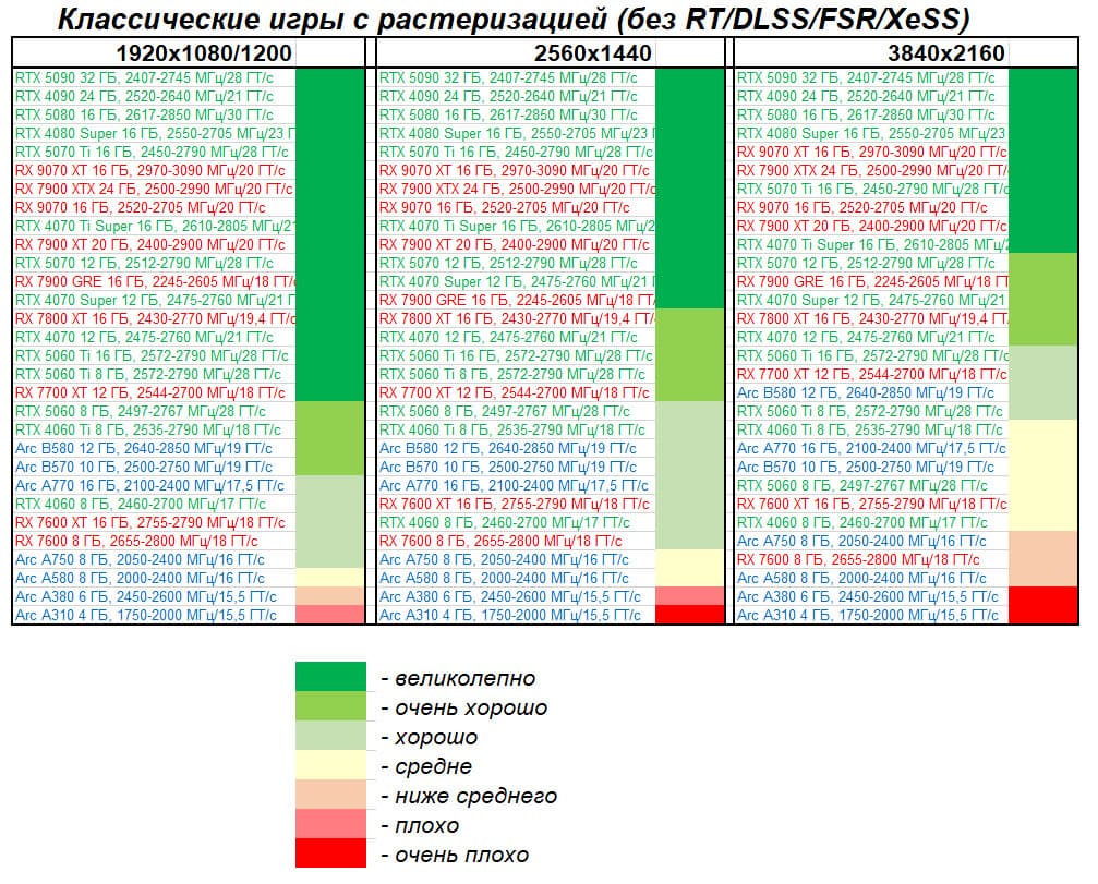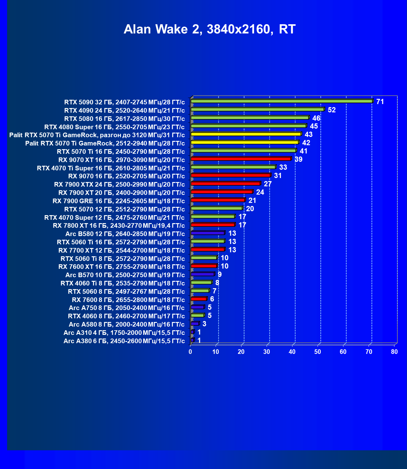 | 09 | RX 9070 XT 16 ГБ, 2970—3090 МГц/20 ГТ/с | 7679 | 960 | 80 000 |