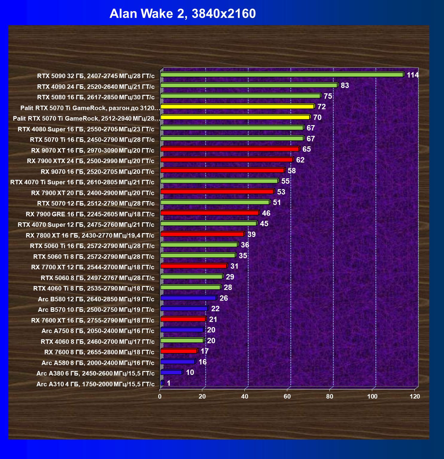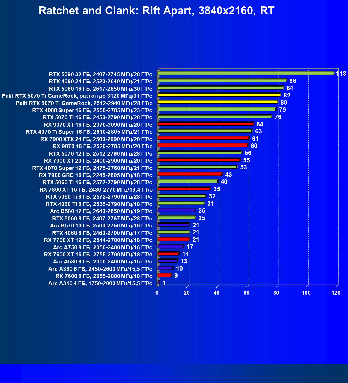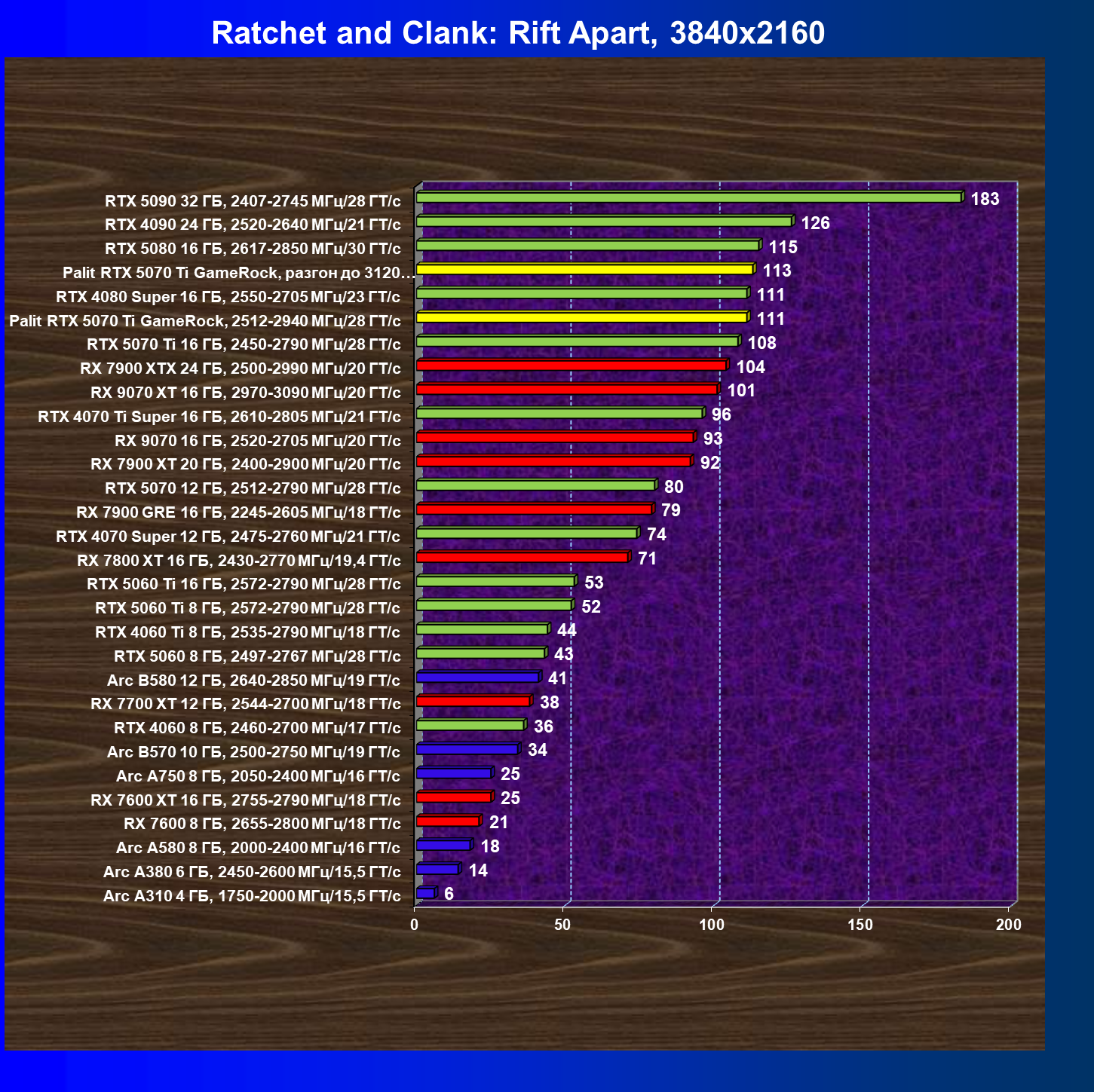 | 07 | Palit RTX 5070 Ti GameRock, 2512—2940 МГц/28 ГТ/с | 602 | 5175 | 86 000 |