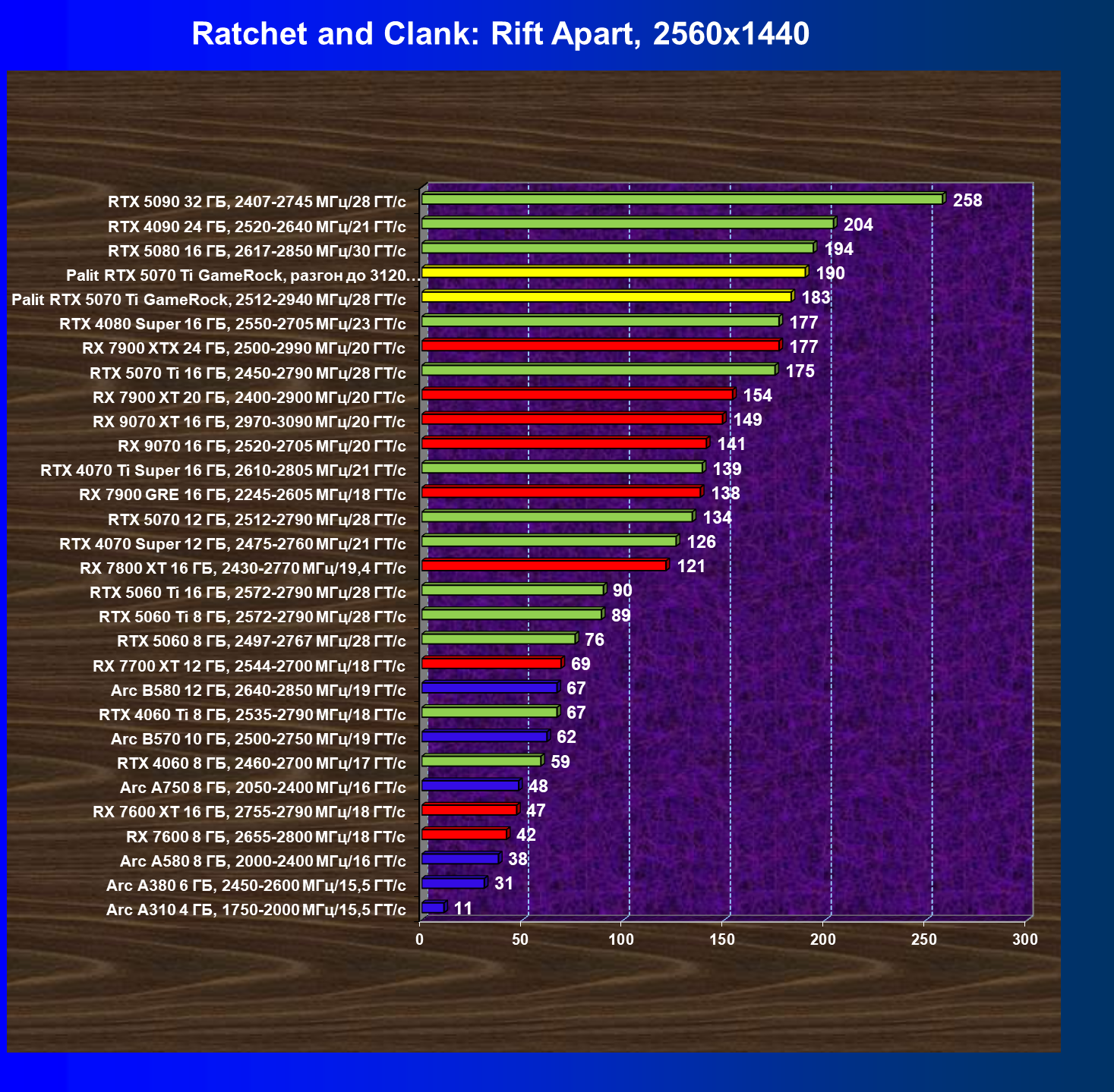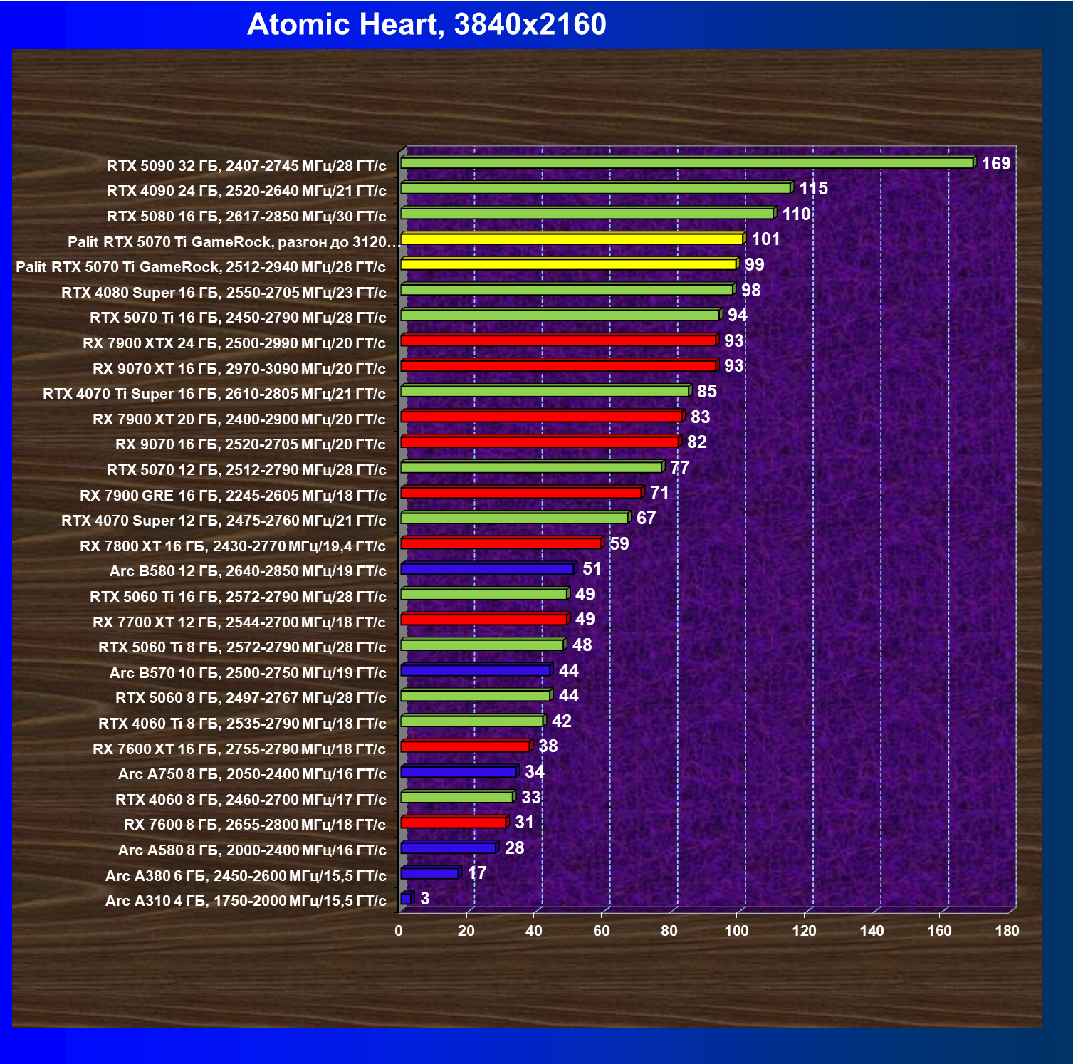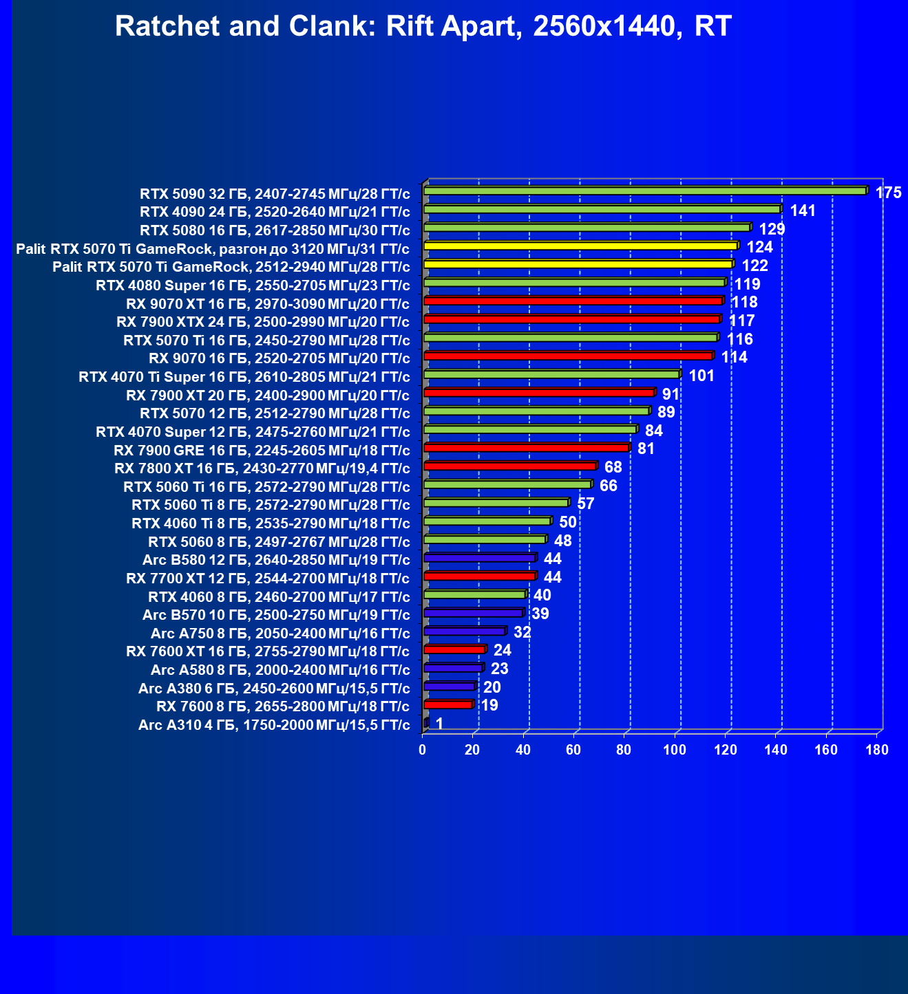 | 07 | Palit RTX 5070 Ti GameRock, 2512—2940 МГц/28 ГТ/с | 602 | 5175 | 86 000 |