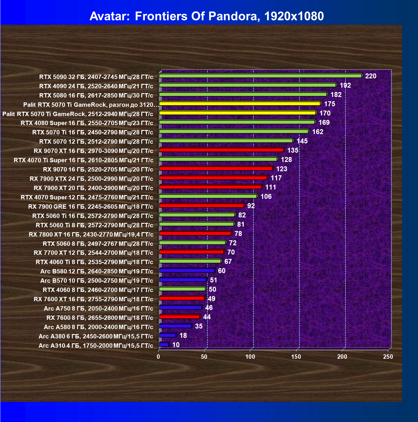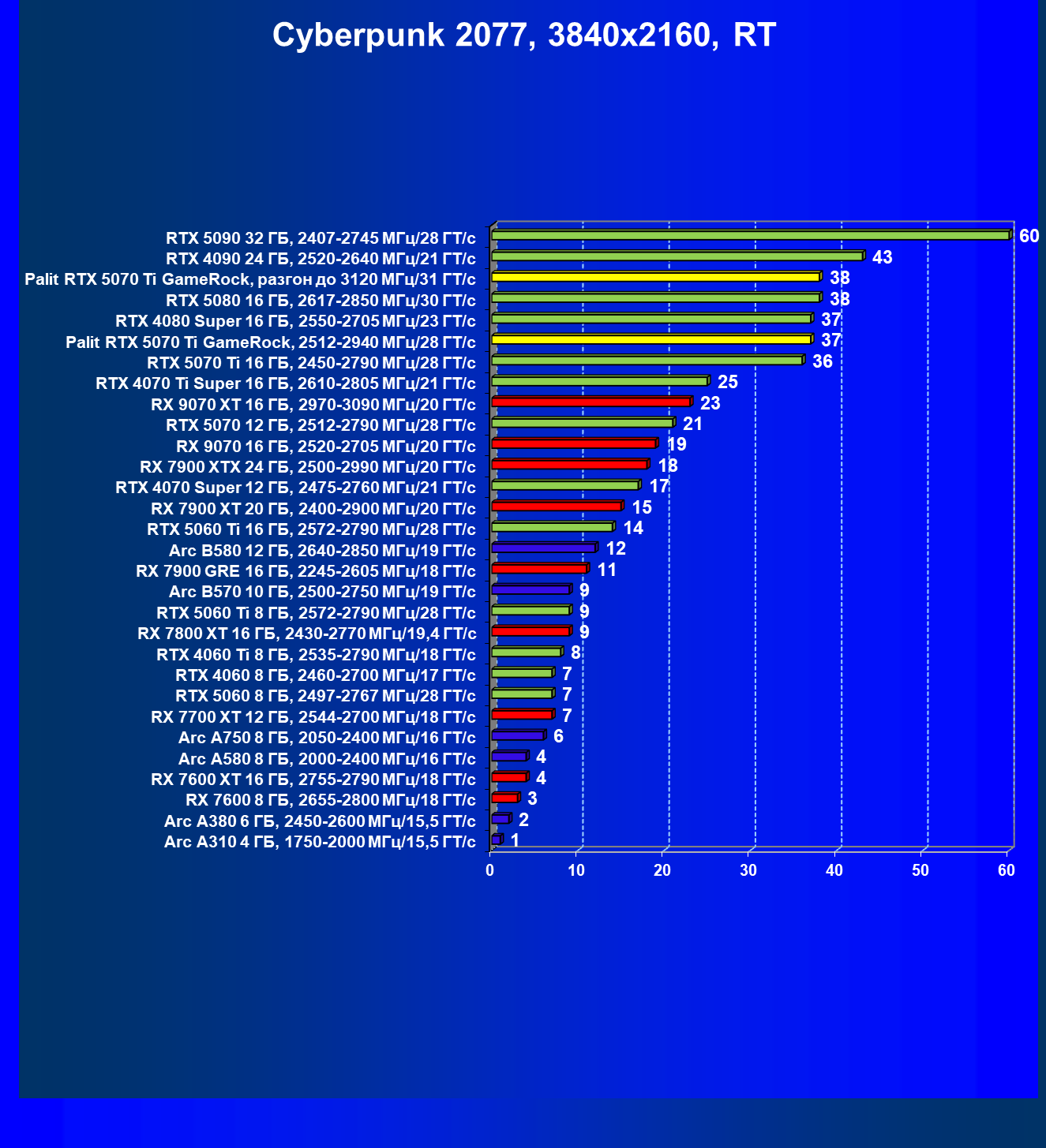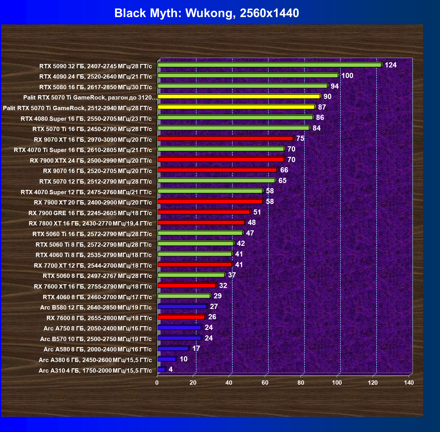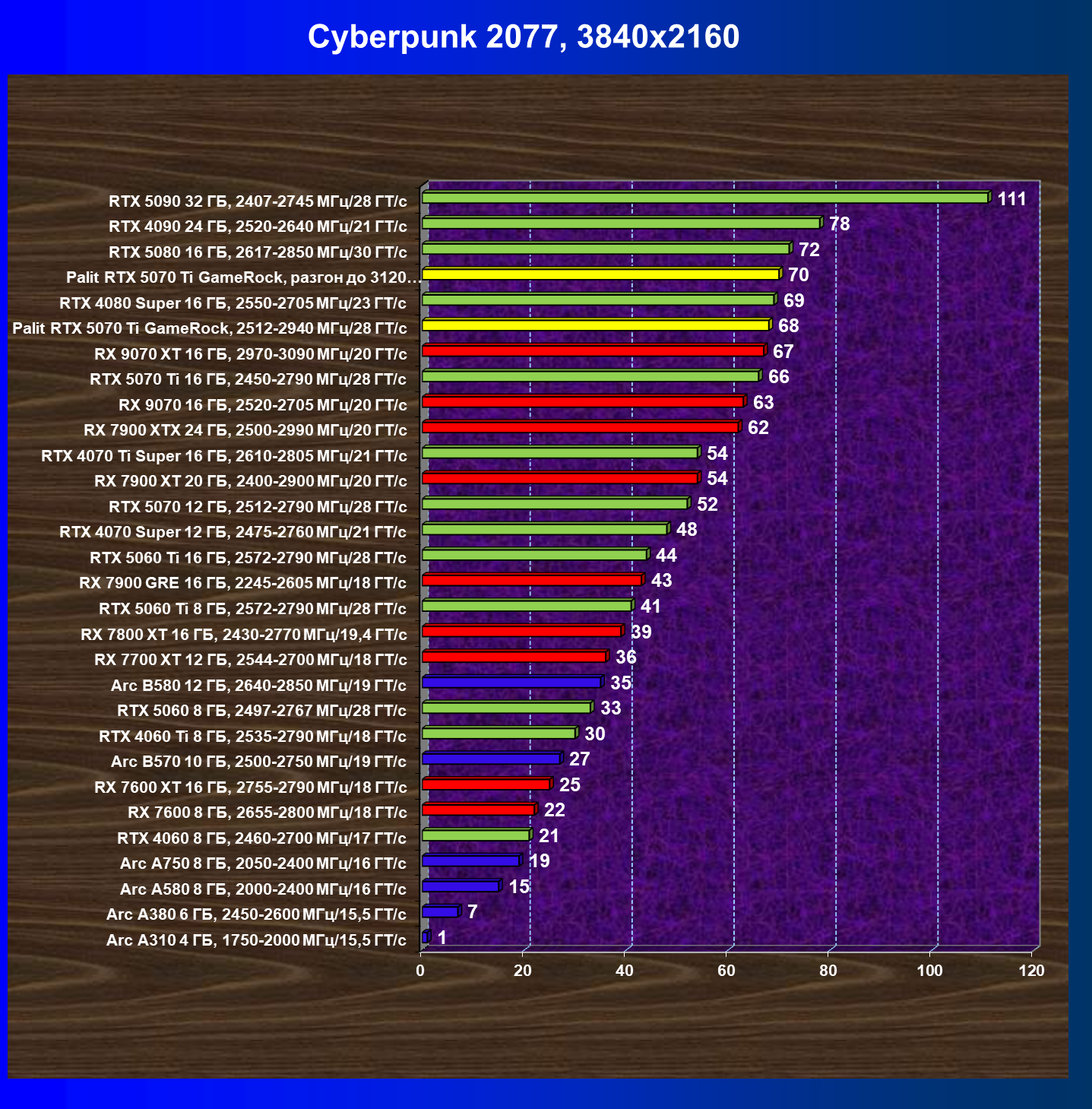 | 06 | Palit RTX 5070 Ti GameRock, разгон до 3120 МГц/31 ГТ/с | 618 | 5316 | 86 000 |
