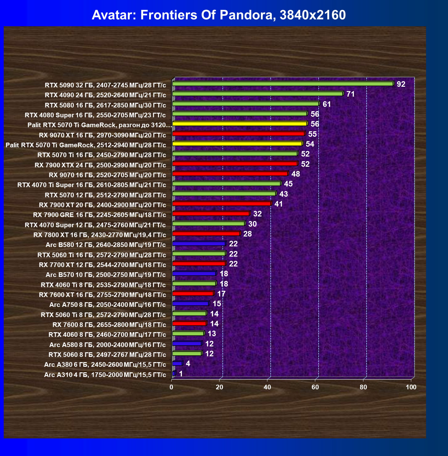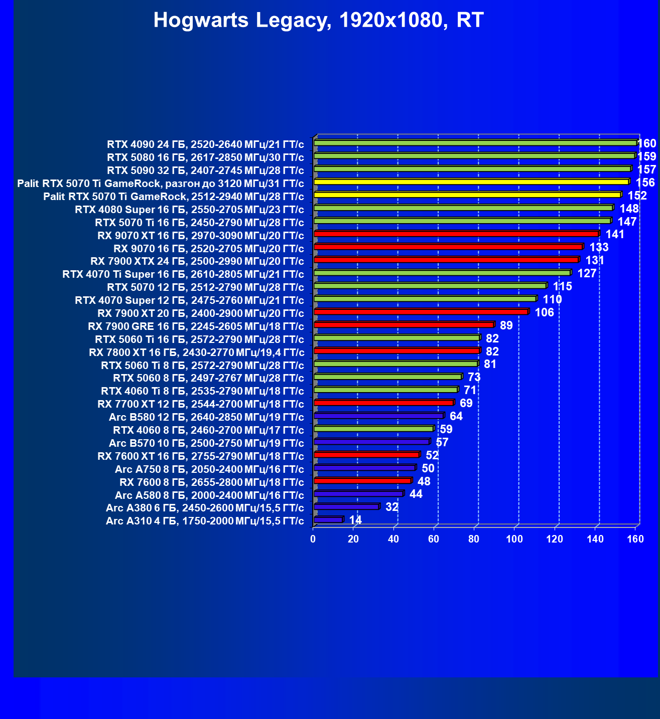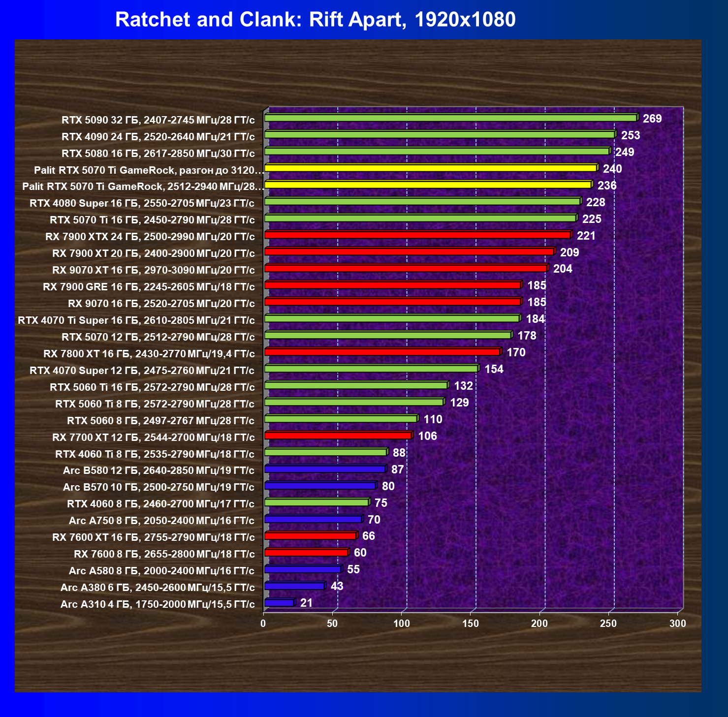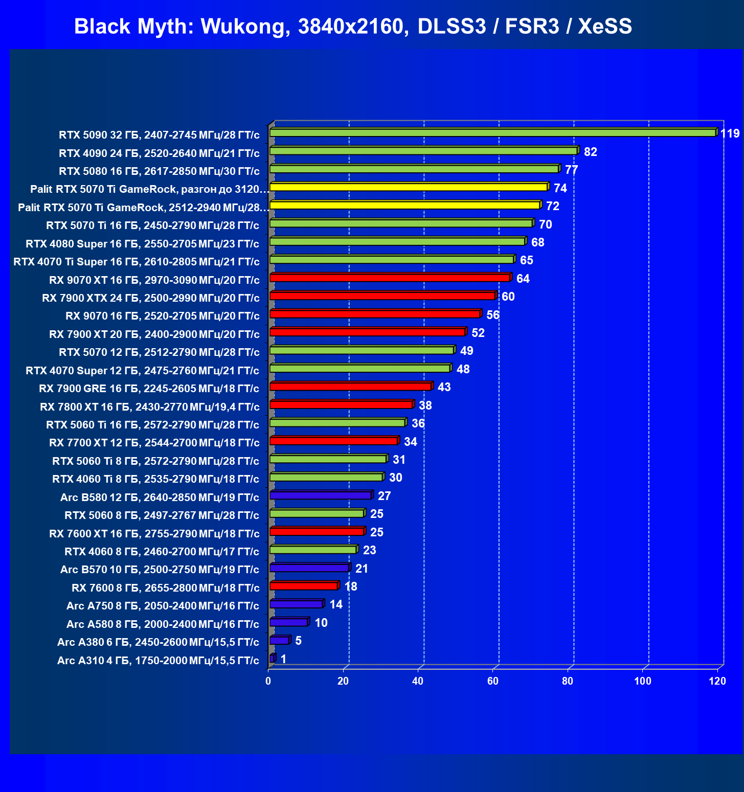 | 06 | Palit RTX 5070 Ti GameRock, разгон до 3120 МГц/31 ГТ/с | 618 | 5316 | 86 000 |