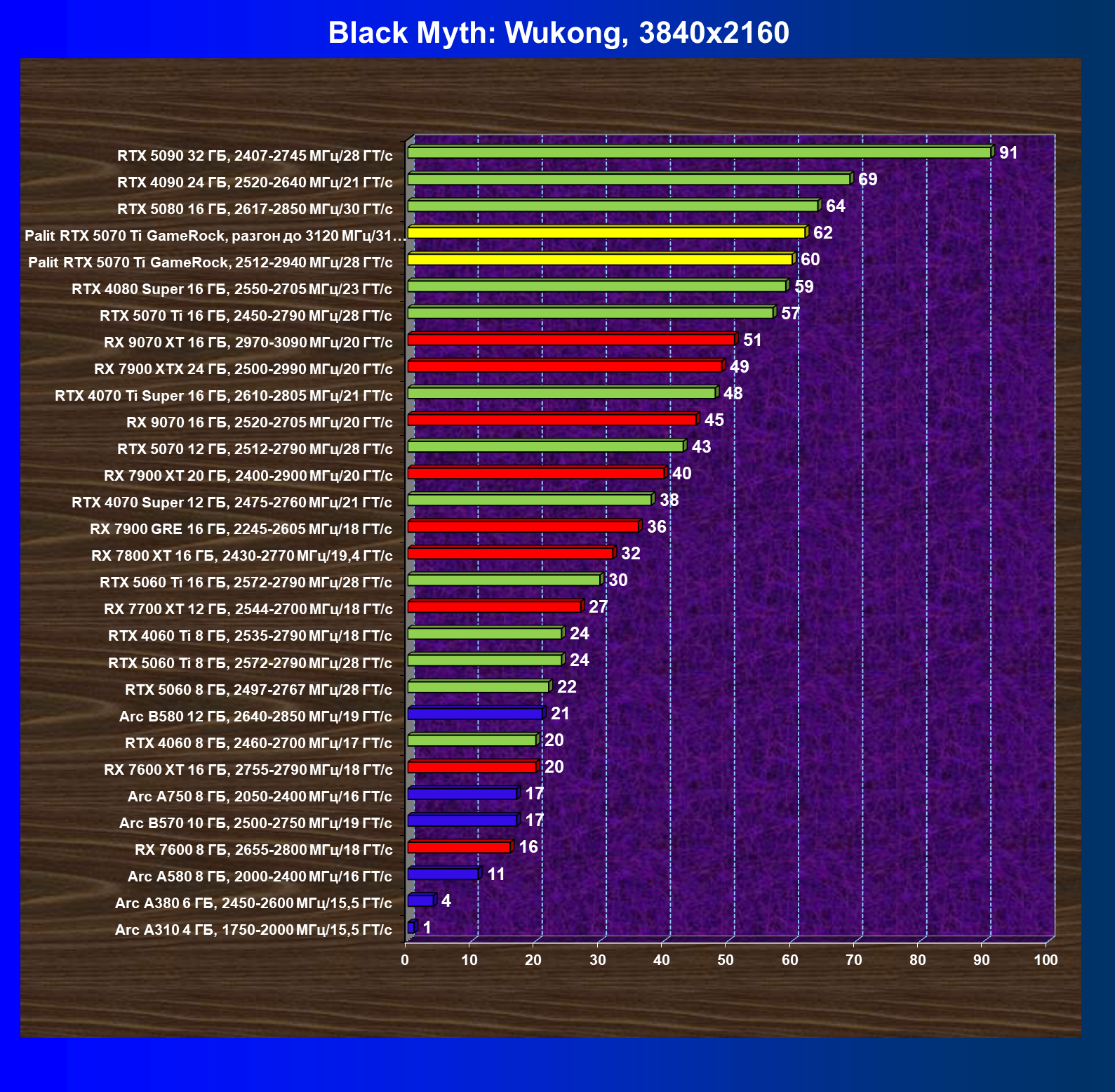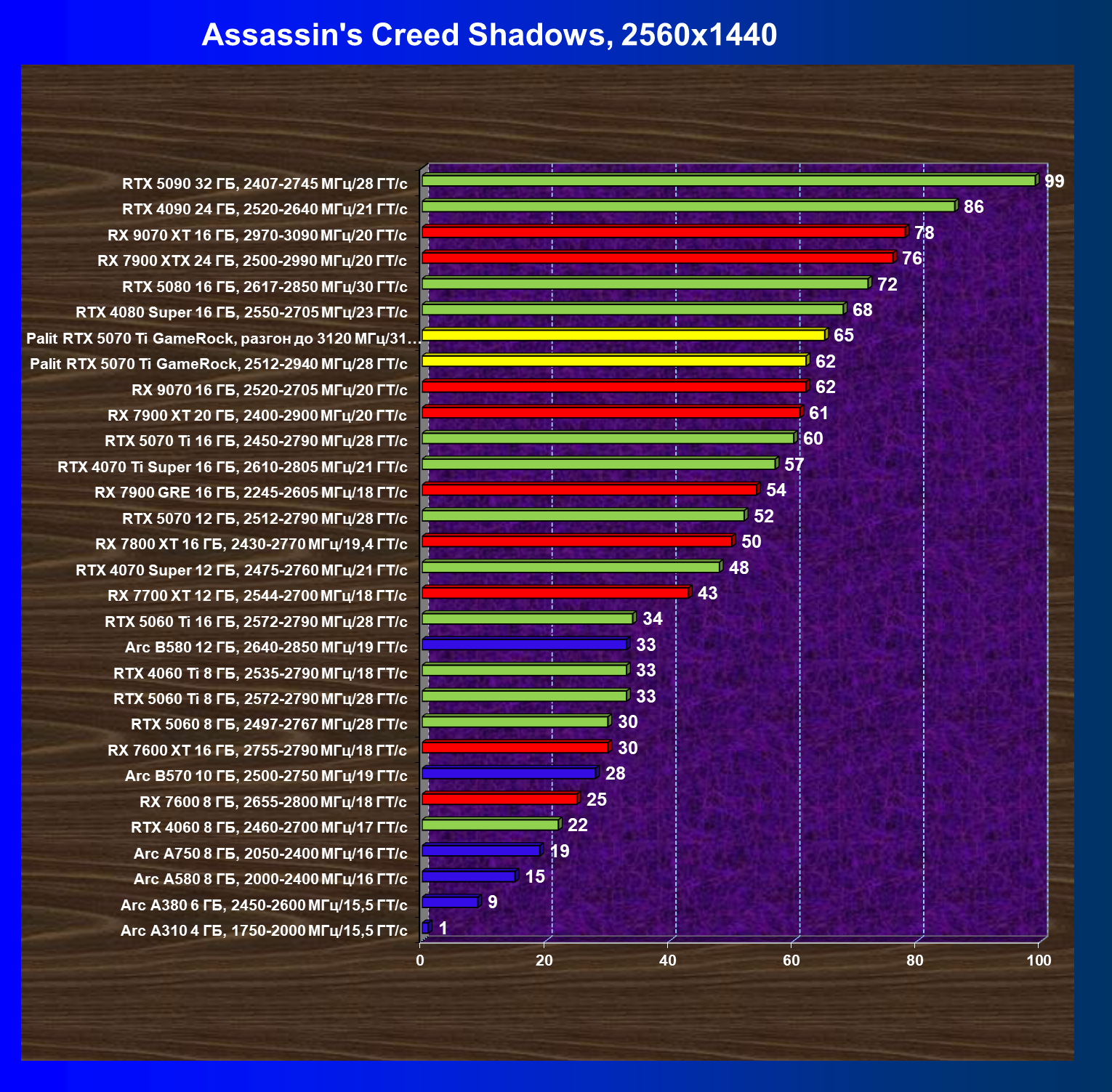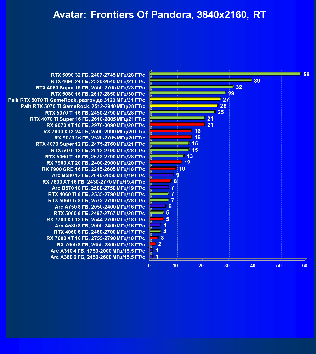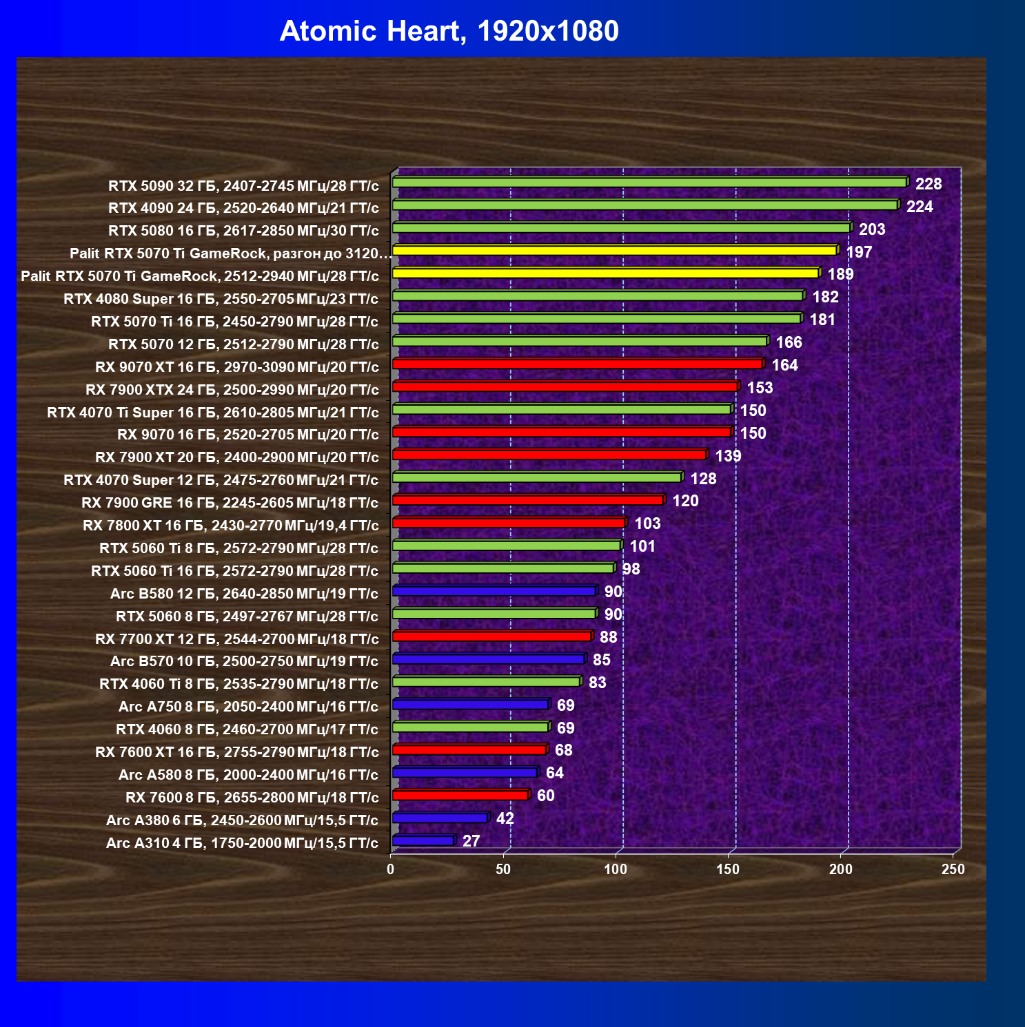 | 06 | Palit RTX 5070 Ti GameRock, разгон до 3120 МГц/31 ГТ/с | 618 | 5316 | 86 000 |