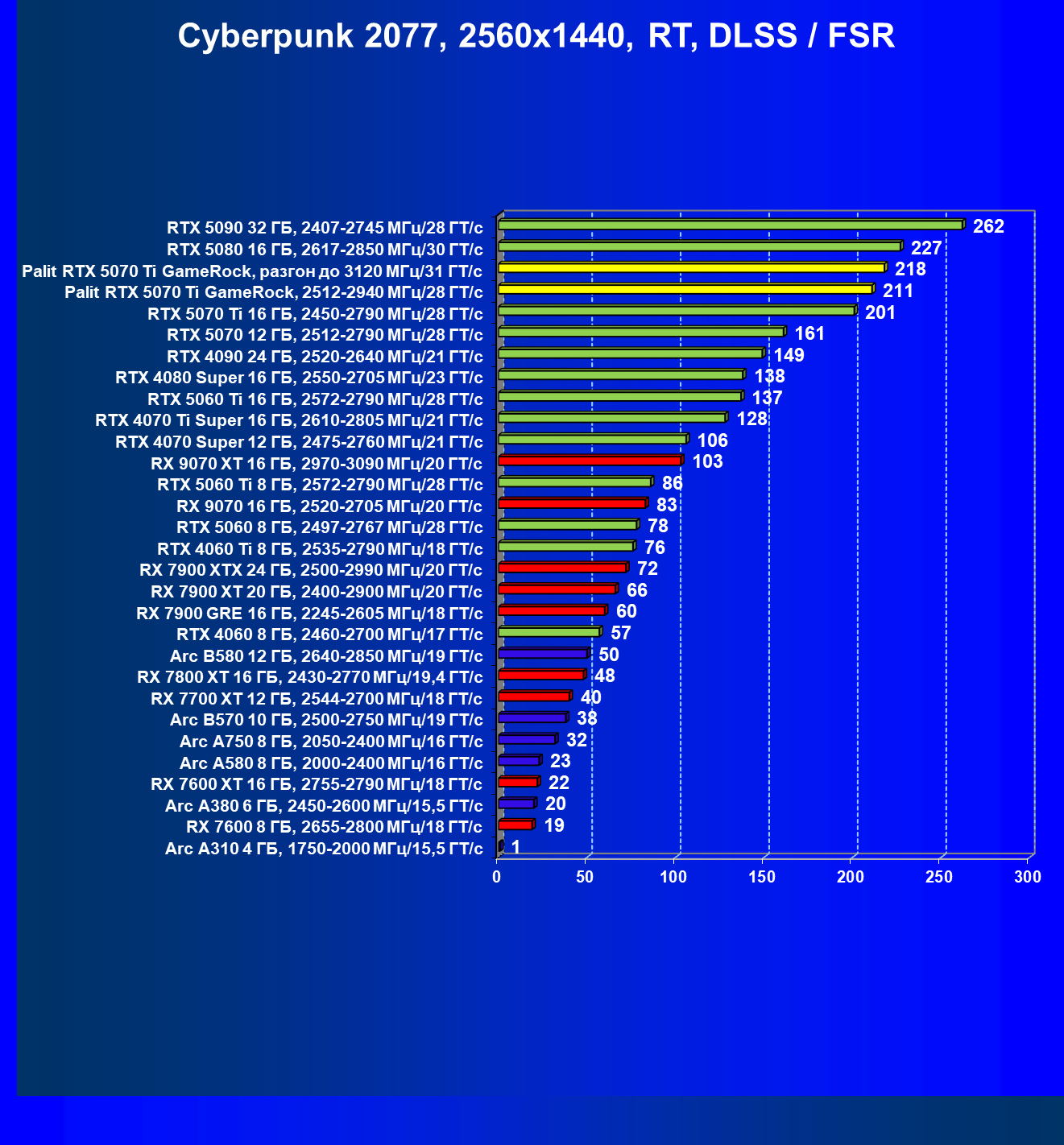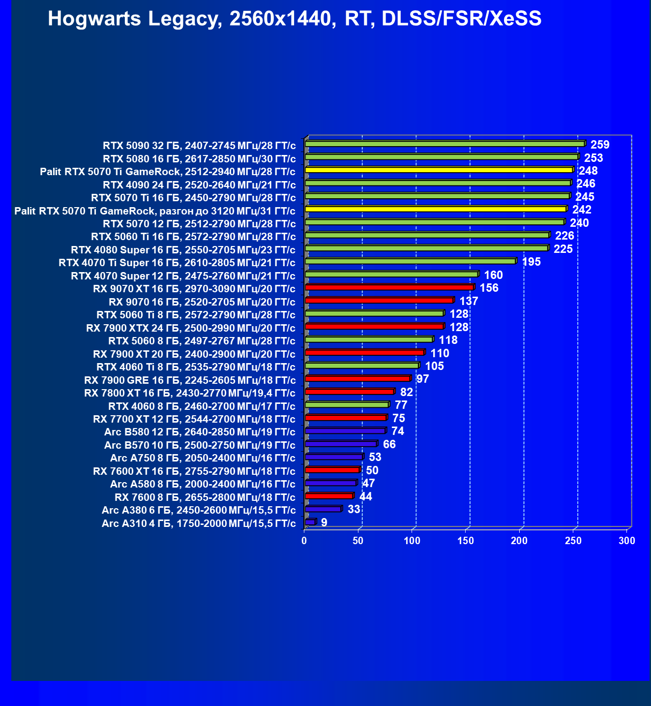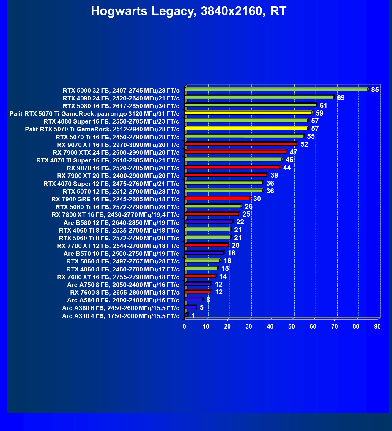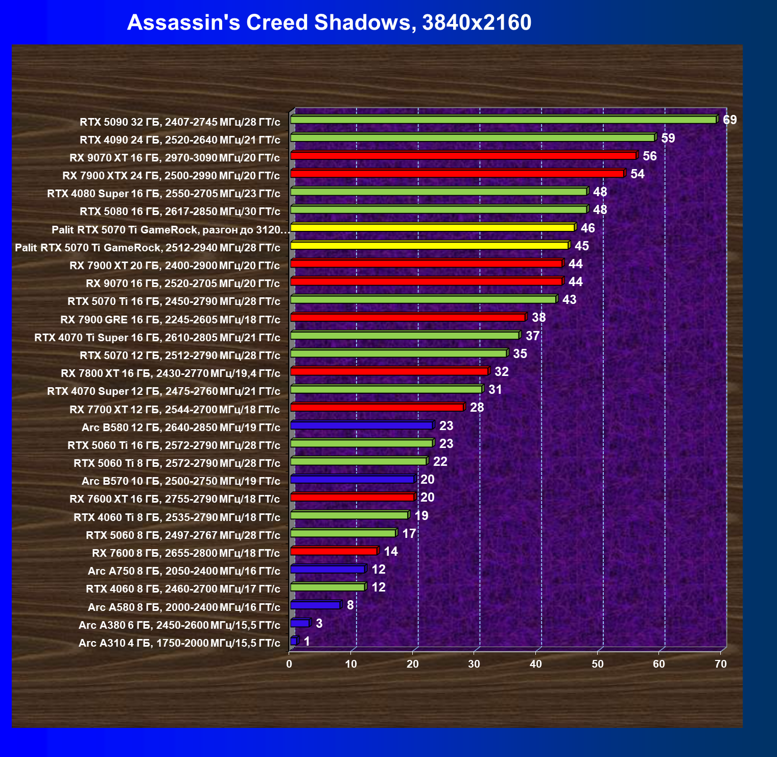 | 06 | Palit RTX 5070 Ti GameRock, разгон до 3120 МГц/31 ГТ/с | 618 | 5316 | 86 000 |