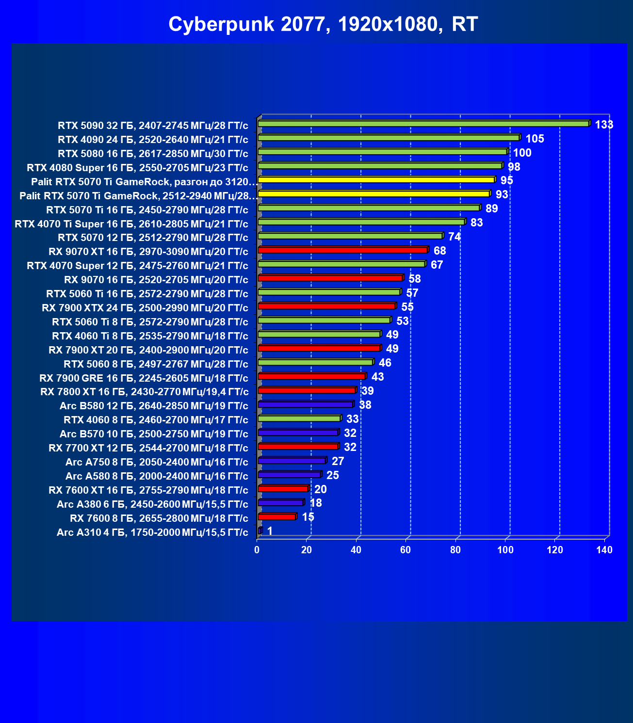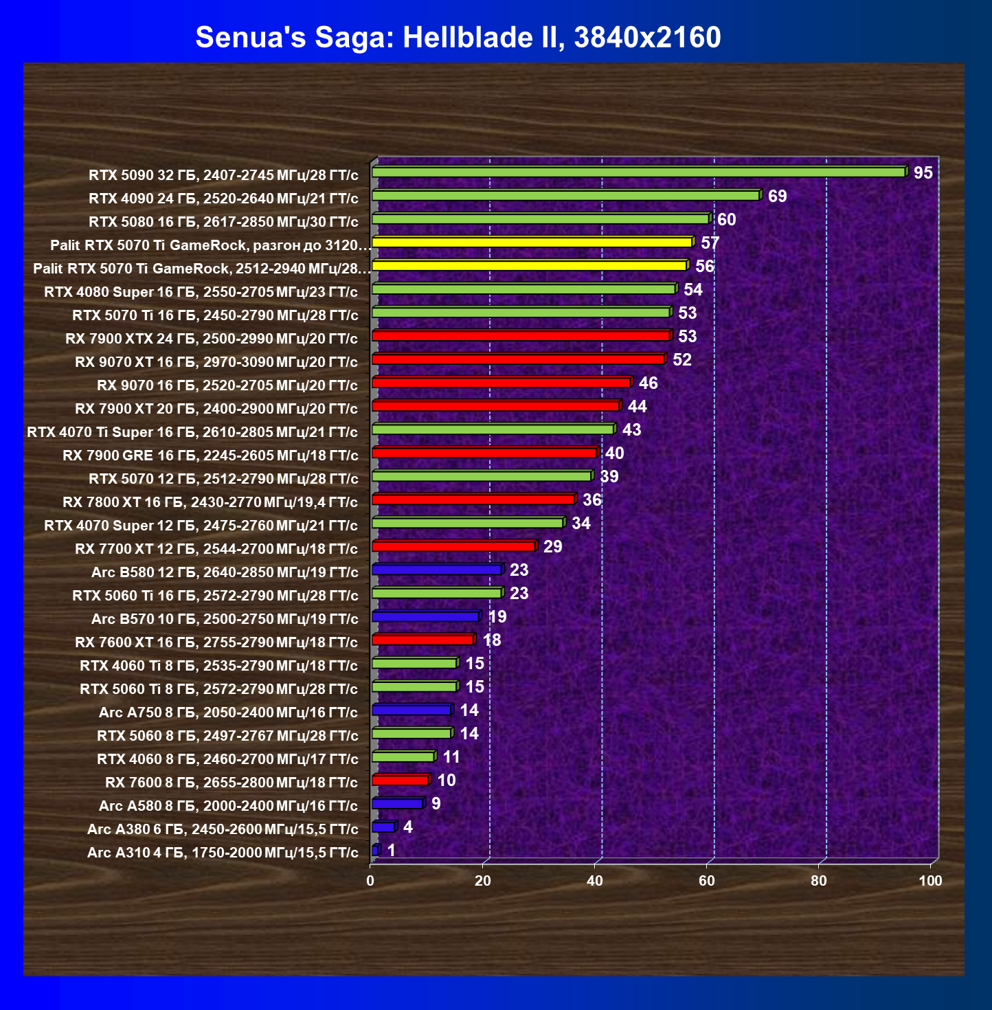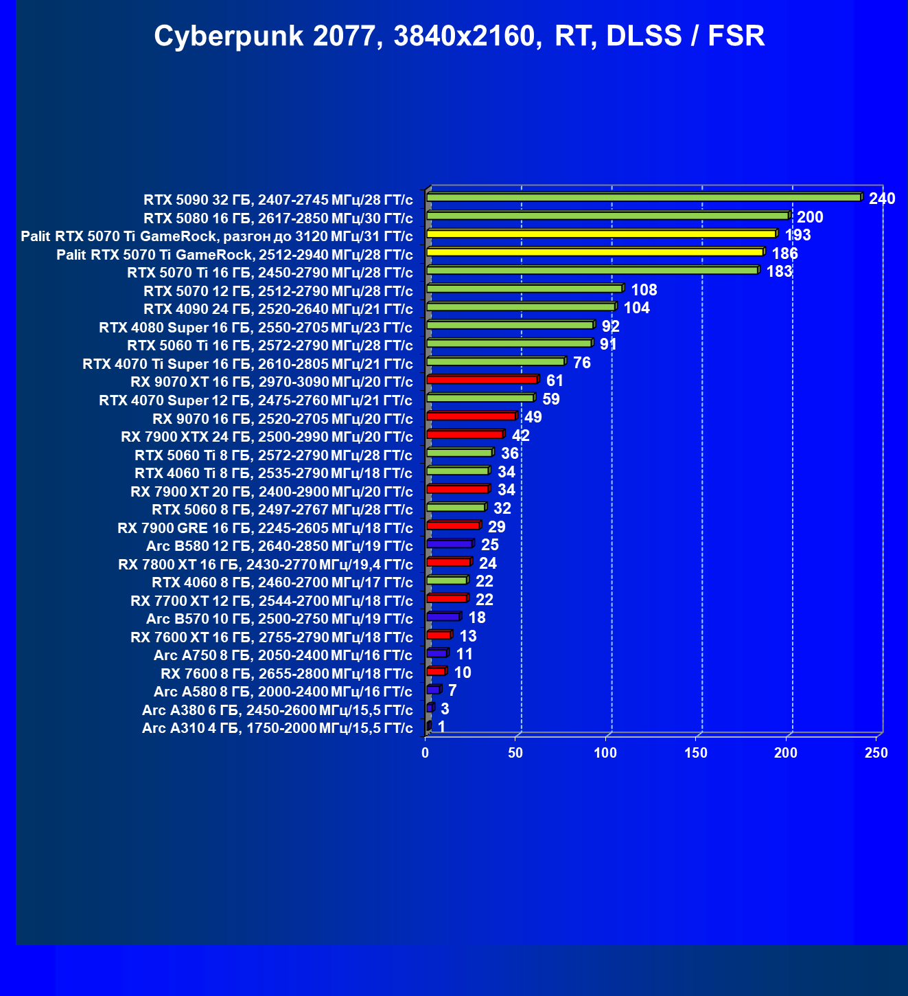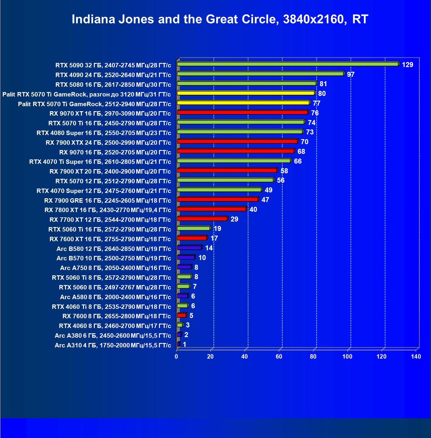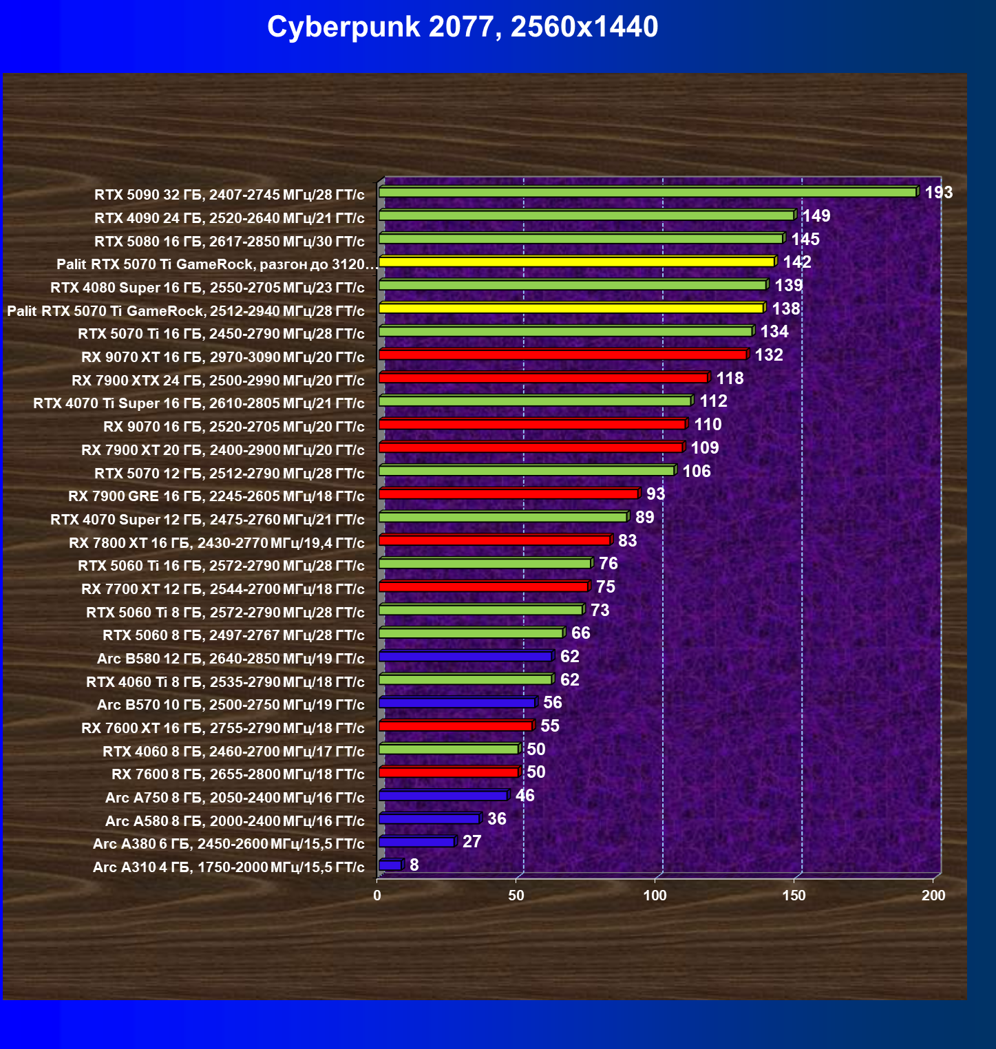 | 08 | RTX 5070 Ti 16 ГБ, 2450—2790 МГц/28 ГТ/с | 578 | 4967 | 86 000 |