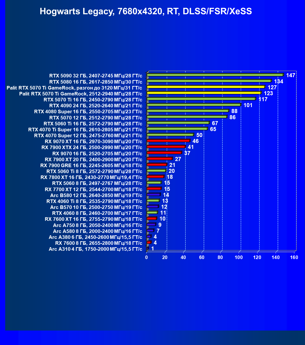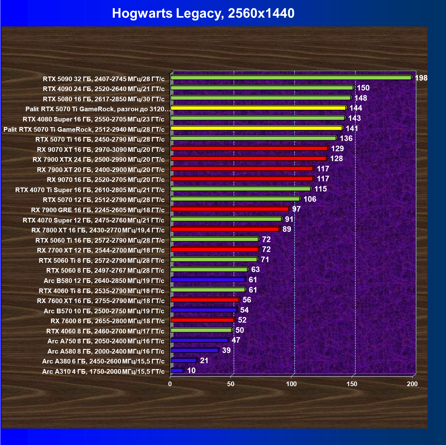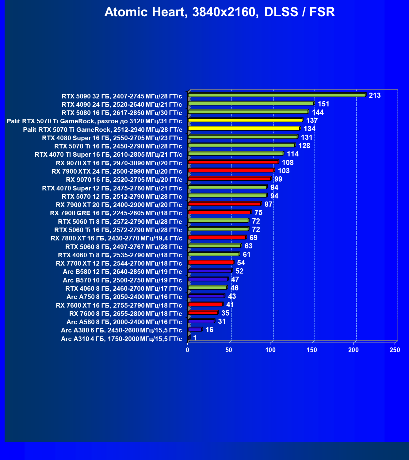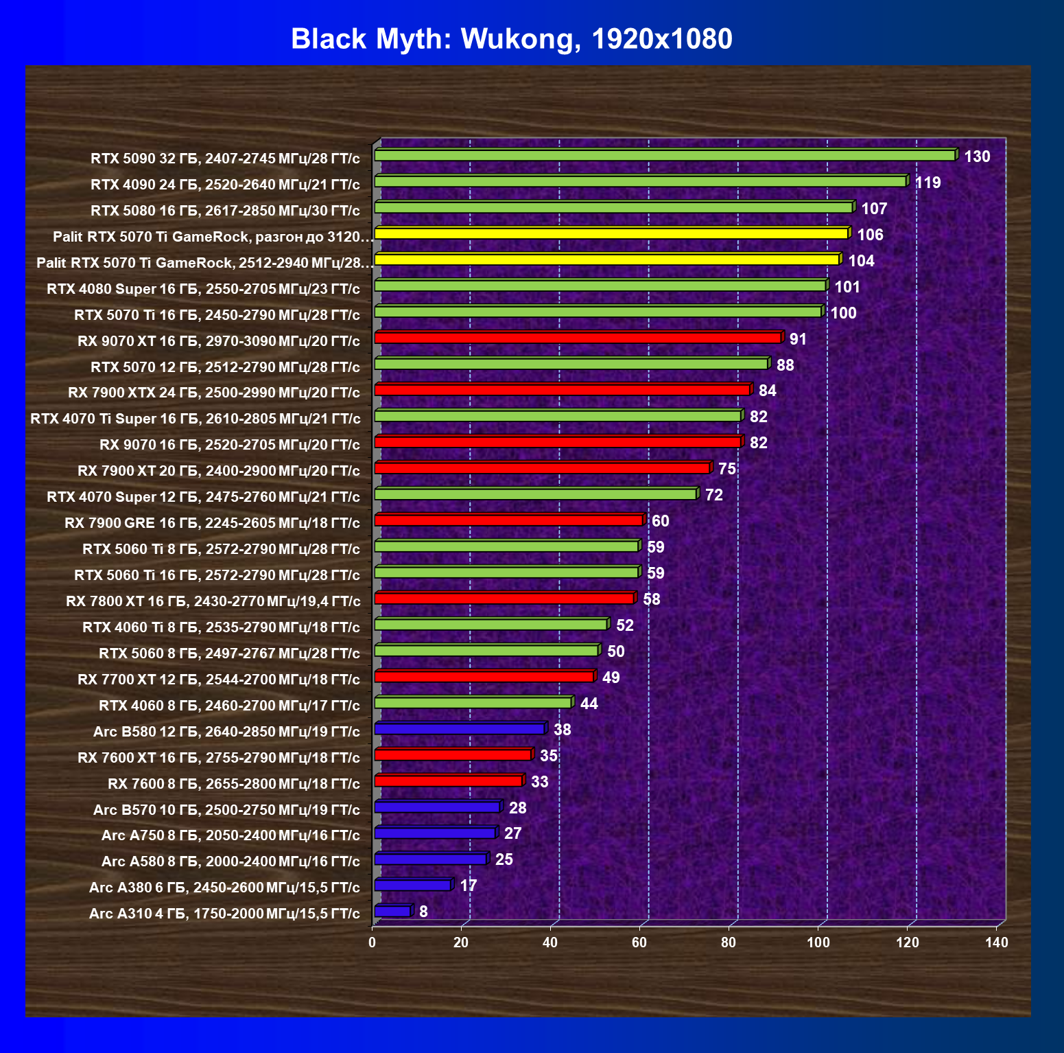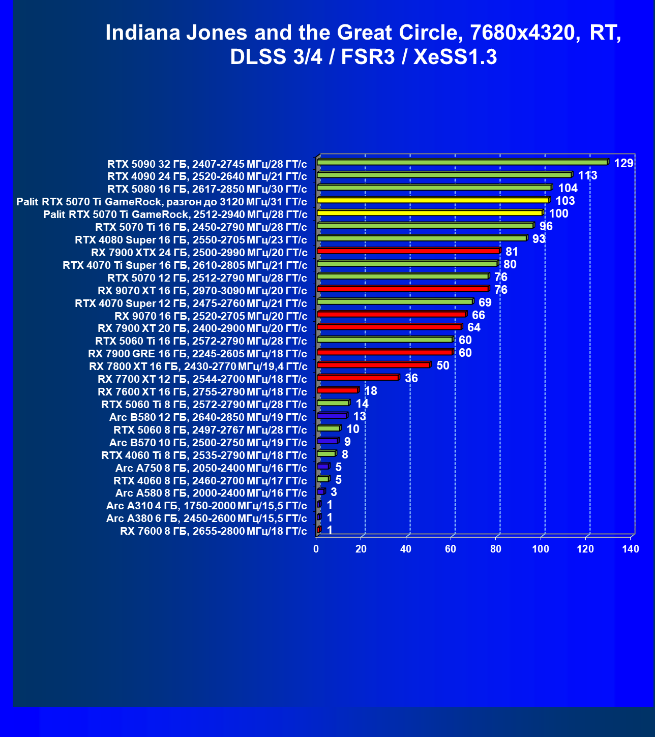 | 08 | RTX 5070 Ti 16 ГБ, 2450—2790 МГц/28 ГТ/с | 578 | 4967 | 86 000 |