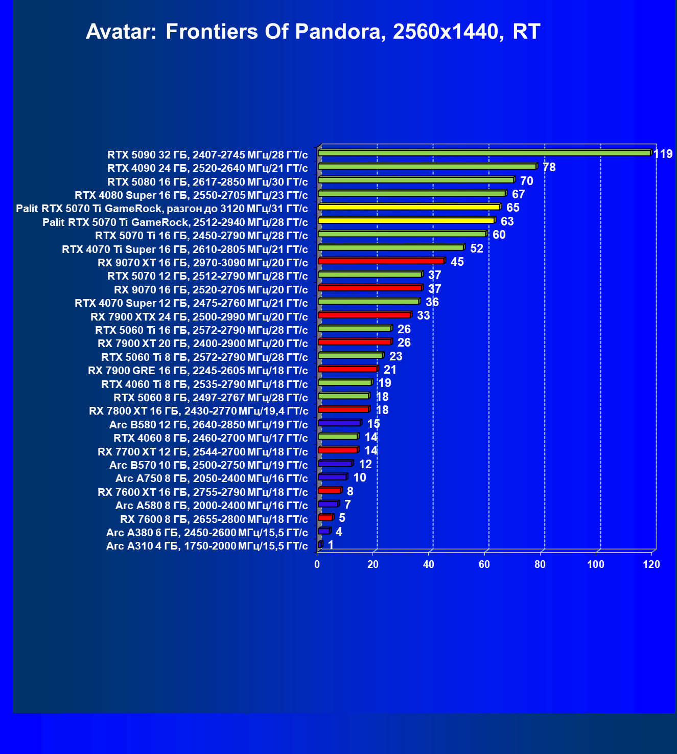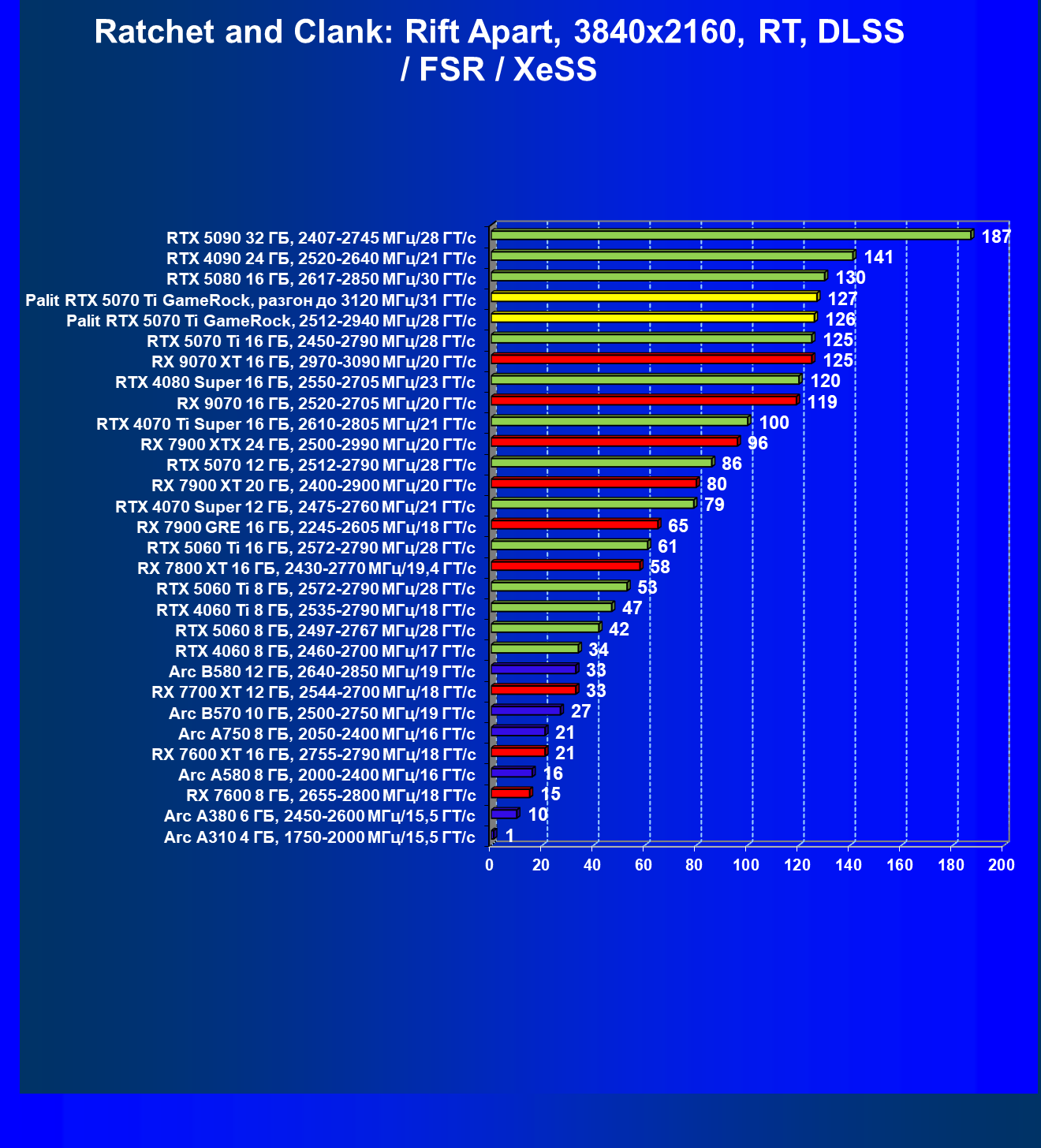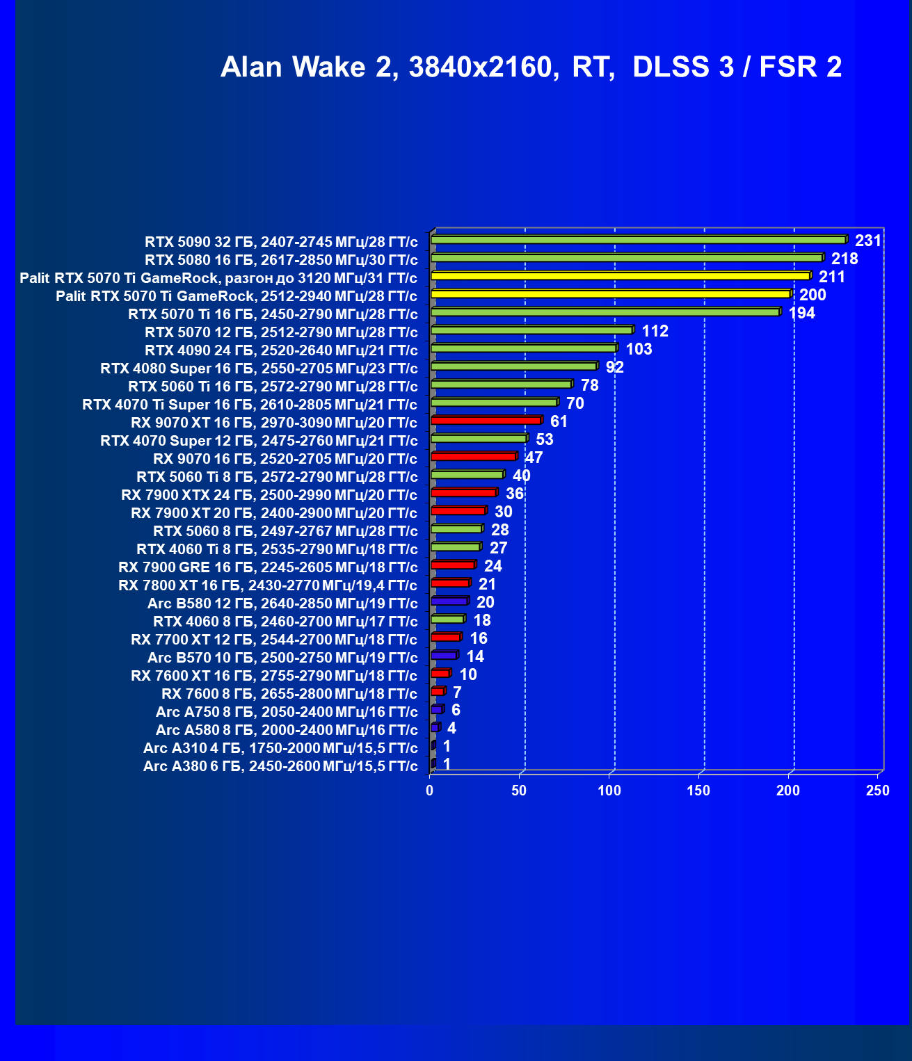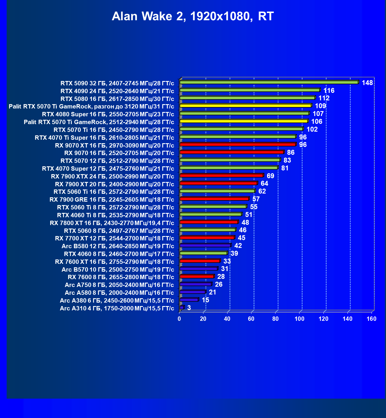 | 08 | RTX 5070 Ti 16 ГБ, 2450—2790 МГц/28 ГТ/с | 578 | 4967 | 86 000 |